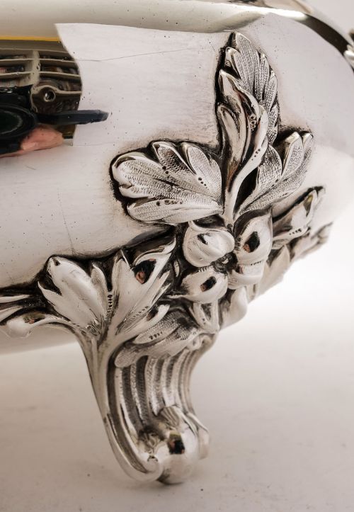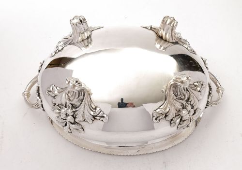 A nice large and deep English Victorian silver plated serving dish with nicely moulded handles to either end gadrooned decoration to the lip & stands on 4 fabulous leaf feet. Marked WH & S for the maker William Hutton & Sons. Circa 1890 FREE worldwide delivery. Measurements: Height: 6 1/2 (approx 16.5cm) Length to handles: 16 (approx 40.5cm) Length across top: 12 1/4 (approx 31cm) Width: 9 1/2 (approx 24cm) Weight: 3520g In good condition - any dark areas are shadows from the photography there is no damage to the silver plate.