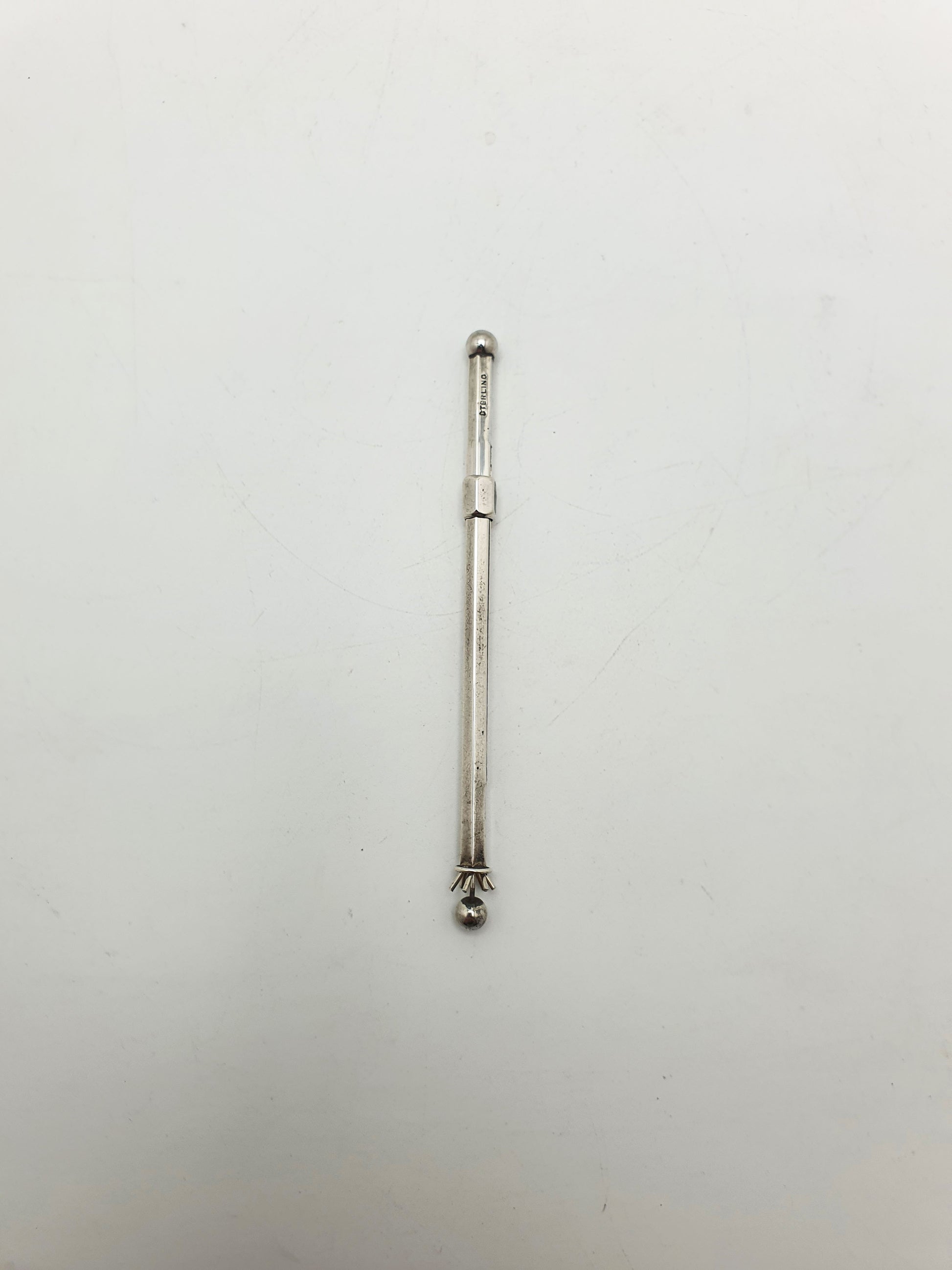 A Nice Vintage Sterling Silver Mechanical Swizzle Stick designed with a telescopic mechanism; this mid-century cocktail accessory features retractable ball-tipped wires that fan out for stirring and neatly fold away into a sleek silver handle when not in use. Compact, functional, and undeniably elegant, it's a brilliant example of practical design with a dash of vintage charm. Marked ‘Sterling Silver’.
