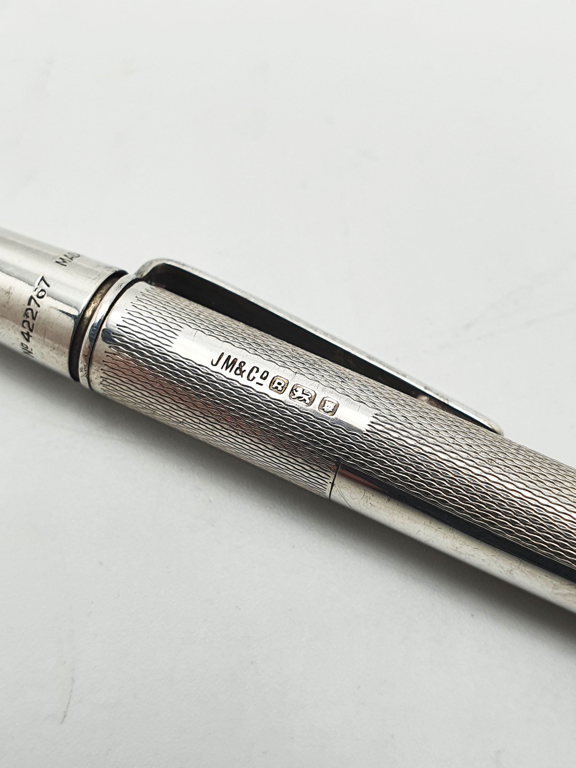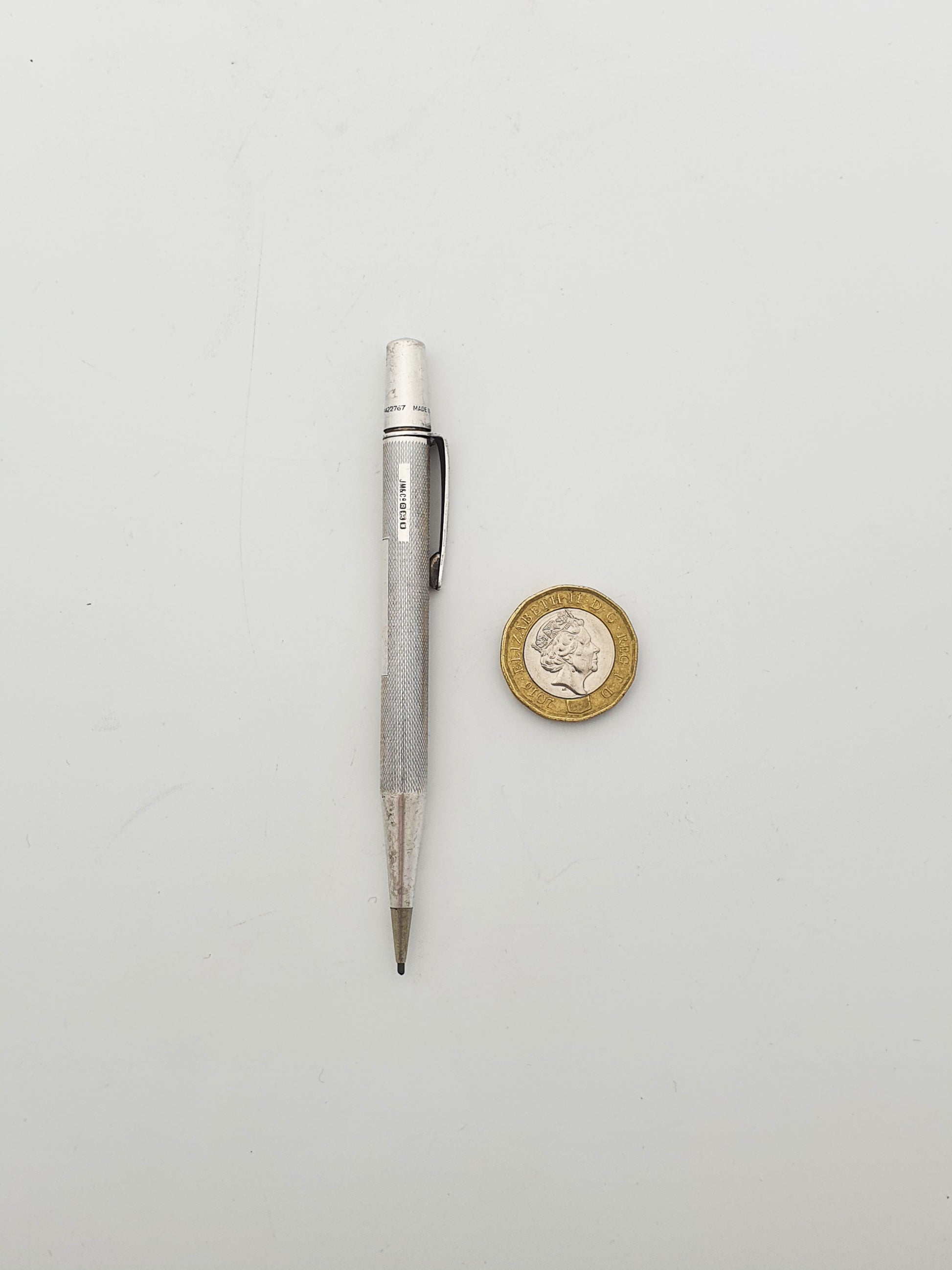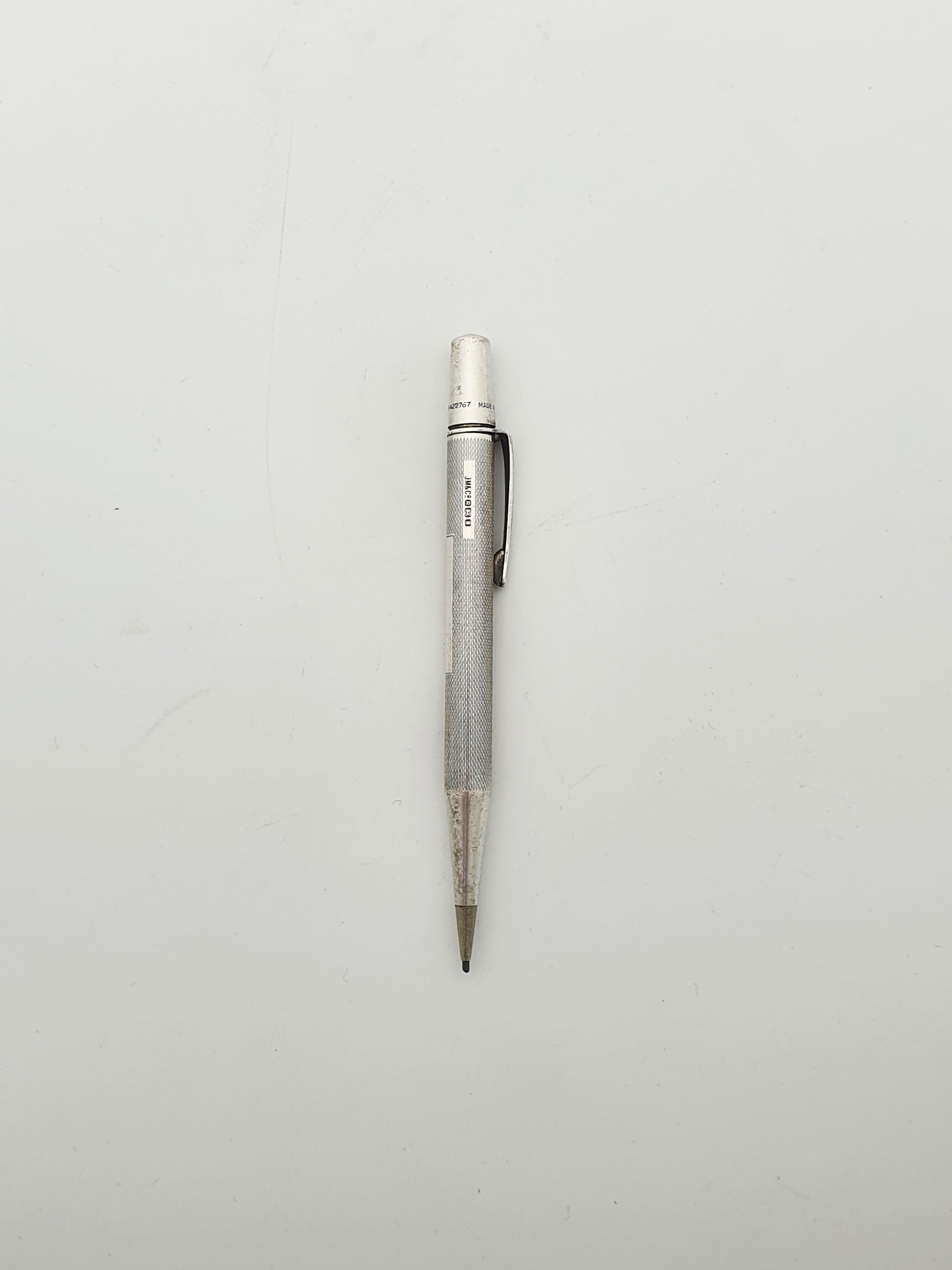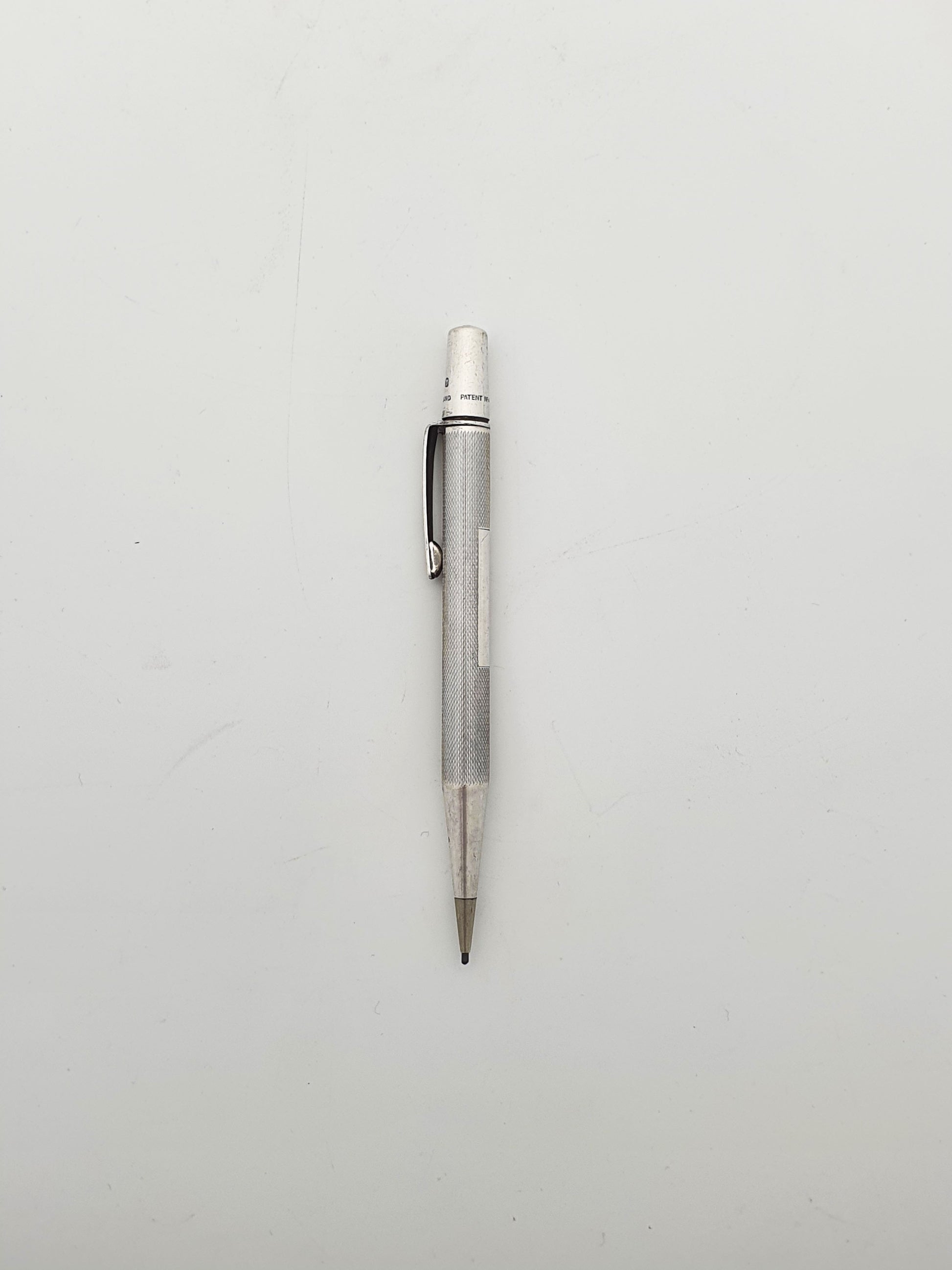 Nice Vintage Sterling Silver Yard-O-Led Propelling Pencil. This pencil features the classic engine-turned barley pattern, with the original clip stamped "YARD-O-LED". Hallmarked for London, 1952.