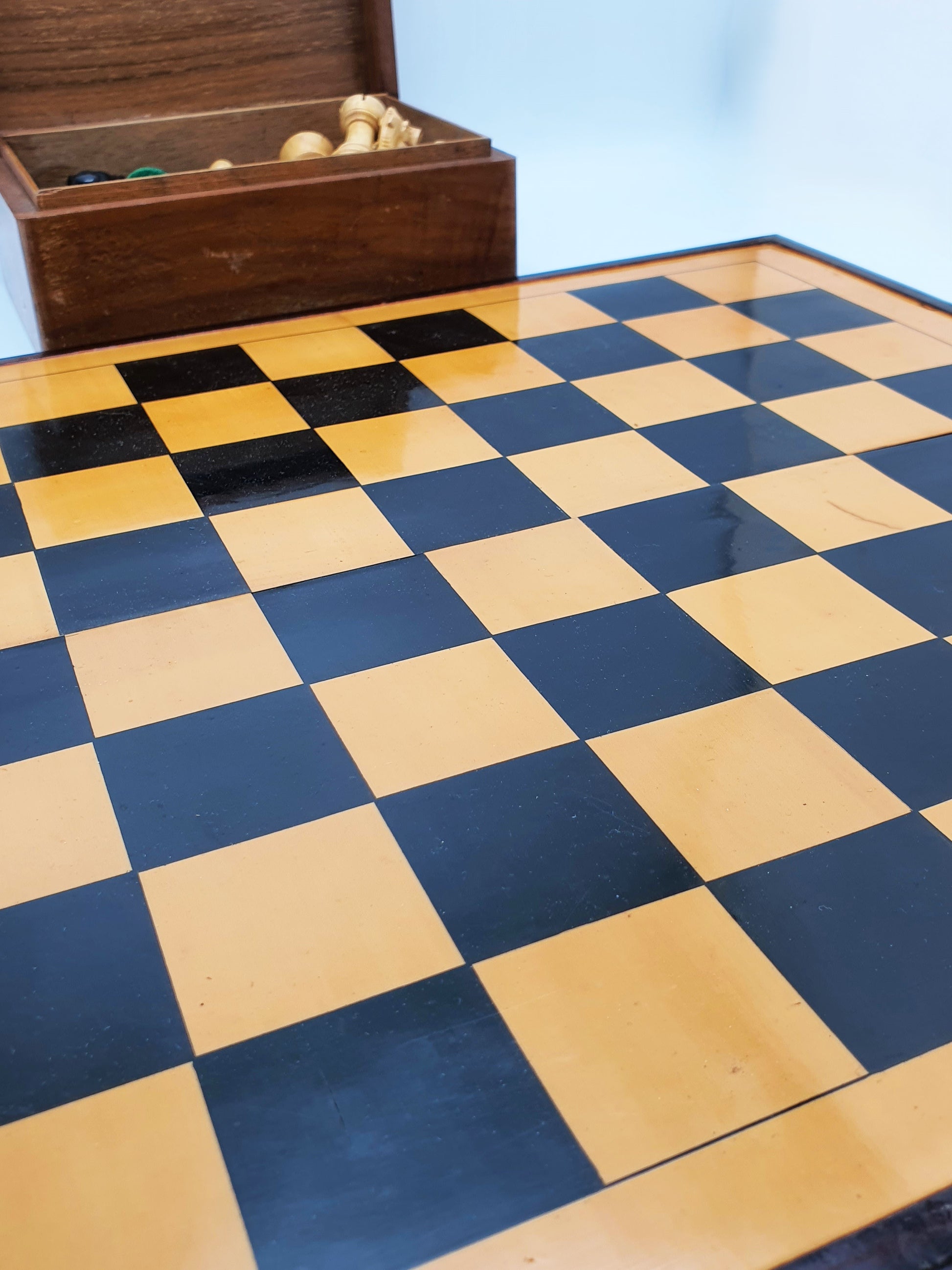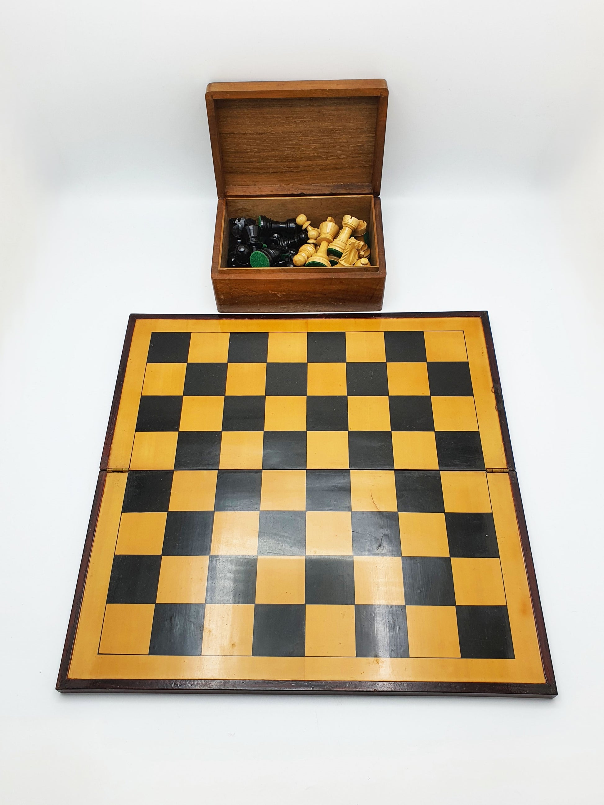 Nice Vintage Wooden Weighted Chess Set with Folding Board and Storage Box – circa 1950