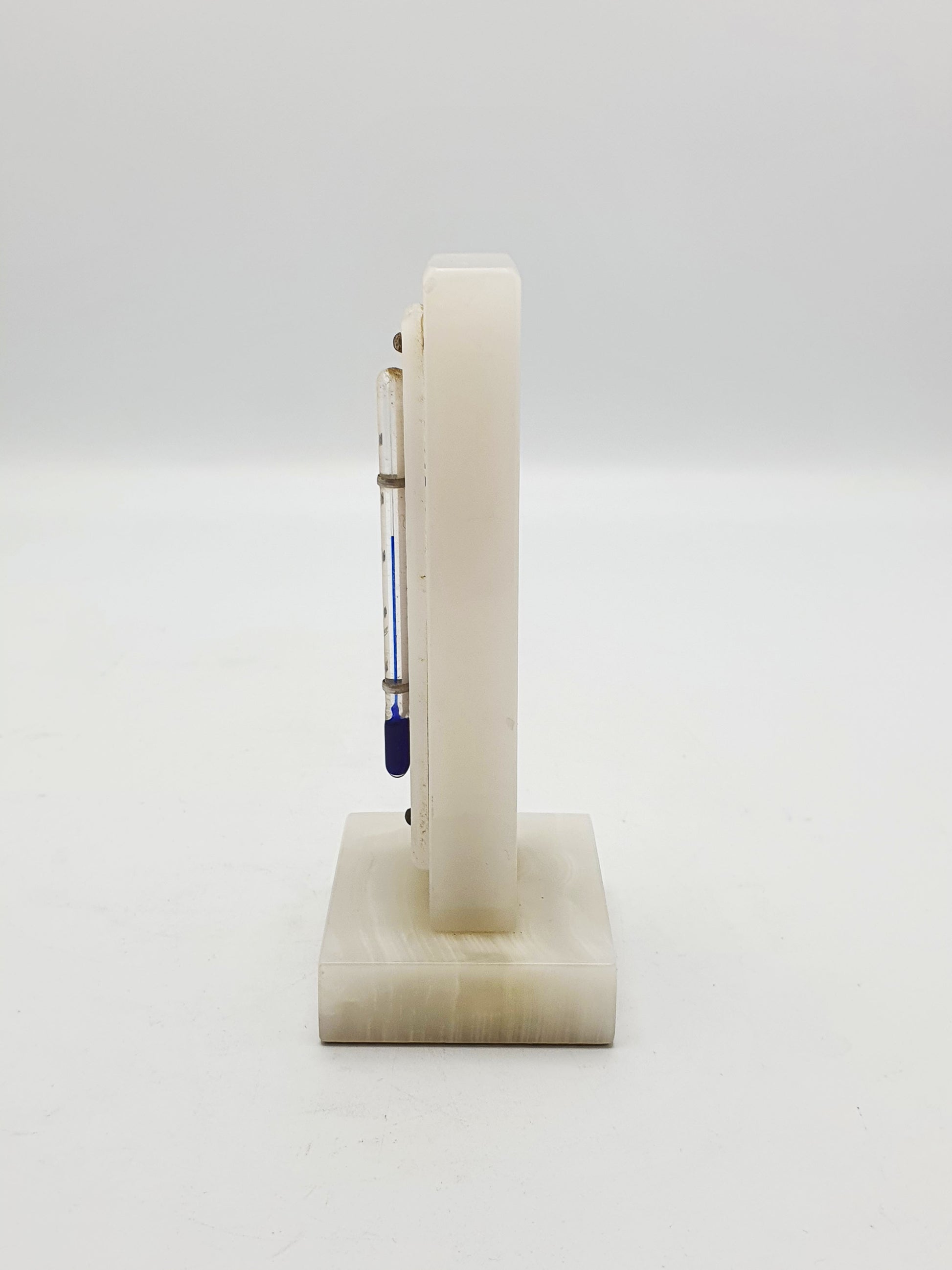A Nice White Onyx Desk Thermometer in full working order and made in England by SB. Featuring a dual-scale display in Fahrenheit and Centigrade, the thermometer is housed in a block of creamy white onyx with a stepped base, giving it both stability and a classic aesthetic. A striking piece of retro functionality, perfect for office desks, bookshelves, or collectors of vintage British instruments – circa 1930.