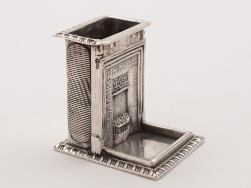 A good novelty English Victorian silver vesta/match box holder in the shape of a fireplace with match striker to both sides and hollow top for matches. Hallmarked London 1894. Worldwide first class tracked and signed for delivery is included in the price. Measurements: Height: 1 3/4 (approx 4.5cm) Length: 1 3/4 (approx 4.5cm) Depth: 1 1/4 (approx 3cm) Total weight: 41g In good condition - a few very minor dents to the base.
