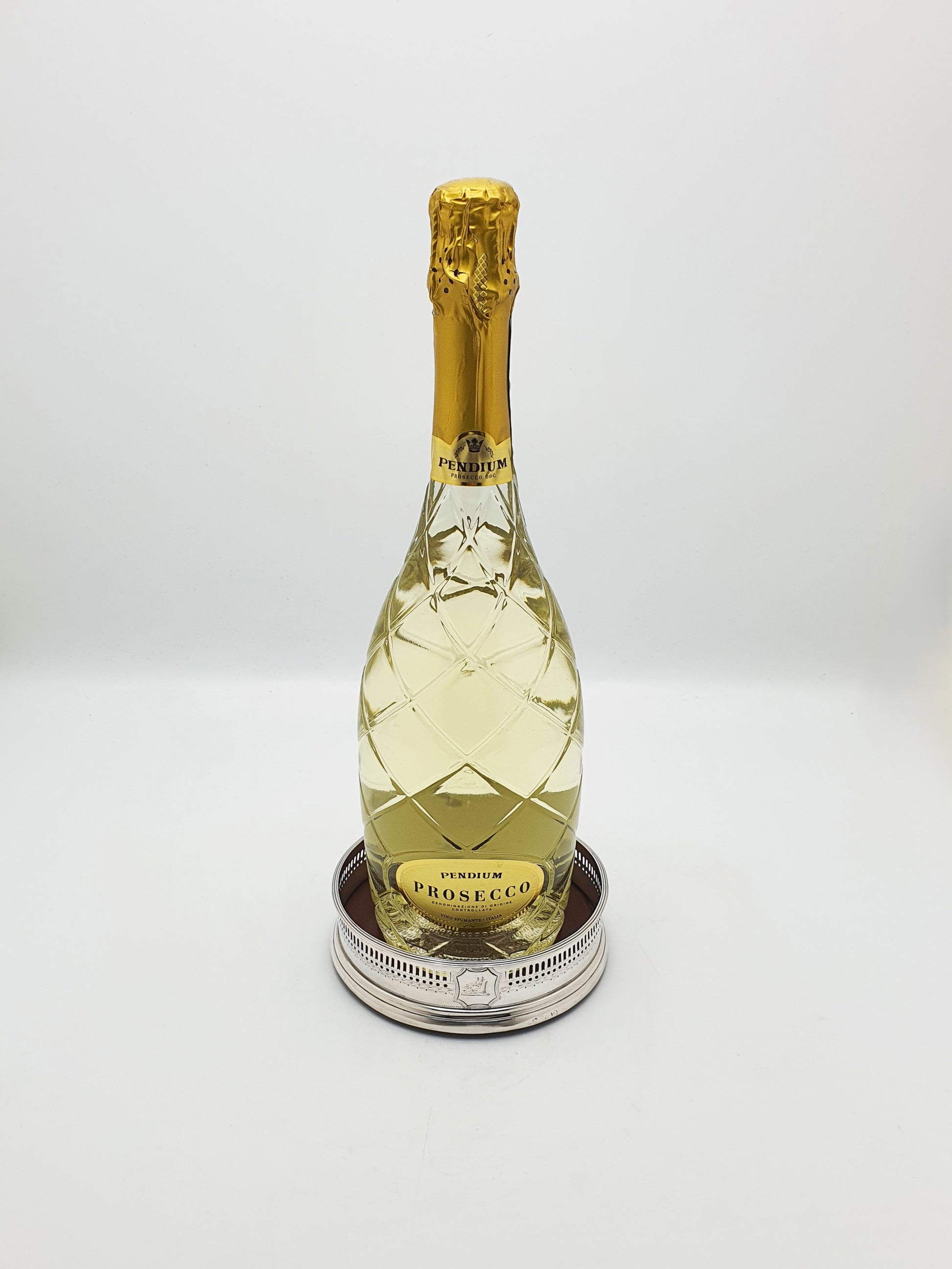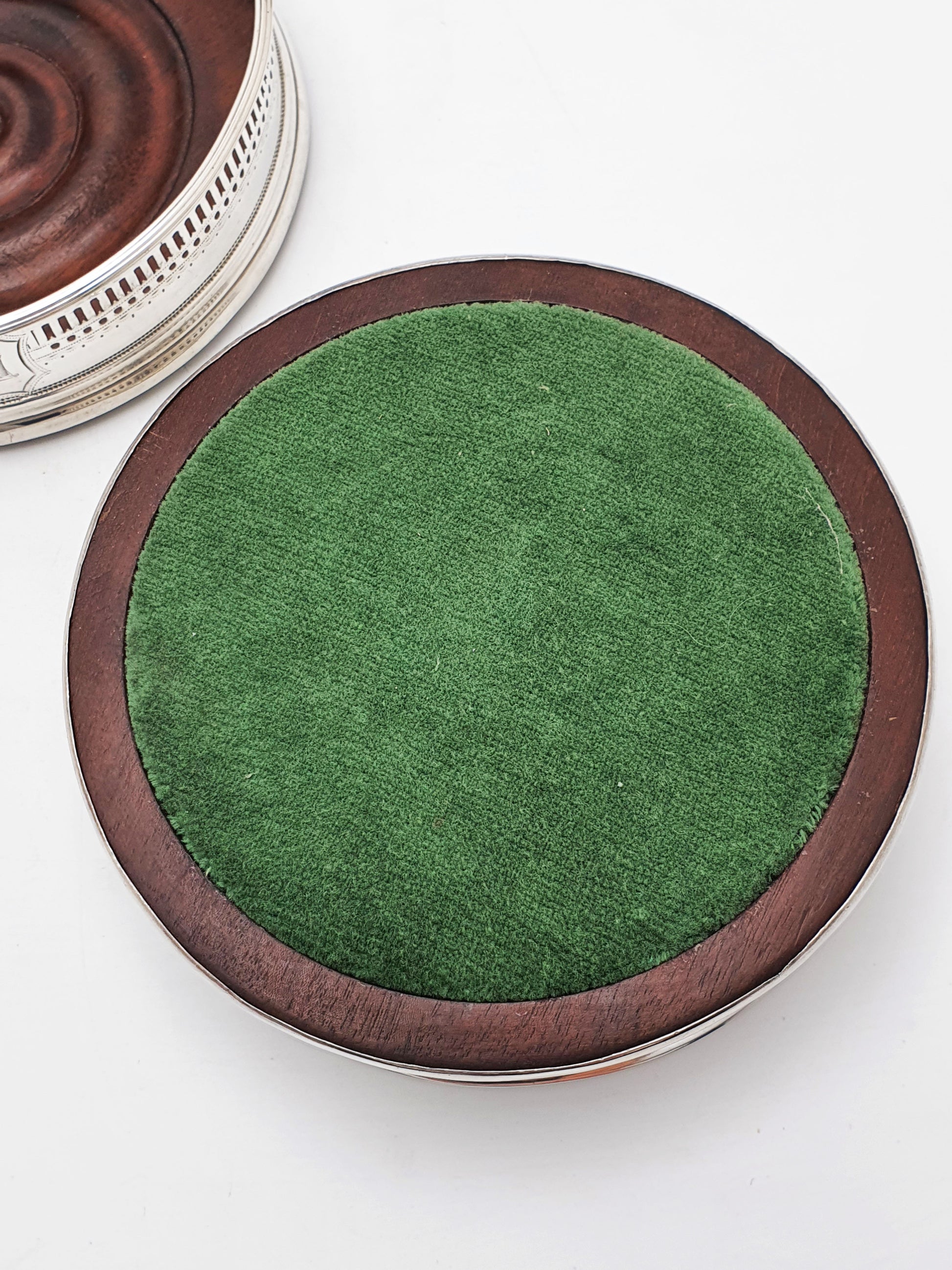 A Nice Pair of Antique Georgian Sterling Silver & Mahogany Wine Coasters. Each features a finely pierced sterling silver gallery with a bright, polished finish and a classic gadroon border. The turned mahogany bases are rich in tone and texture, finished with green felt undersides to protect your surfaces. An engraved armorial crest of a boars head on each coaster adds a noble flourish, suggesting past use in a distinguished household. The original hallmarks are very worn. However, the ‘Georgian Mark’ indicating the date, and the ‘Leopards Head’ for London are visible – circa 1800.