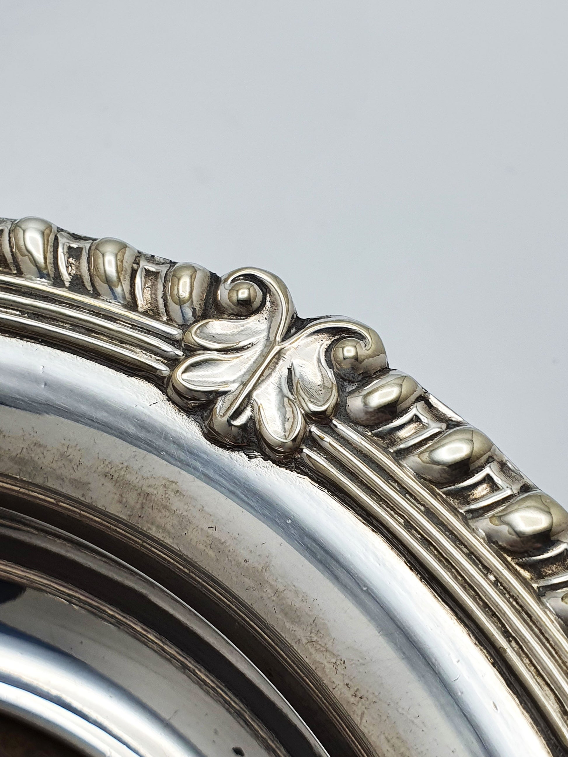 A Pair of Antique Wine Bottle Coasters featuring beautifully detailed silver plate rims and rich turned mahogany wood bases. Designed to catch drips and protect fine linens or polished tabletops, these coasters blend functionality with refined craftsmanship. Their classical motif of gadrooning and acanthus leaves speaks to Victorian-era sophistication, making them an exquisite addition to any formal dining setting or antique silver collection – circa 1920.