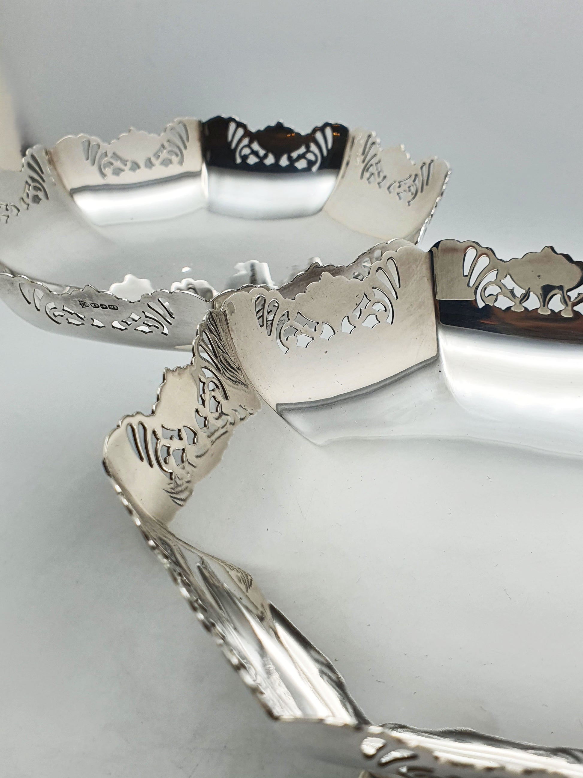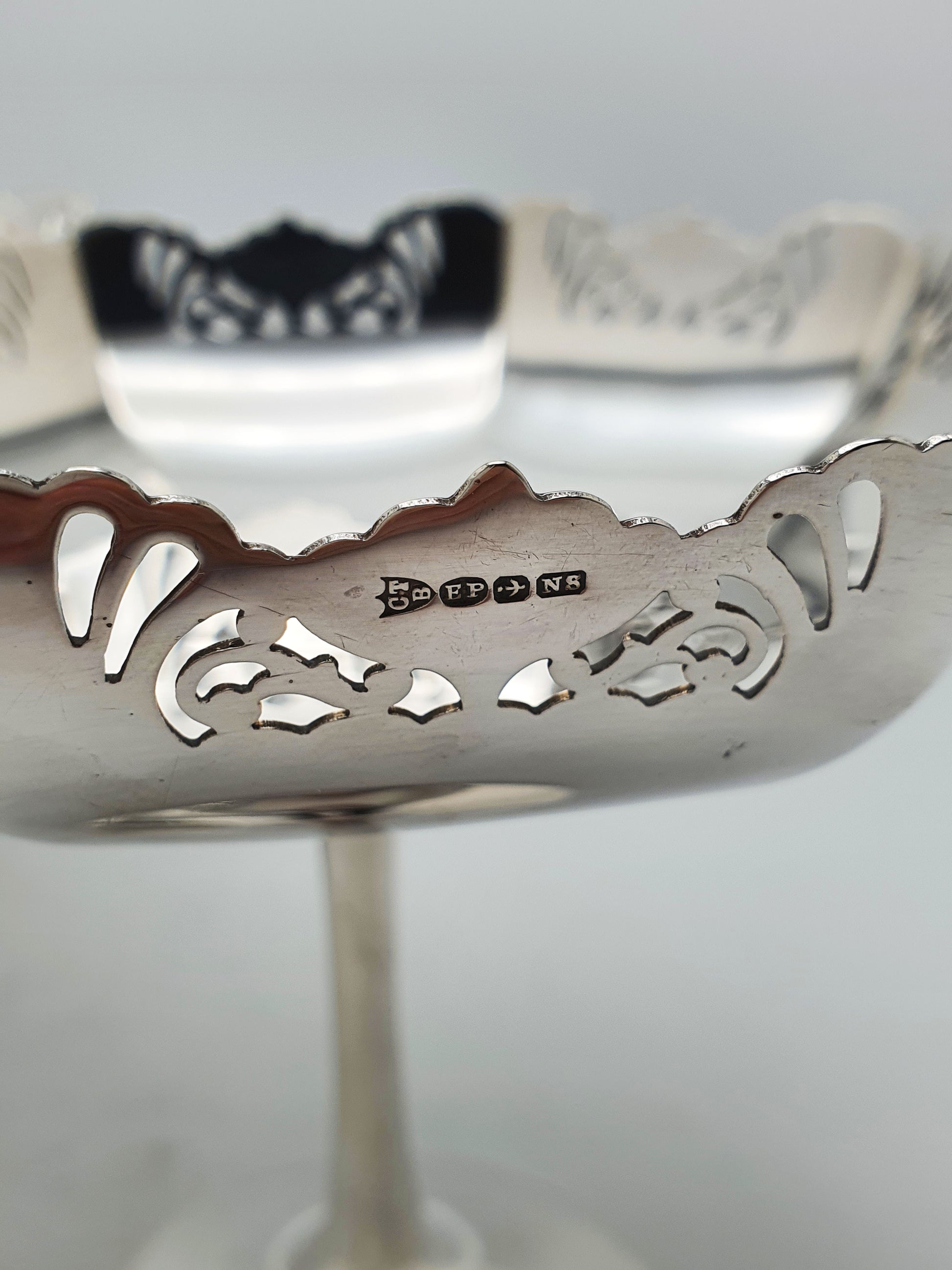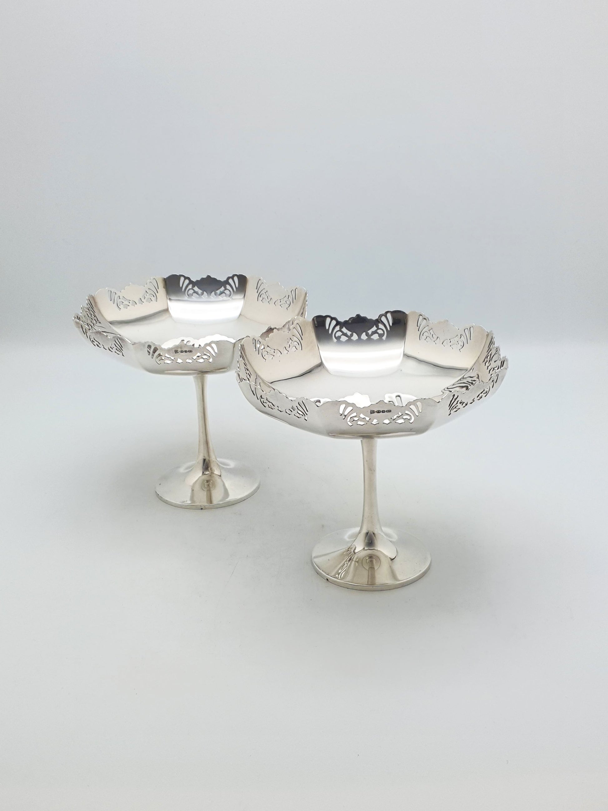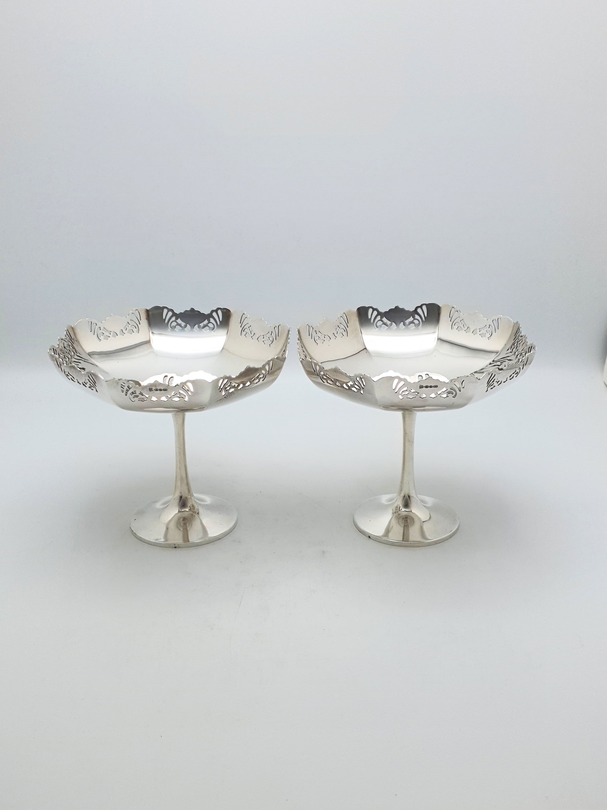 Pair of Antique Silver-Plated Pedestal Dishes with scalloped octagonal bowls and finely pierced rims, they are ideal for serving sweets, displaying fruit, or adding a touch of classic sophistication to a sideboard or table setting – circa 1920.