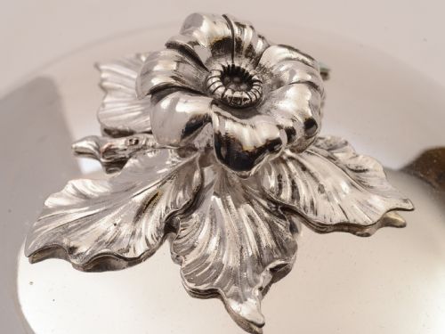 A gorgeous pair of French Christofle silver plated food covers with embossed flower finials and family crest engraved to covers. Come with a pair of English silver plated plates. Circa 1900. FREE worldwide delivery. Measurements: Height: 8 (approx 20cm) Diameter across base: 9 3/4 (approx 24.5cm) Diameter across plates: 14 (approx 35cm) Total weight: 4180g In good condition - any dark areas are shadows from the photography there is no damage to the silver plate.
