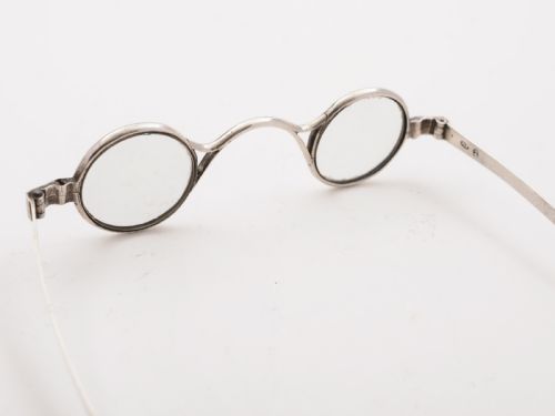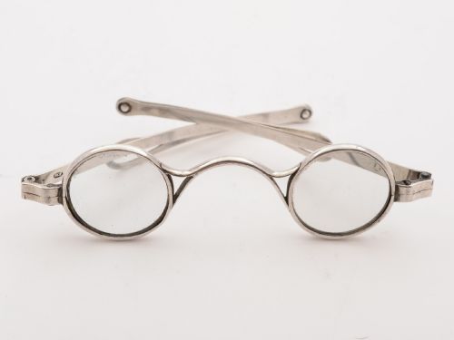 A nice pair of English Georgian silver reading glasses with sliding extendable arms hallmarked Birmingham 1816 and marked J.W for the maker Joseph Willmore. FREE worldwide delivery. Measurements: Length (arms extended): 6 (approx 15cm) Length (arms closed): 4 (approx 10cm) Width (frames): 4 1/2 (approx 11.25cm) Diameter (frames): 1 (approx 2.5cm) Weight: 24g In good condition - any dark areas are shadows from the photography. Lenses are in good condition.