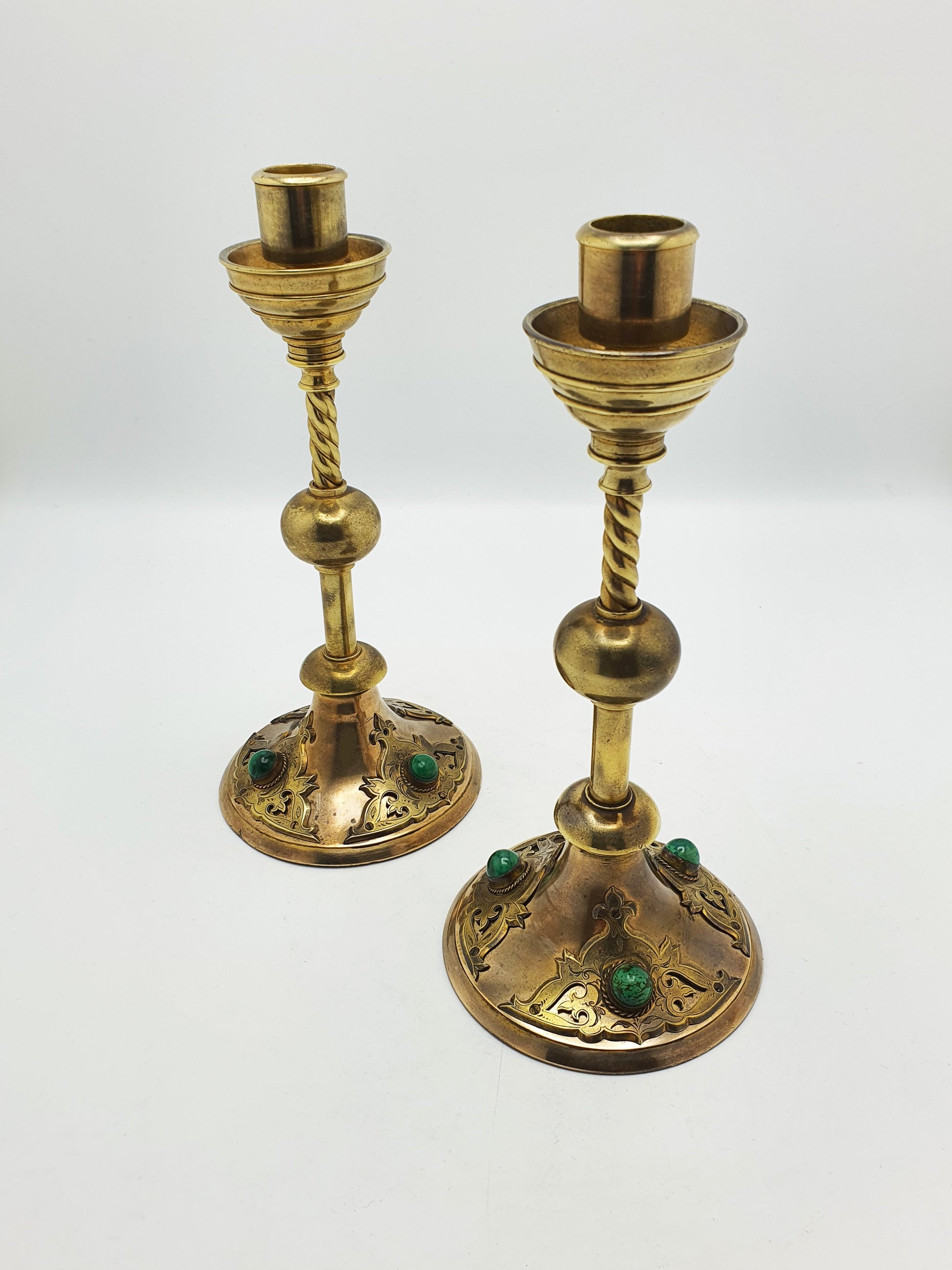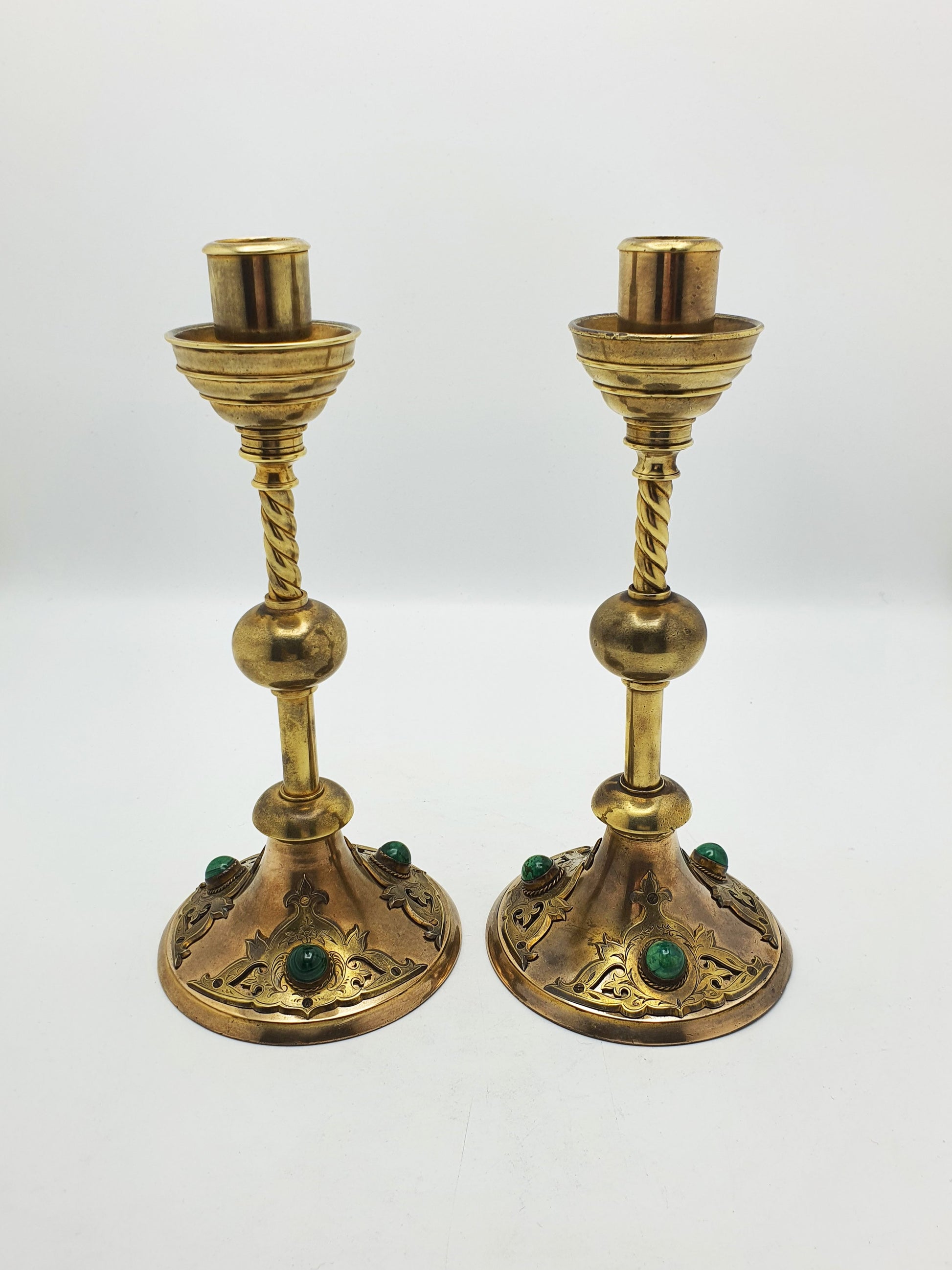 A Striking Pair of Gothic Revival Brass Candlesticks each featuring a twisted column stem above a domed circular base. The bases are richly embellished with pierced and engraved Gothic tracery motifs, and set with green glass cabochons resembling malachite. These ecclesiastically inspired pieces draw on medieval church metalwork, featuring highly ornate detailing and bold architectural forms – circa 1880.