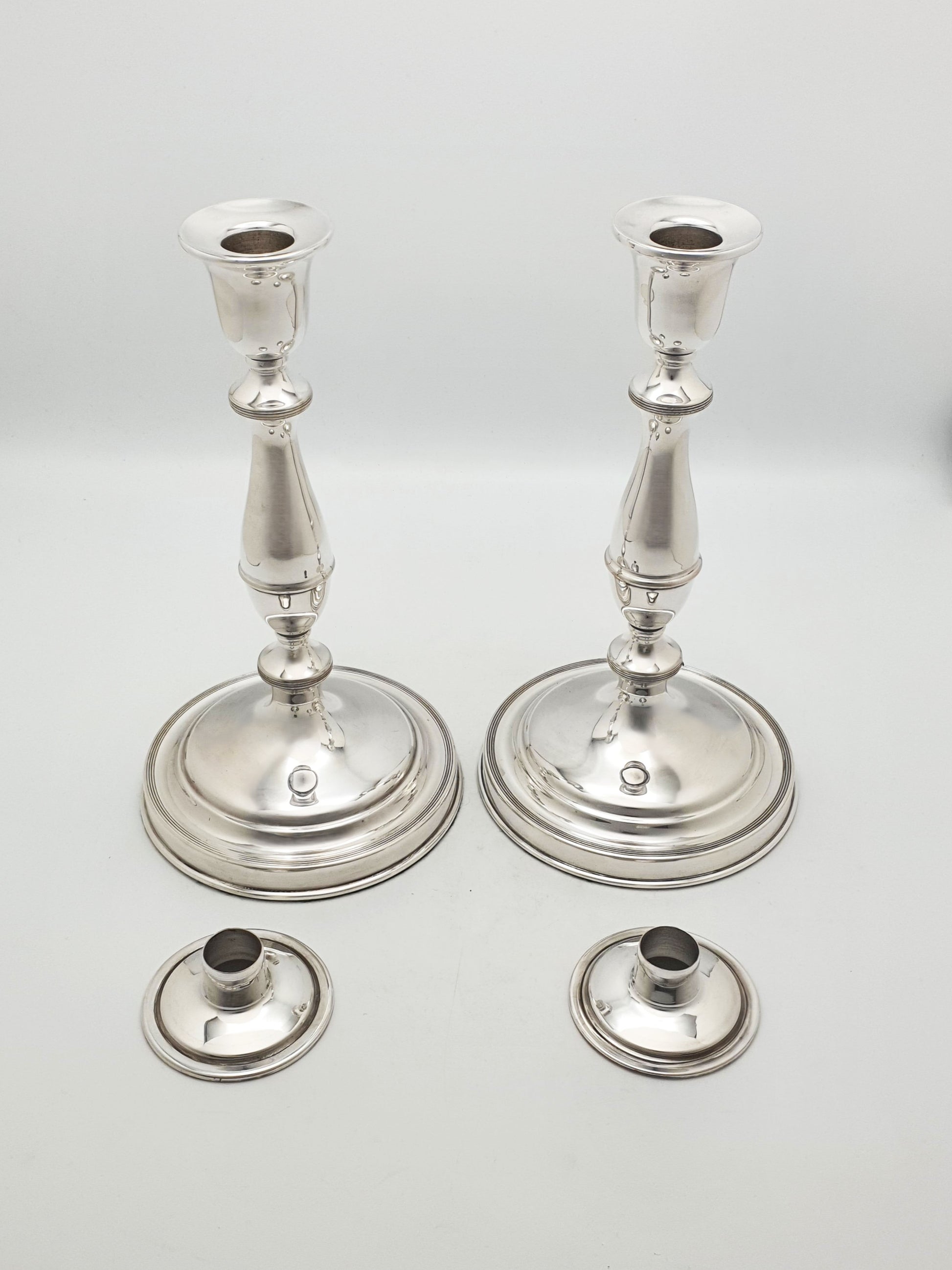 A Pair of Large Antique Silver-Plated Candlesticks in a classic baluster form. With their elegant proportions and gently tiered bases, these candlesticks bring understated sophistication to any table, mantelpiece, or sideboard. Crafted with a traditional silhouette, each candlestick features a smooth, tapered stem, broad circular base, and a wide drip pan collar. The bases are weighted for stability, offering a sturdy and well-grounded feel in hand – circa 1920.
