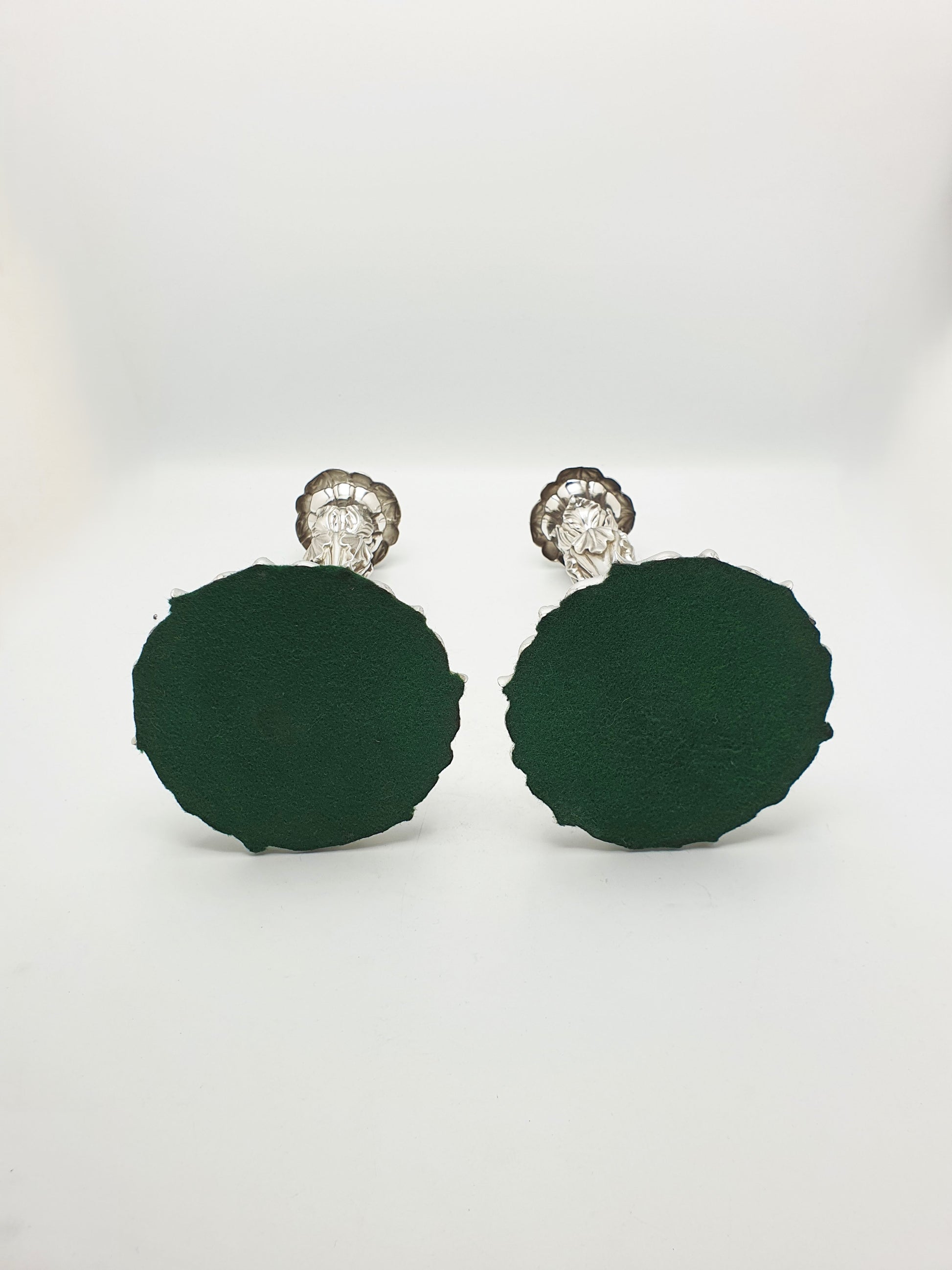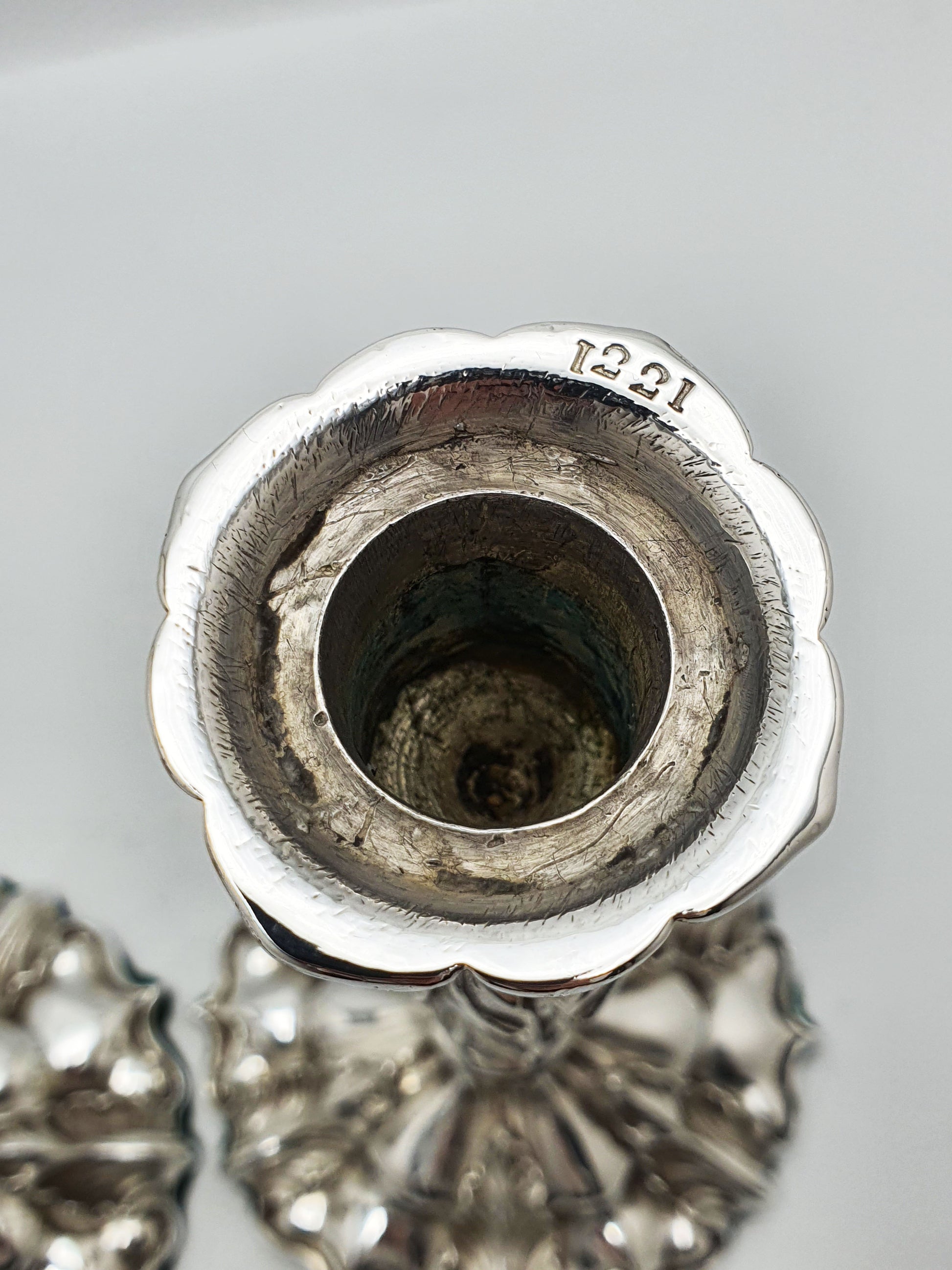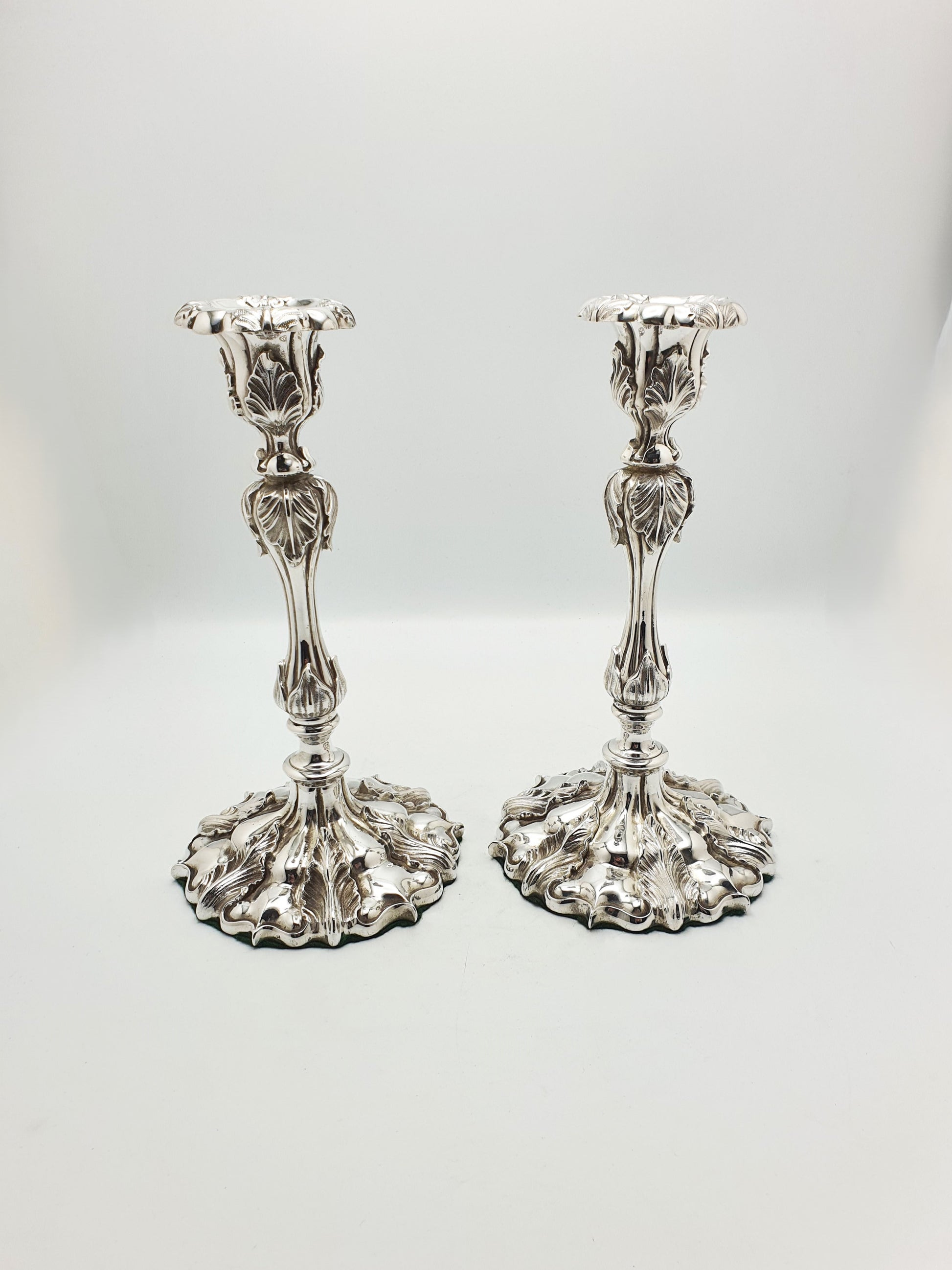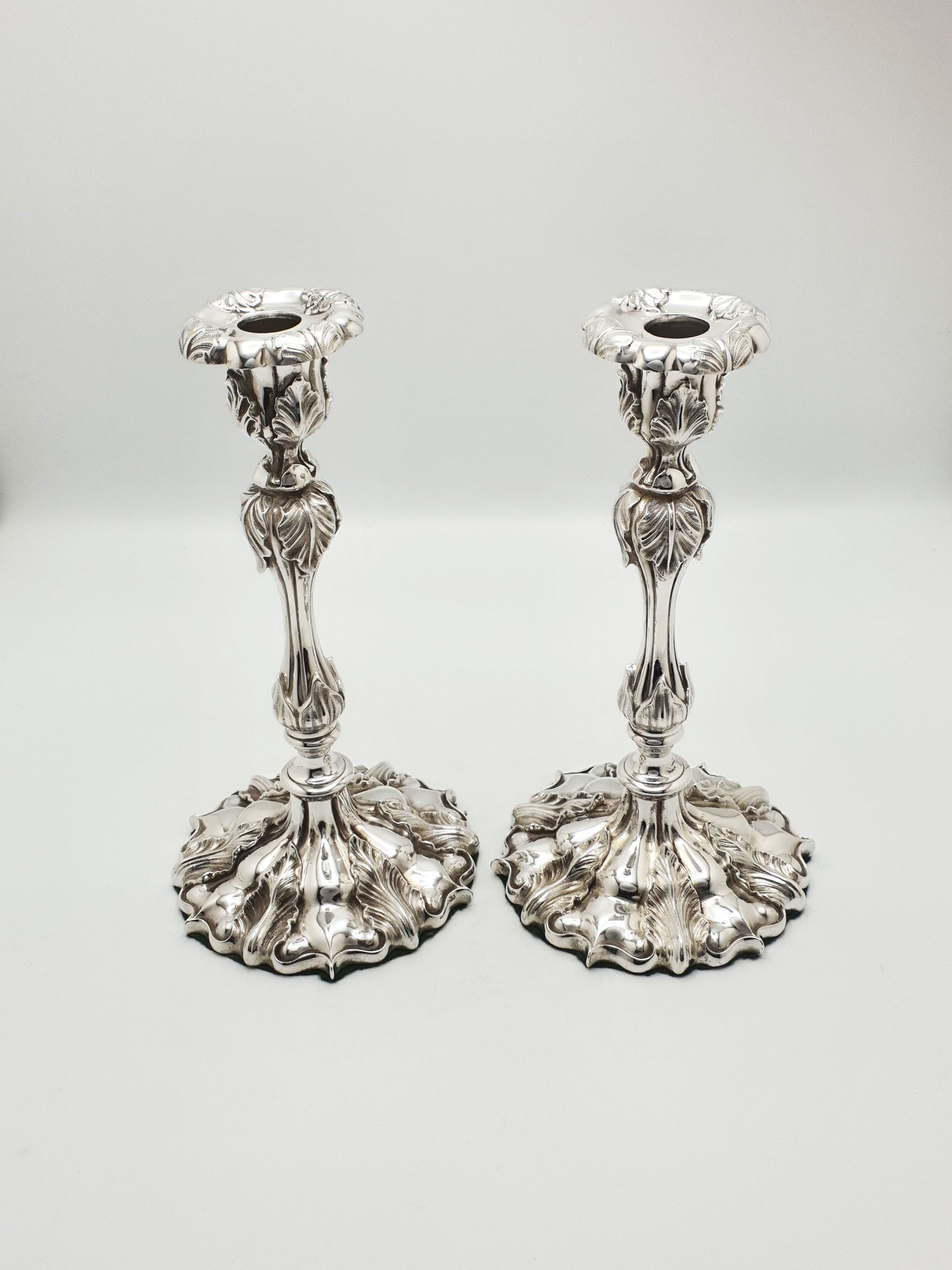 A Pair of Ornate Antique Cast Silver-Plated Rococo Revival Candlesticks heavily decorated with stylized acanthus leaves, scrolls, and shell-inspired motifs. Their undulating, naturalistic forms echo the curves of nature - true to Rococo design. Both candlesticks include original removable wax drip trays – circa 1870.