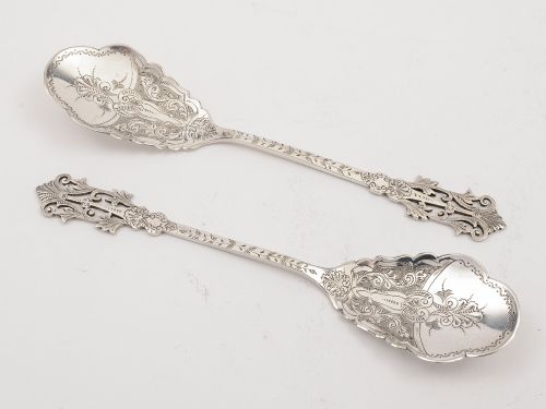 A lovely pair of English Victorian silver plated preserve spoons with pierced and engraved decoration presented in original velvet and silk lined box. Maker is Philip Ashbury & Sons Sheffield England circa 1890. Worldwide first class tracked and signed for delivery is included in the price. Measurements: Length: 6 1/2 (approx 16cm) Width: 1 1/2 (approx 4cm) An exceptionally nice pair of preserve spoons would make a wonderful gift! In good condition