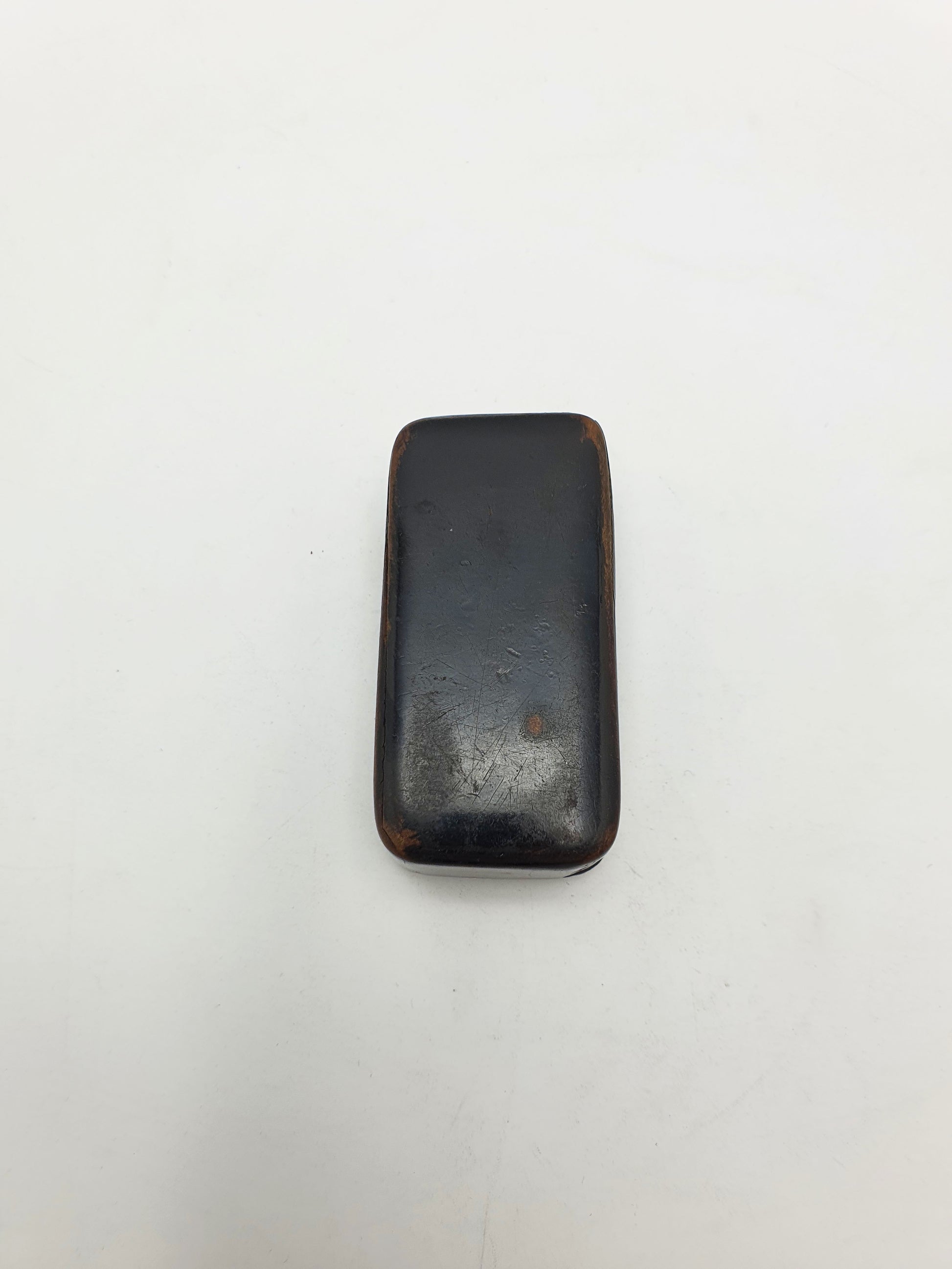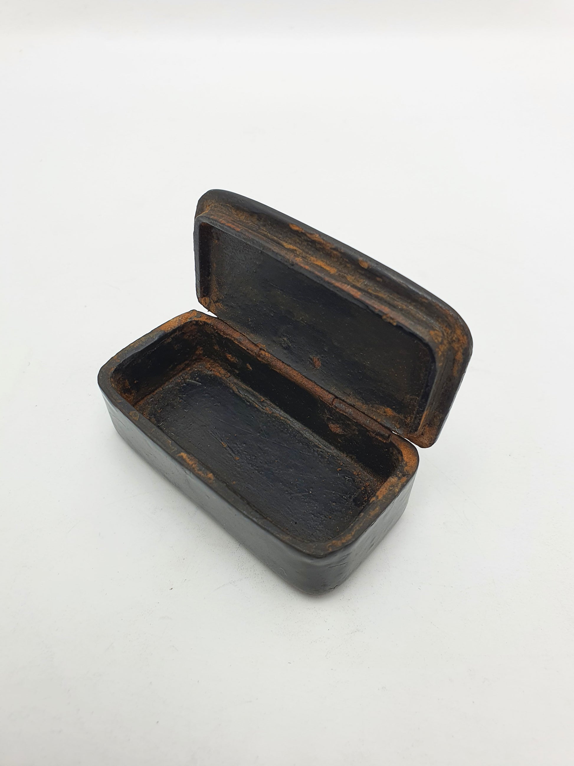 In good condition – In fair antique condition with wear and surface marks consistent with age and handling. The interior shows natural discolouration and some flaking of the original coating. Despite this, the box retains a lovely sheen, and the inlay remains and vibrant with minor wear to one corner. The structure is stable, and the lid opens and closes correctly.