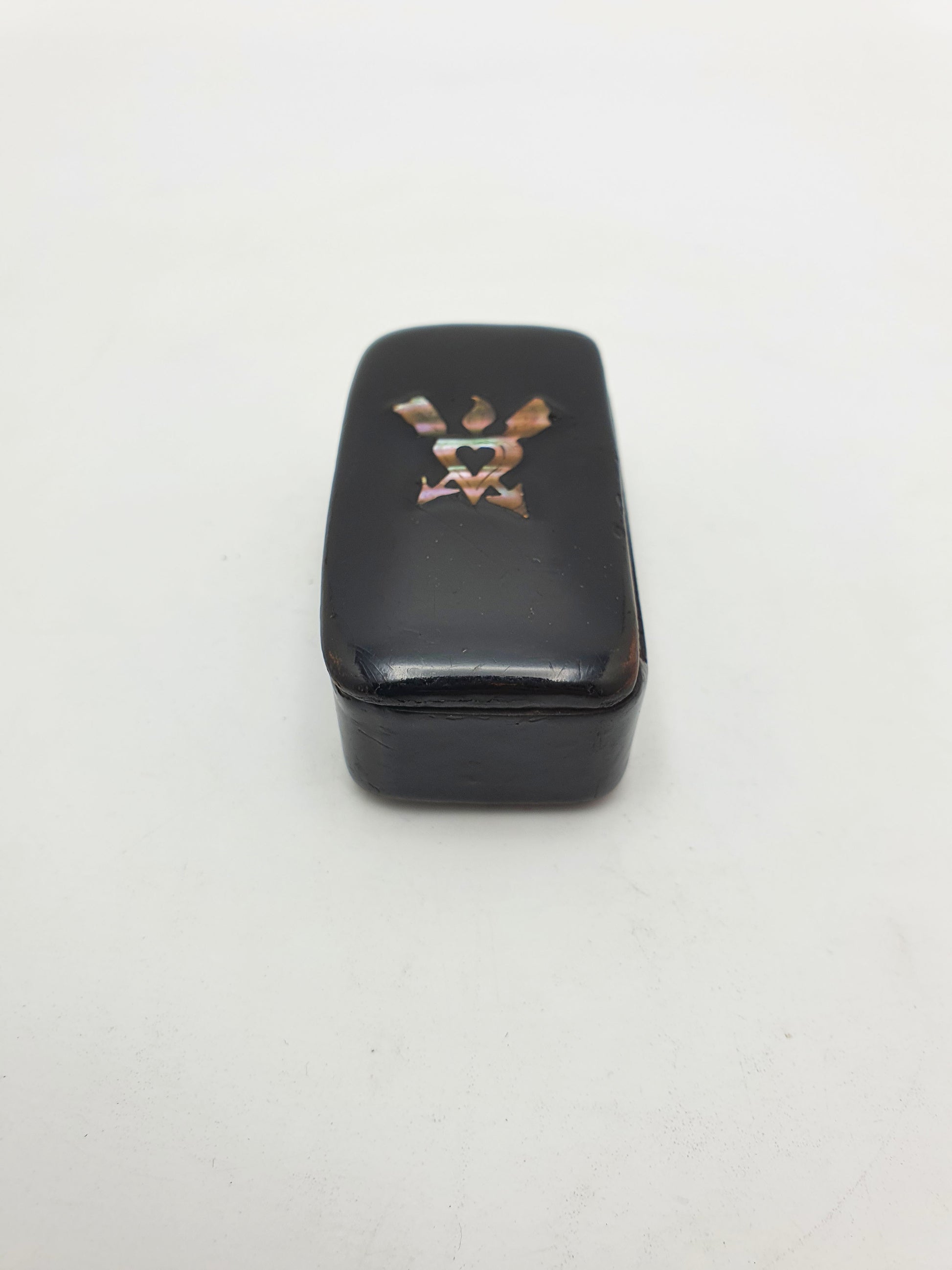 This charming 19th-century papier-mâché snuff or trinket box is a wonderful survivor of Victorian decorative arts, prized for both its craftsmanship and symbolic embellishment. Its compact, curved form is finished in a lustrous black lacquer and decorated to the lid with a striking mother-of-pearl inlay in the form of a torch and heart motif - a symbol often associated with eternal love, passion, or remembrance.