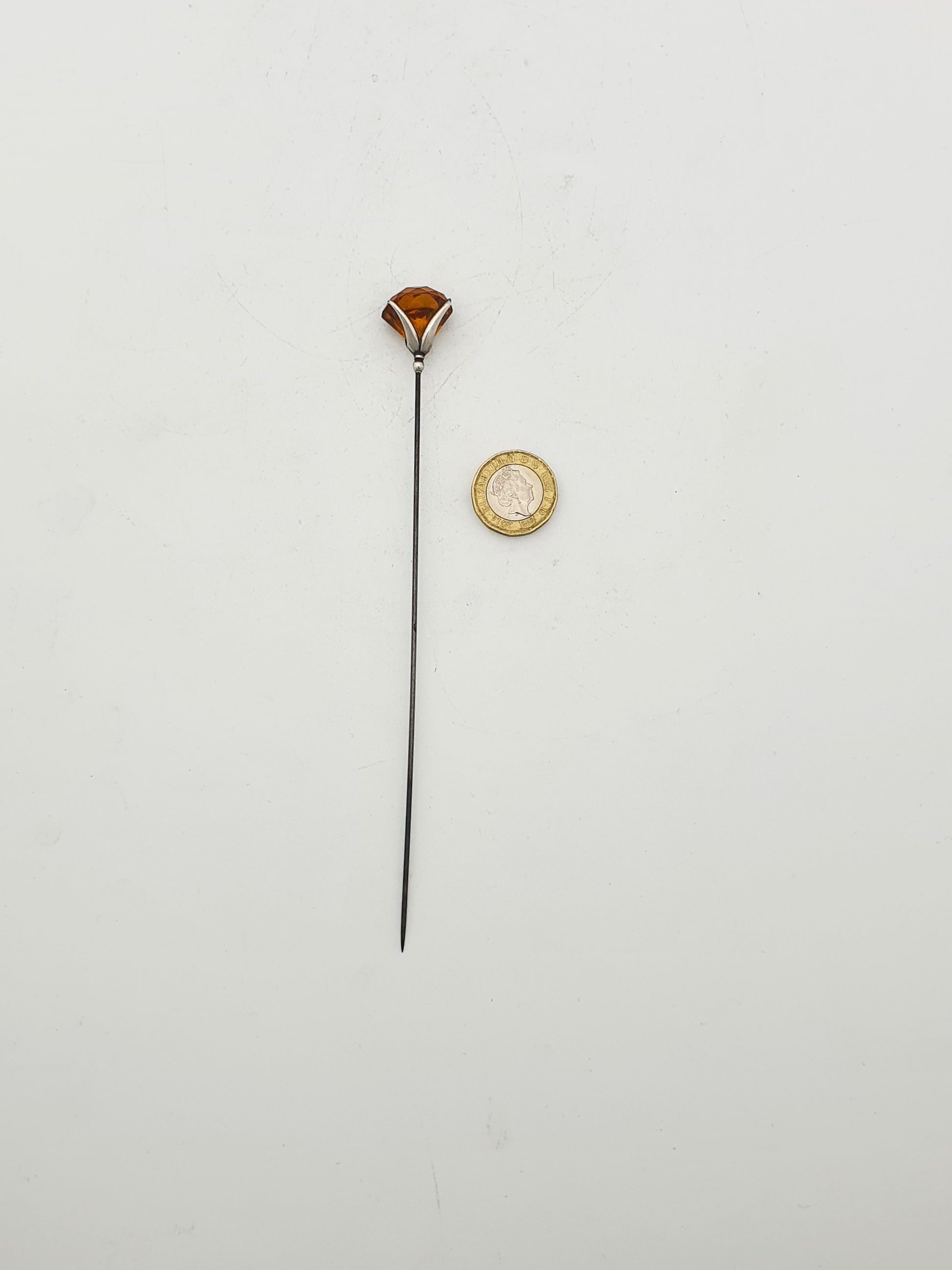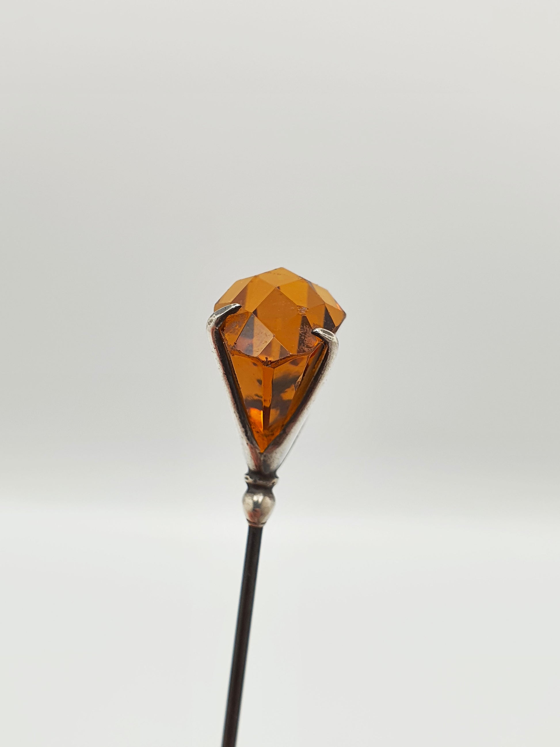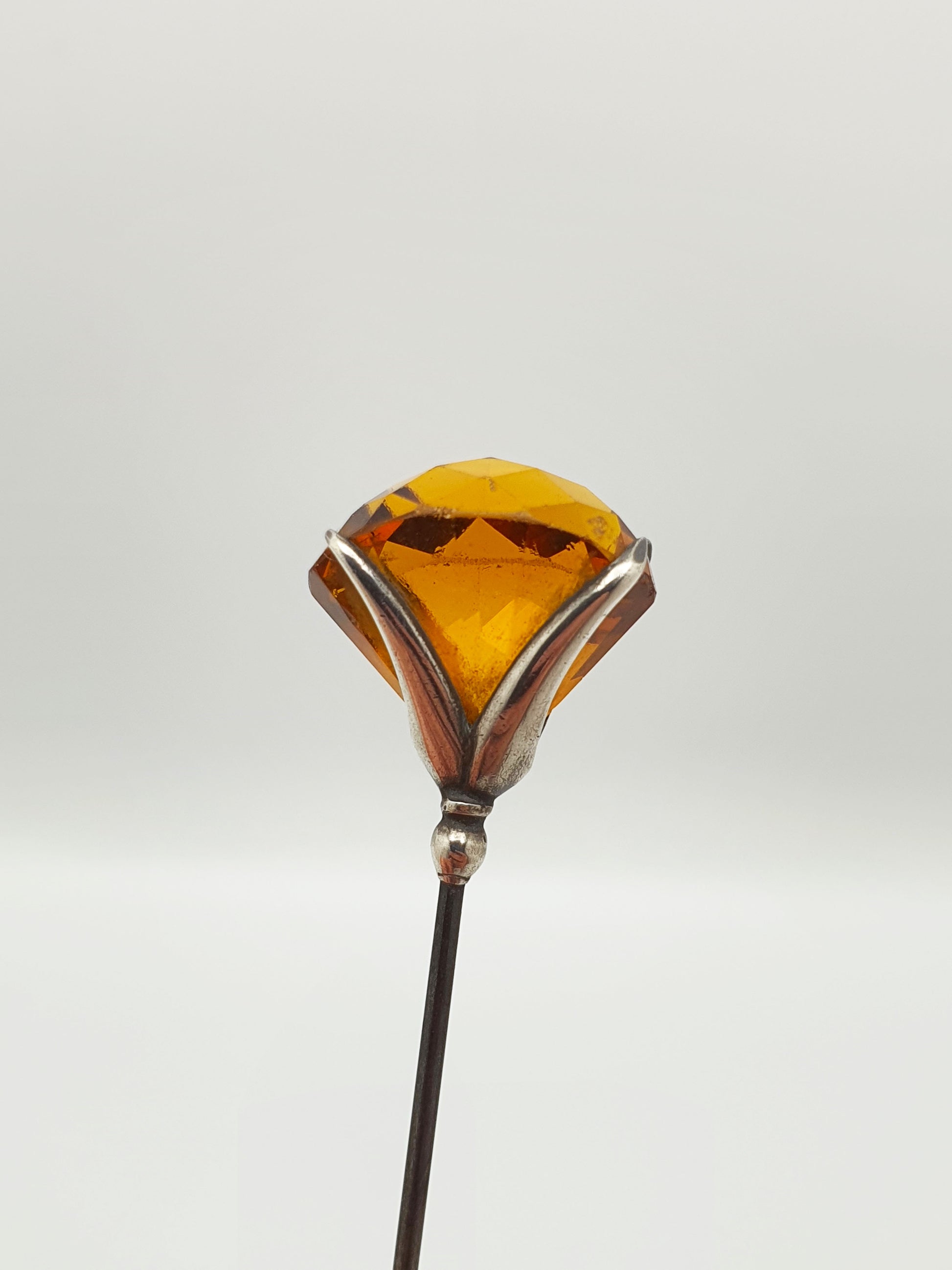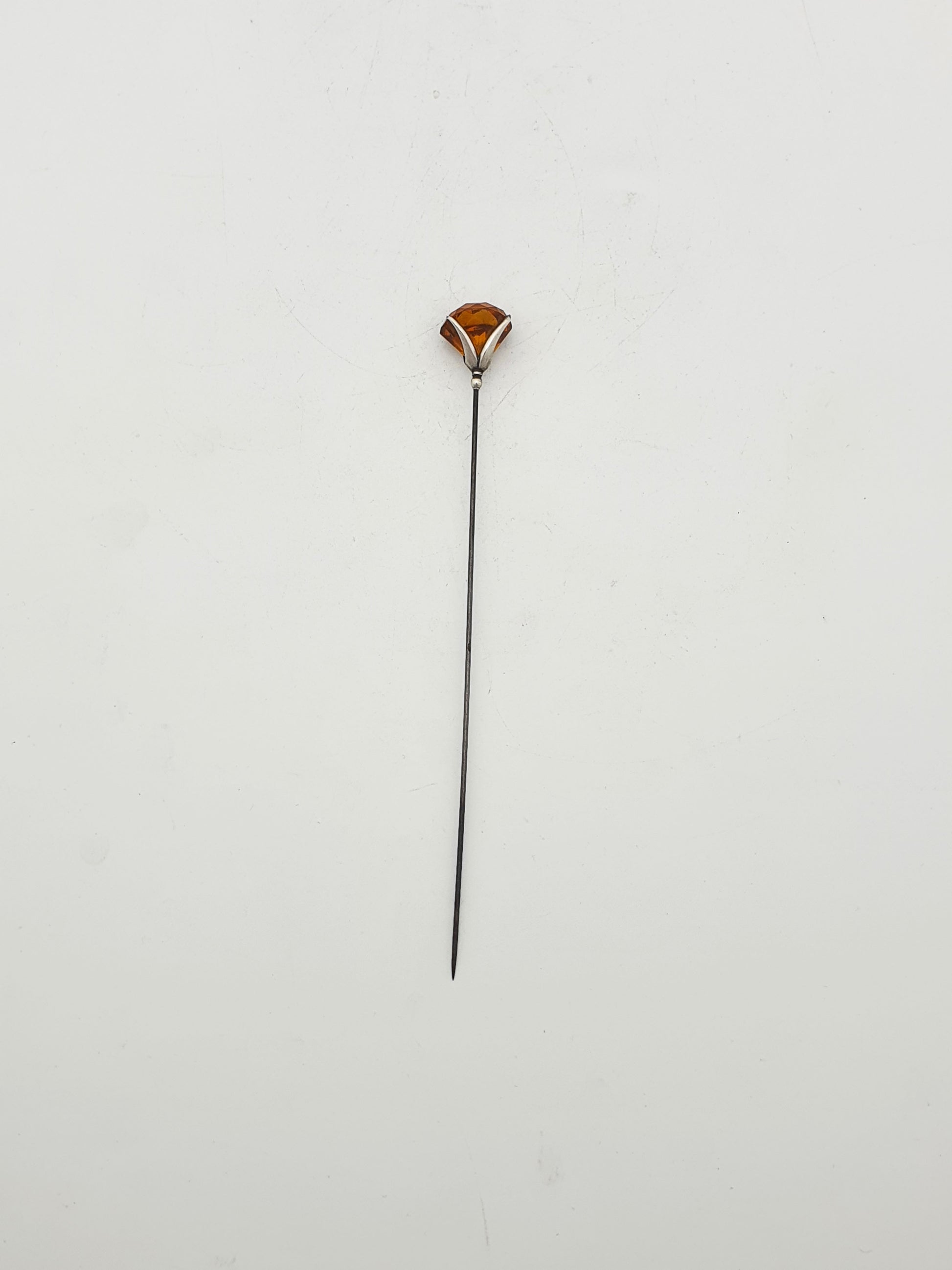 A Pretty Antique Edwardian Sterling Silver & Amber-Coloured Glass Hat Pin featuring a faceted deep honey-hued glass stone securely claw-set in sterling silver. The long, steel pin and sculptural mount make it both a fashionable accessory and a fine example of early 20th-century craftsmanship. Hallmarked for Chester, 1907 and marked ‘C.H’ for the renowned maker ‘Charles Horner’.