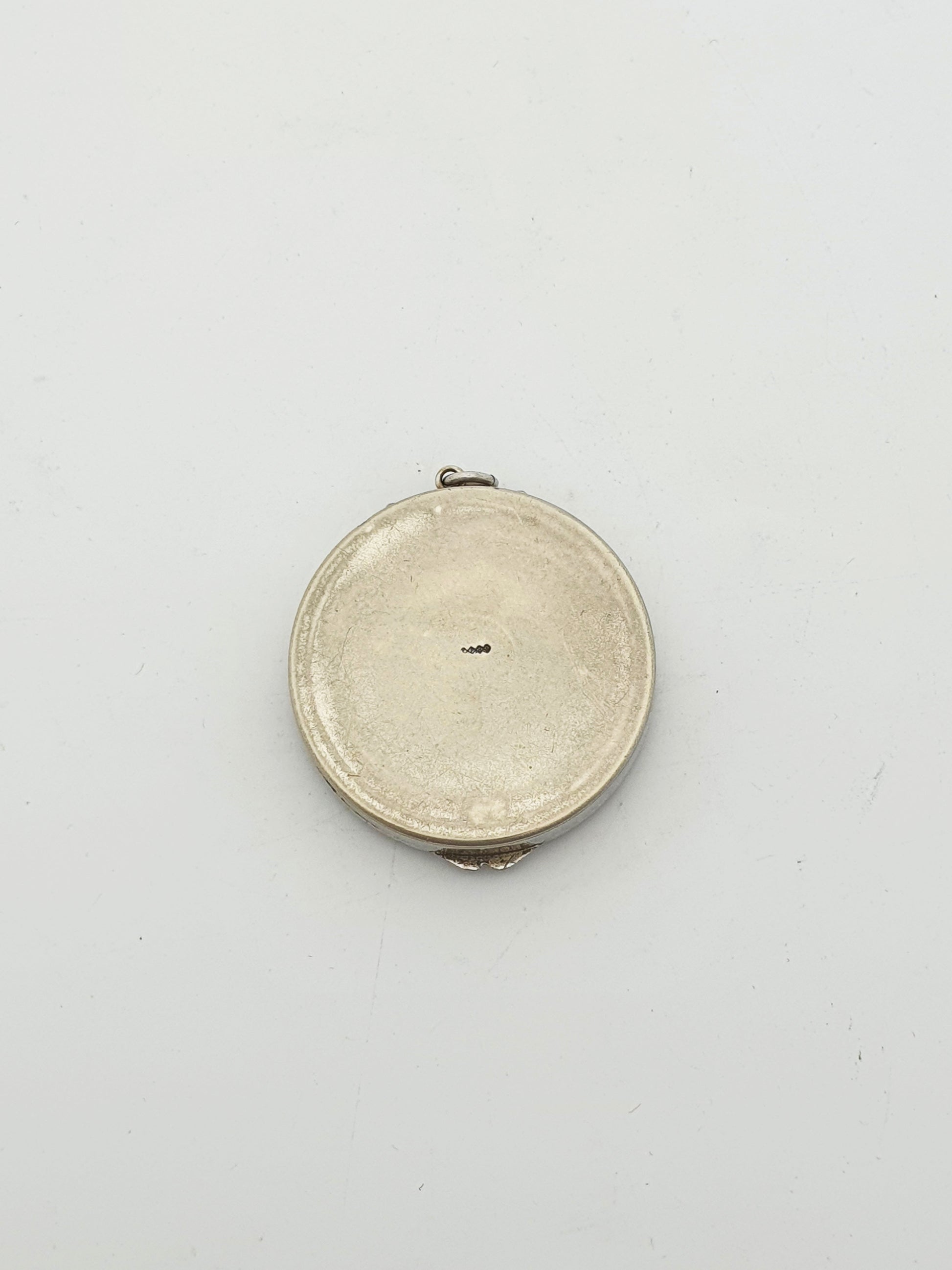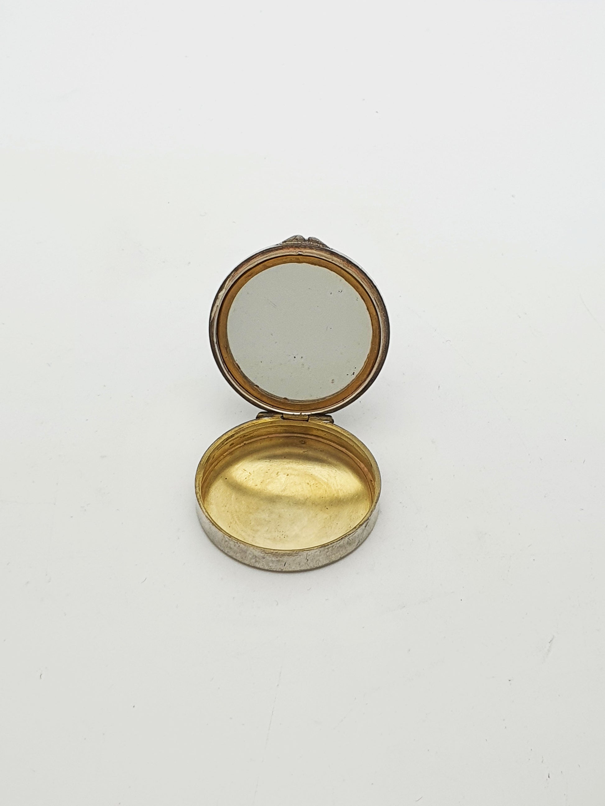 A Pretty Antique Silver-Plate and Enamel Compact featuring a beautifully detailed enamel depiction of a courting couple in period dress - she in a voluminous red gown, he is serenading with a stringed instrument. Likely dating from the early-20th century, this compact features a silver-toned metal case with a mirror inside and a gold-washed interior. Ideal as a collectible or display piece, it captures the nostalgic elegance of vintage vanity accessories.