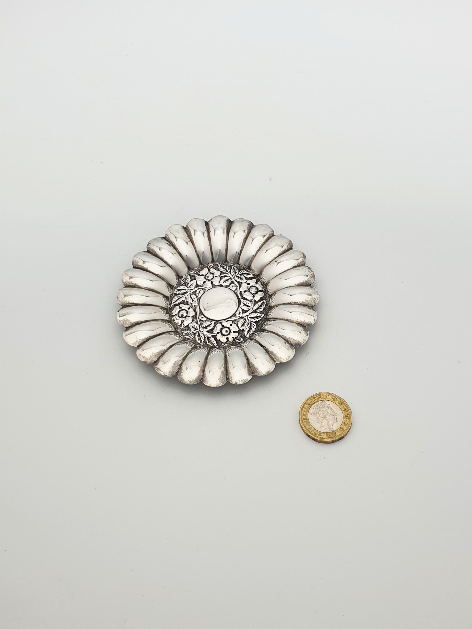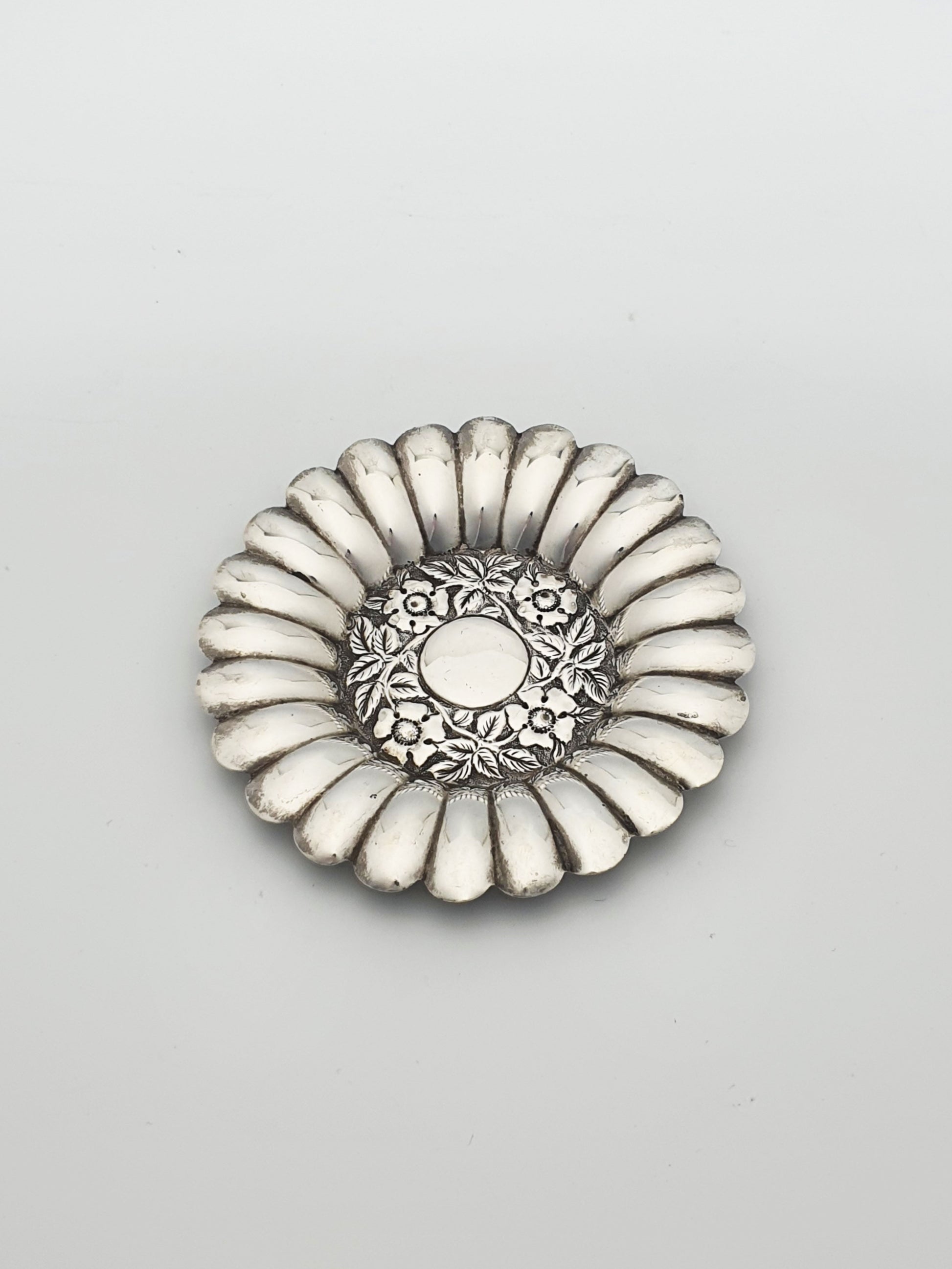 A Pretty Antique Victorian Solid Silver Dish with edges that fan outward like the petals of a sunflower or daisy, offering a beautifully organic silhouette. Hallmarked for Birmingham, 1897.