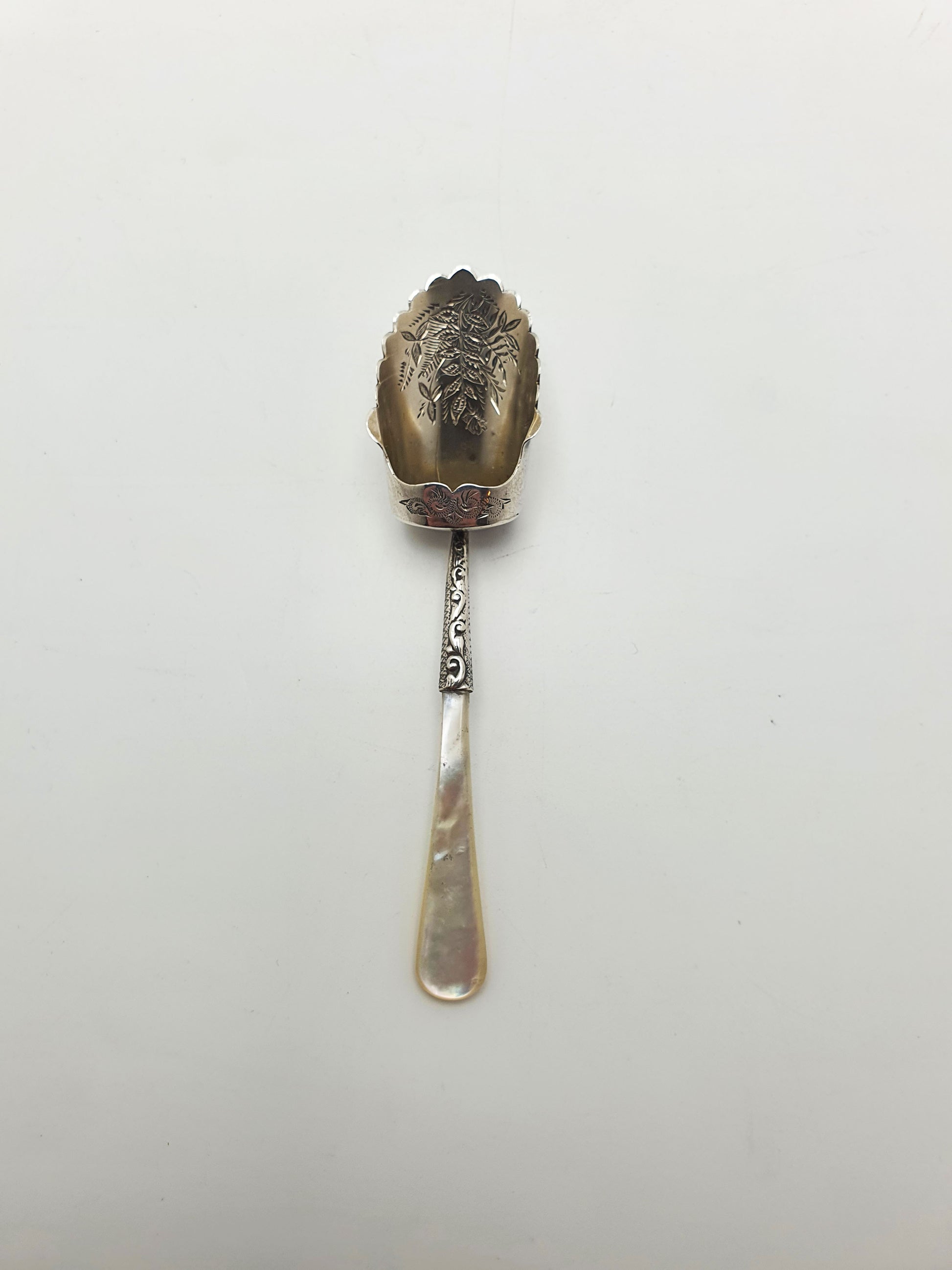 A charming and highly decorative late Victorian caddy spoon, fully hallmarked for Birmingham, 1895. This elegant piece features a beautifully hand-engraved sterling silver bowl paired with a creamy mother-of-pearl handle, combining natural beauty with fine craftsmanship. The scalloped bowl is adorned with a detailed foliate design, meticulously engraved to showcase delicate leaves, stems, and blossoms, which catch the light with a subtle shimmer.