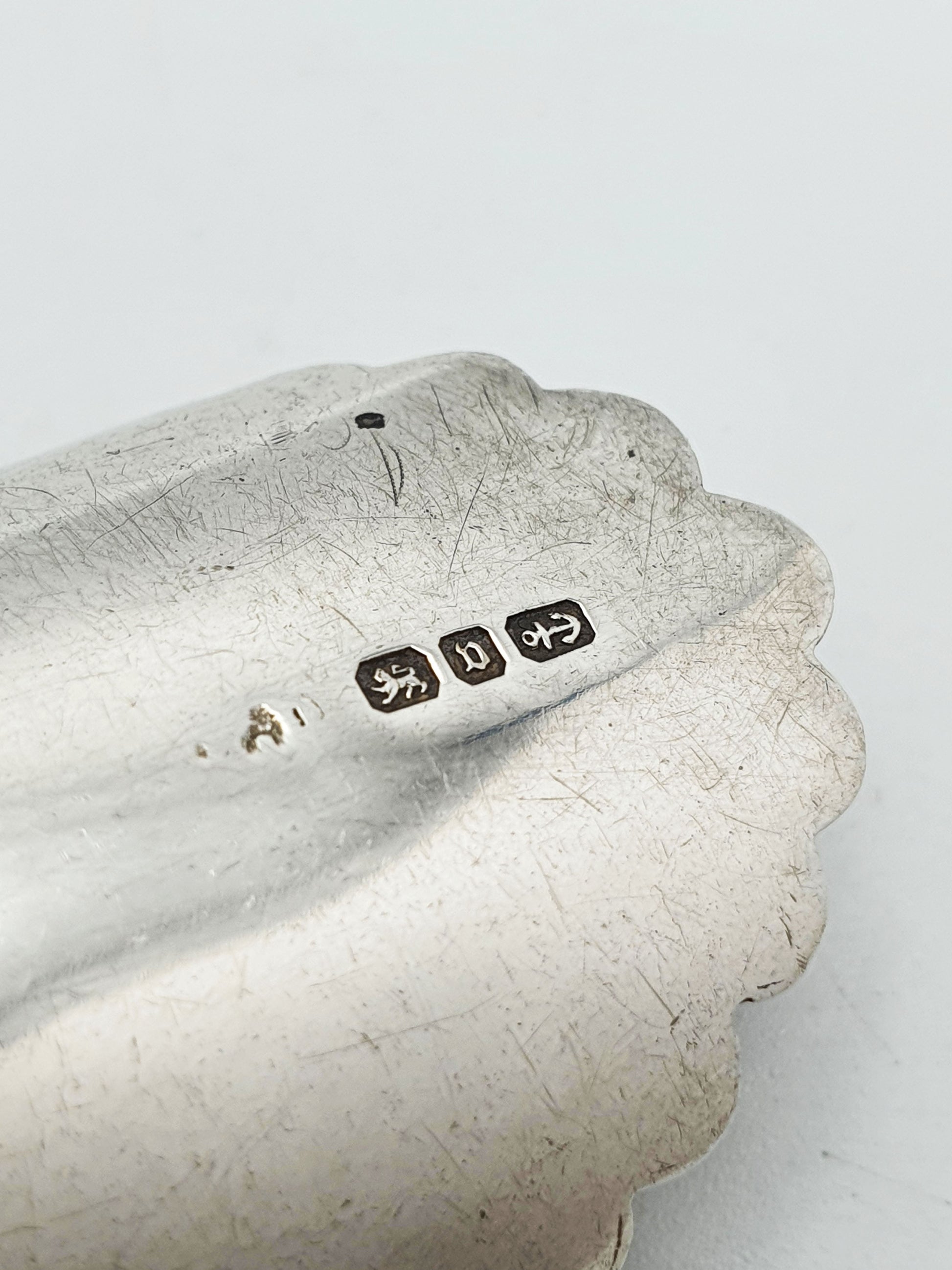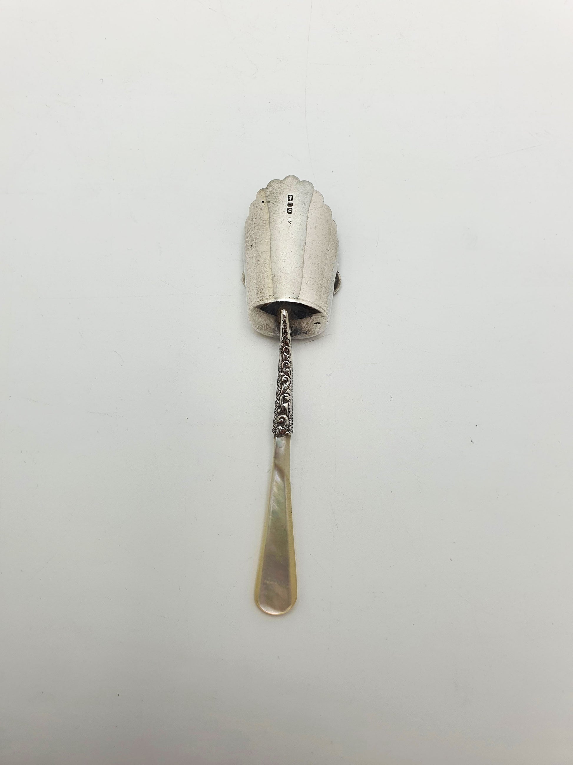 In good condition – The silver shows some age-appropriate surface wear and minor patina. The engraved decoration remains crisp and clearly defined. The mother-of-pearl handle is intact with a smooth finish and attractive natural iridescence.