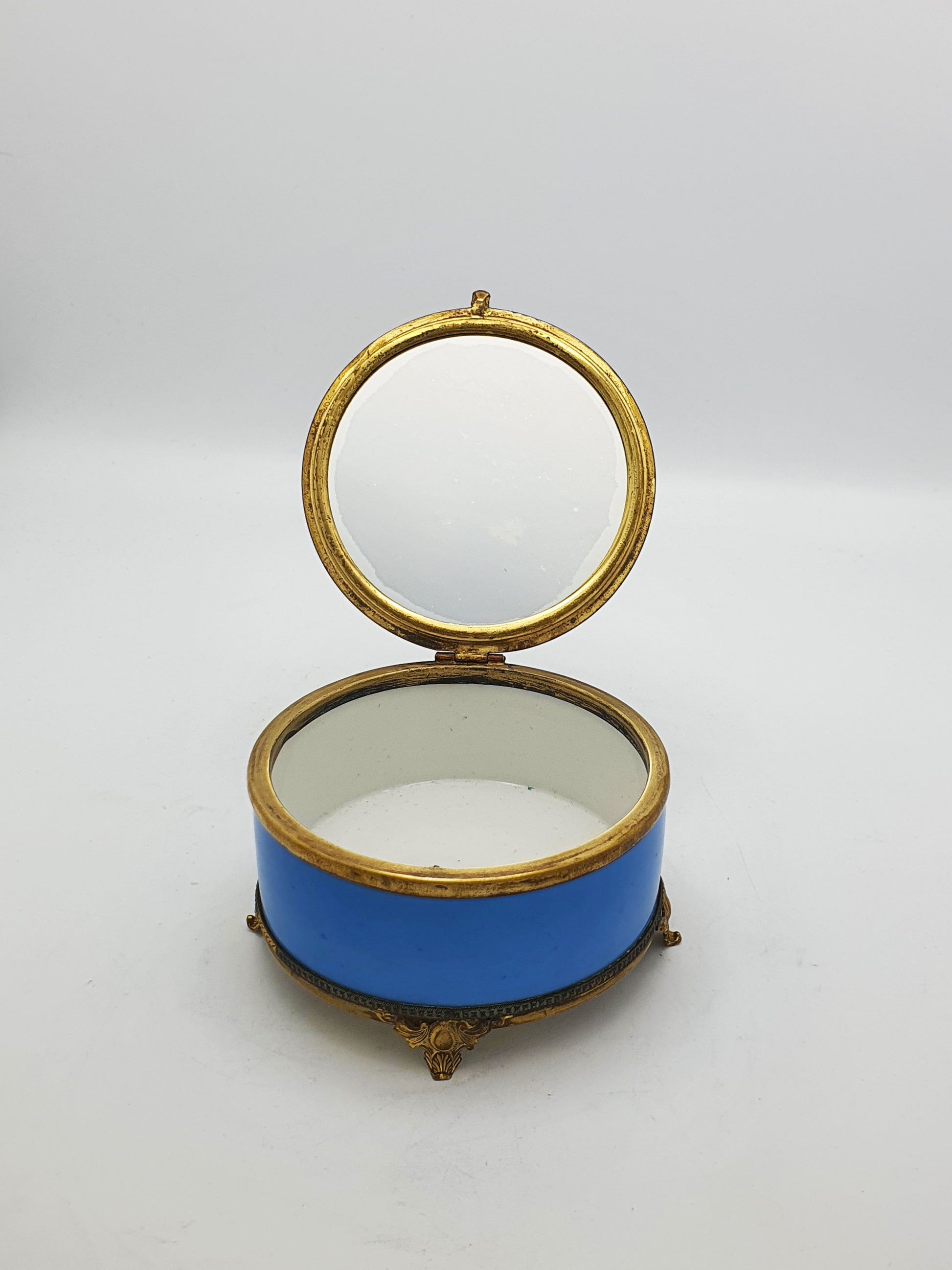A Gorgeous Antique French Limoges-Style Porcelain Jewellery Box featuring a beautifully hand-painted scene of a gentleman bowing to a lady in period dress. This delicate piece is framed in a vivid cobalt blue and trimmed with ornate gilded brass. The hinged lid opens to reveal a pristine white interior and a mirrored underside, perfect for storing cherished keepsakes with a touch of historical flair.