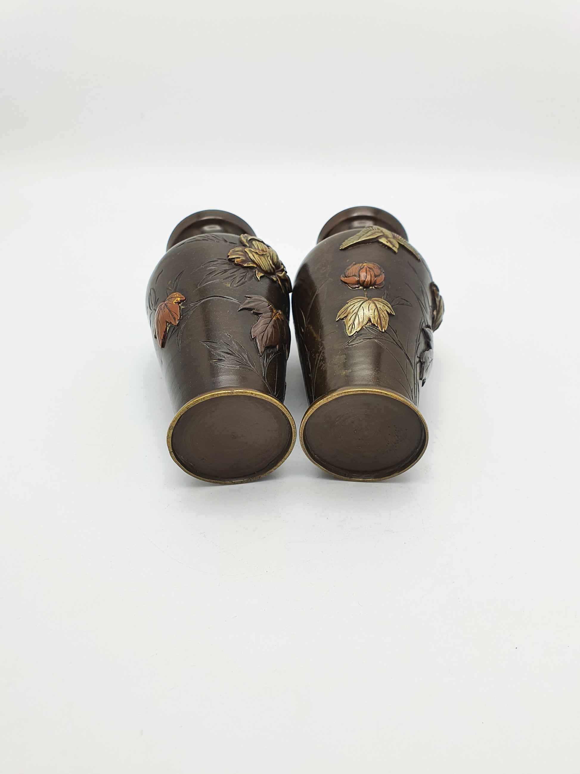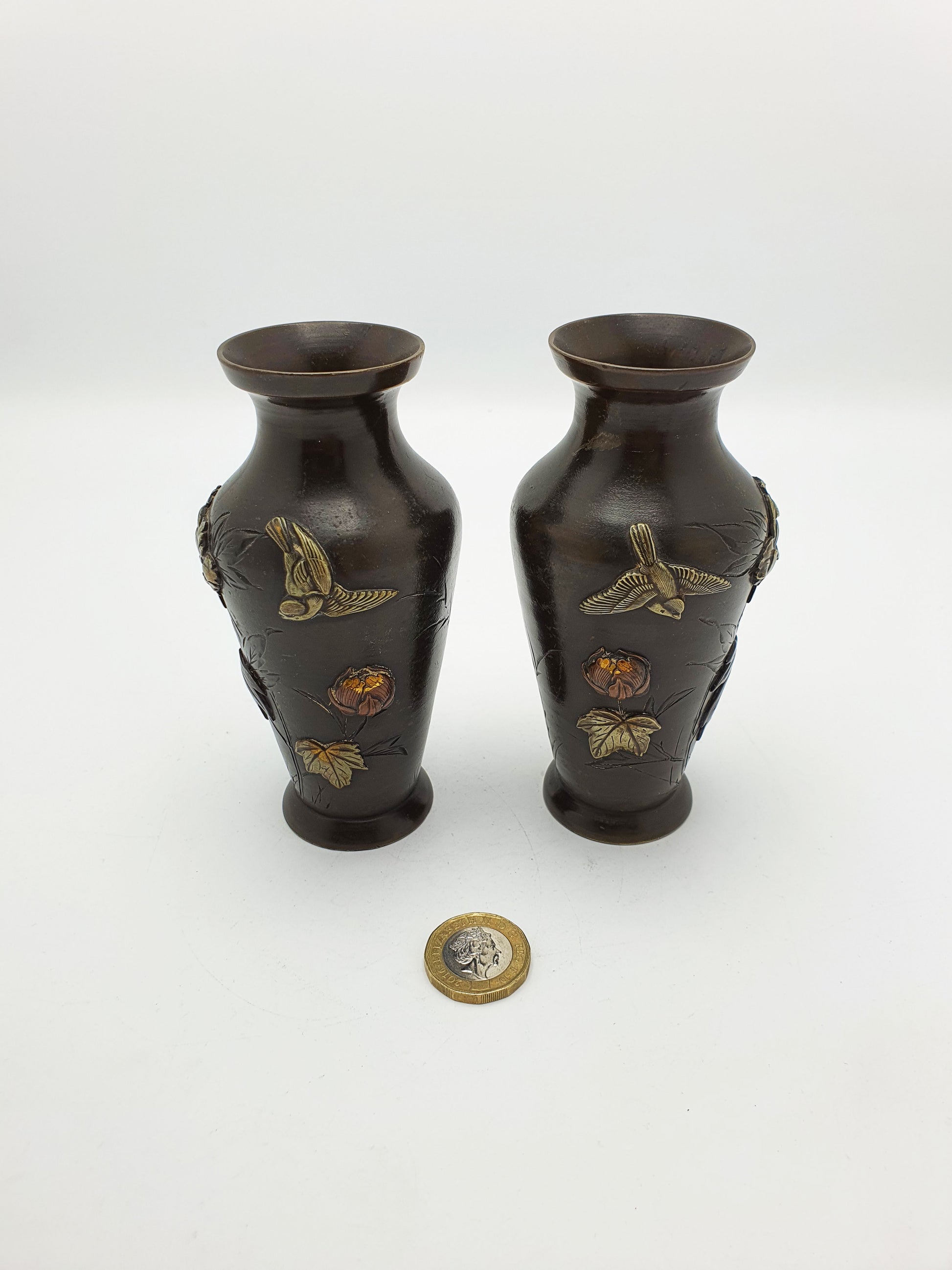 A Pretty Pair of Japanese Mixed Metal Miniature Vases crafted from dark bronze and delicately accented, each vase features detailed motifs of birds in flight and blossoming flora giving them a highly detailed, textured finish – circa 1900.