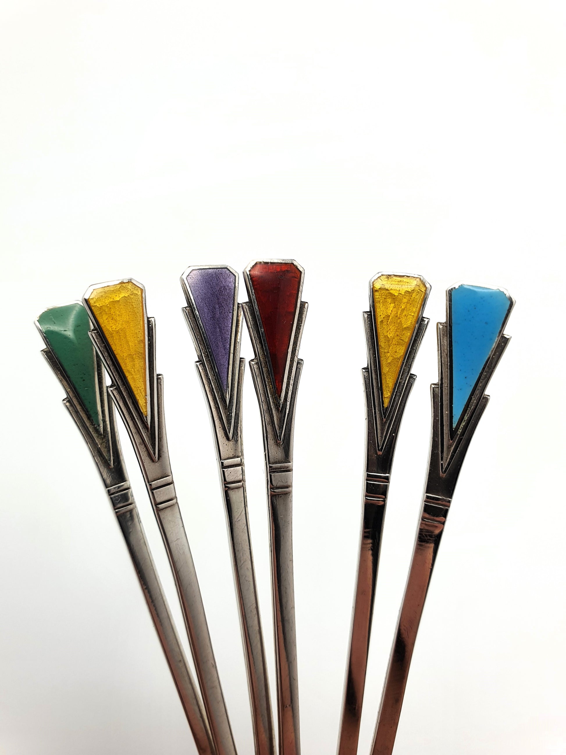 Boxed set of Six Pretty Silver and Coloured Enamelled Art Deco Teaspoons. Marked ‘D & F’ for Deakin & Francis Ltd for Birmingham, 1938.