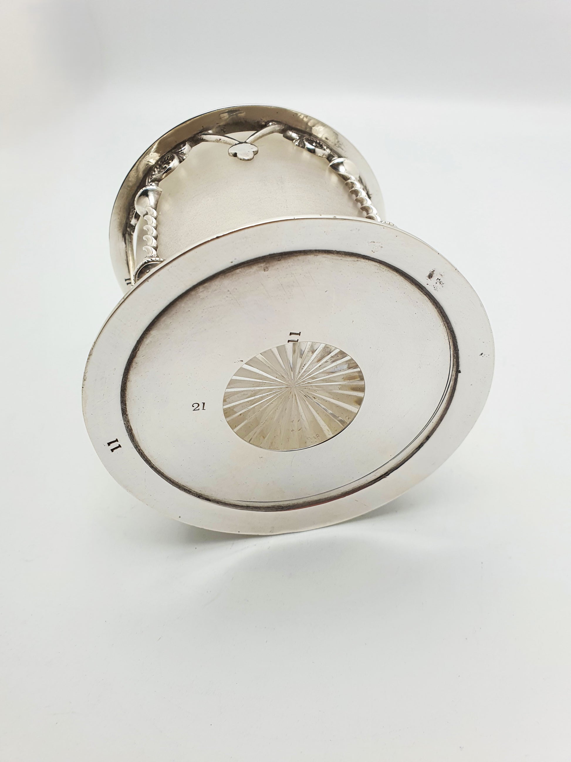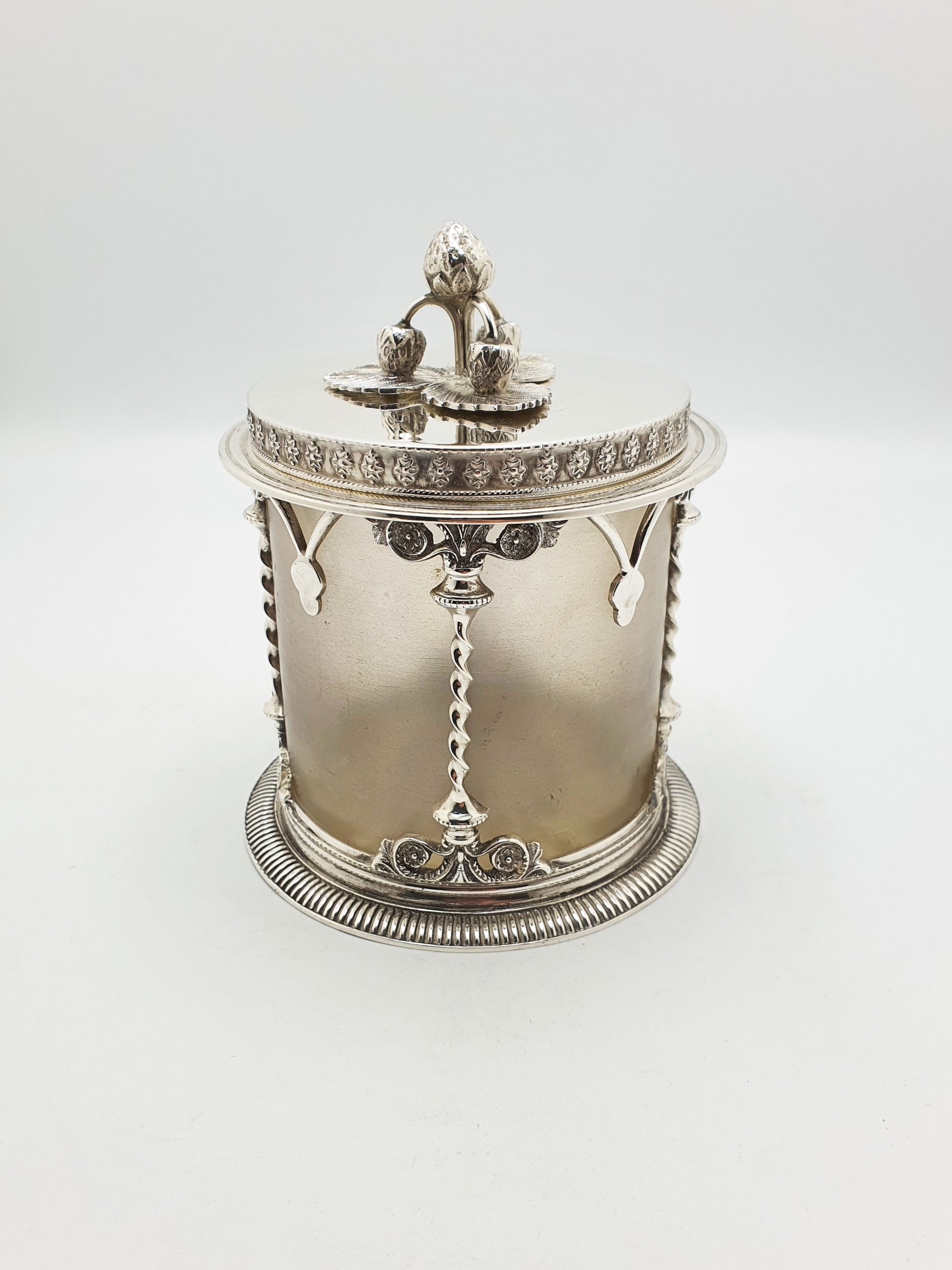 A Pretty Victorian Jam/Preserve Pot. This piece is a delightful example of Victorian design, featuring a beautifully cast strawberry finial, finely ribbed base, and intricate foliate scrollwork. The frosted glass body sits snugly within an elaborate silver-plated frame and is topped with a lid that lifts to reveal a cut glass starburst base.