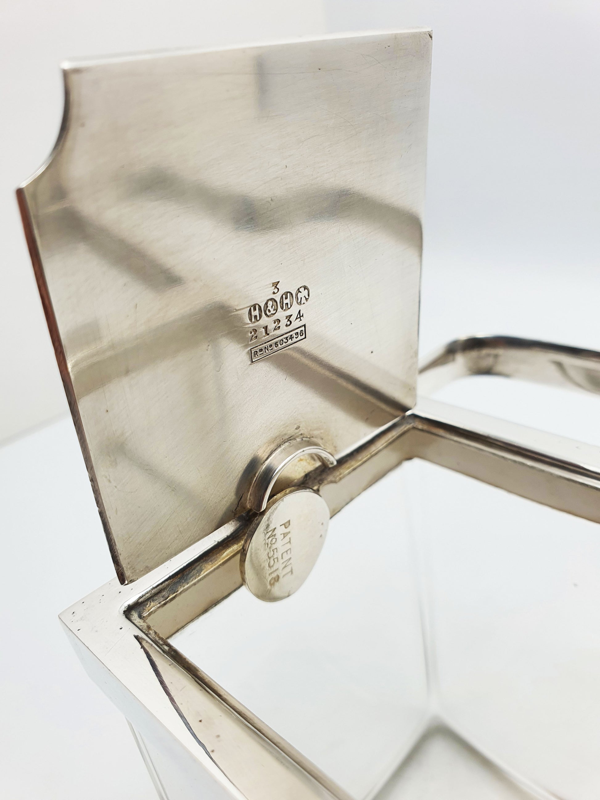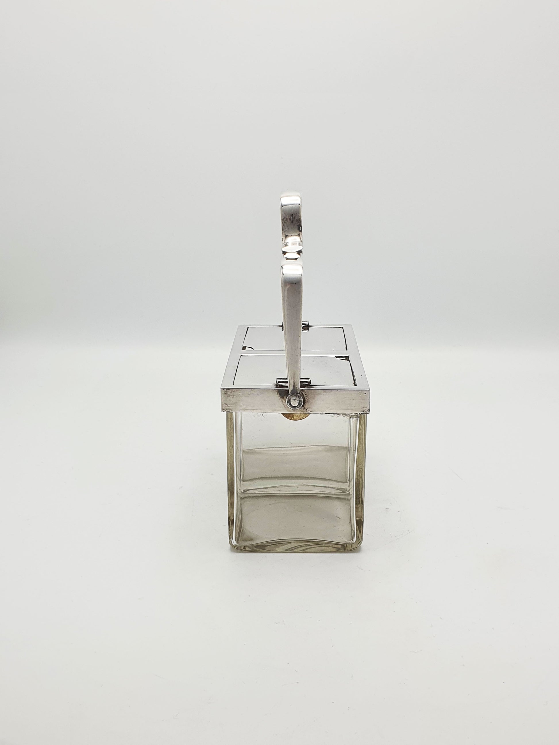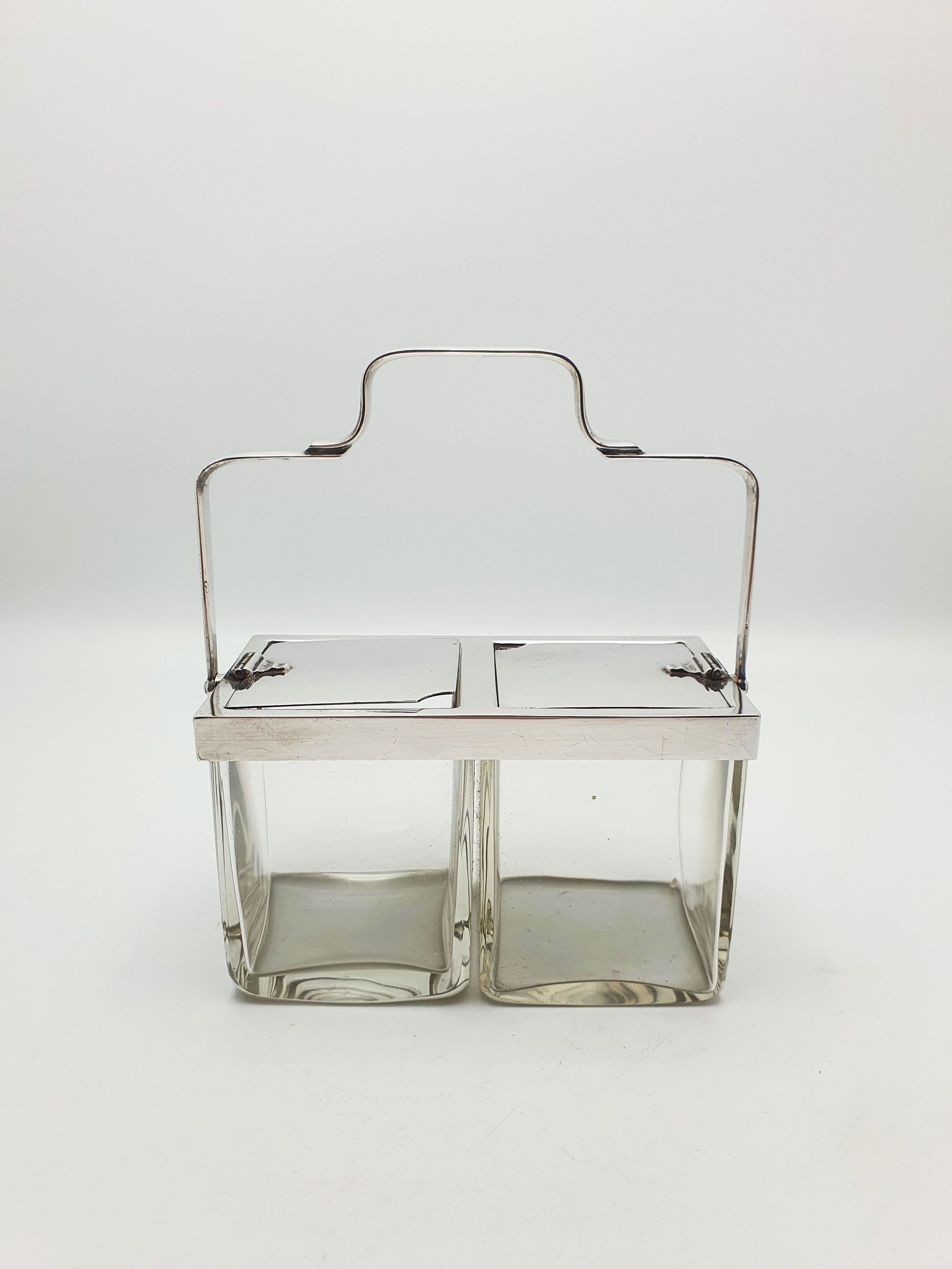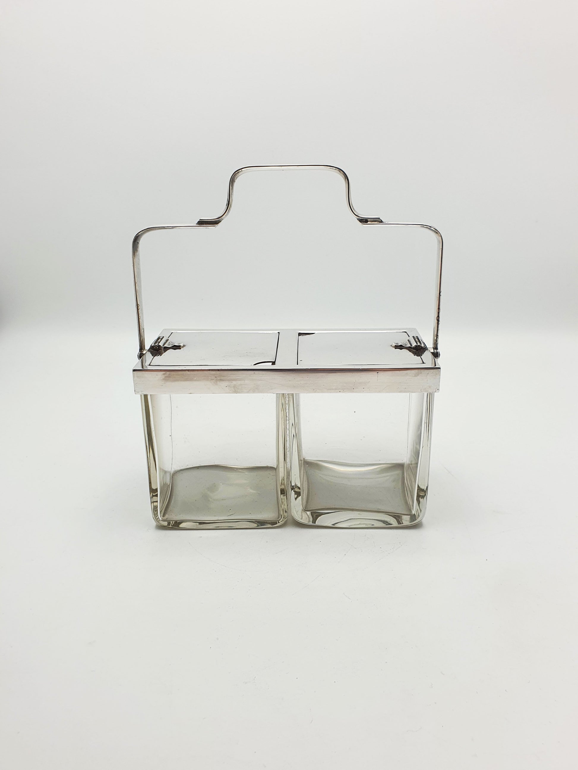A Rare Antique Silver-Plated Double Preserve Jar beautifully engineered by renowned British silversmiths Hukin & Heath. It features a silver-plated frame with hinged lids covering two square glass jars. Each hinged lid opens with a smooth action when the carrying handle is rotated down, aided by a clever patented thumb-tab system – circa 1920.