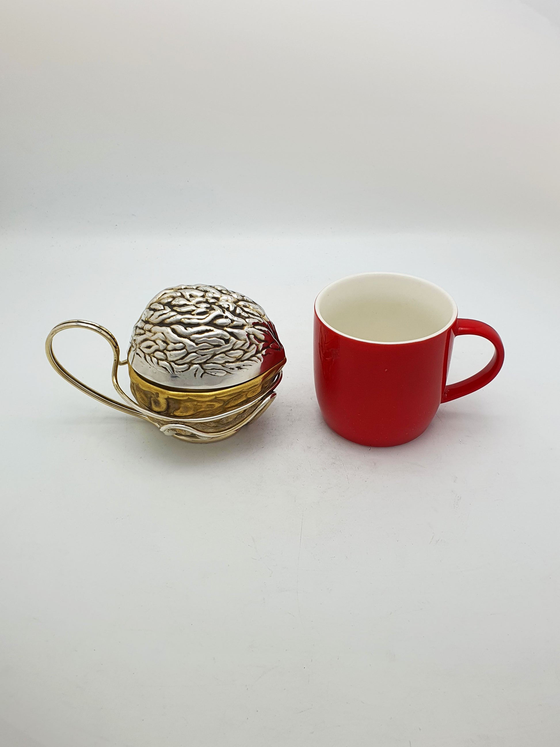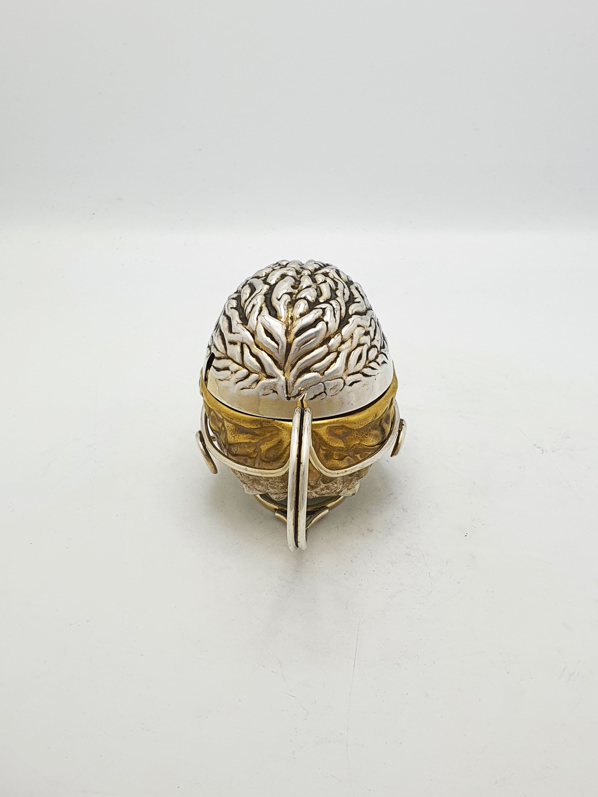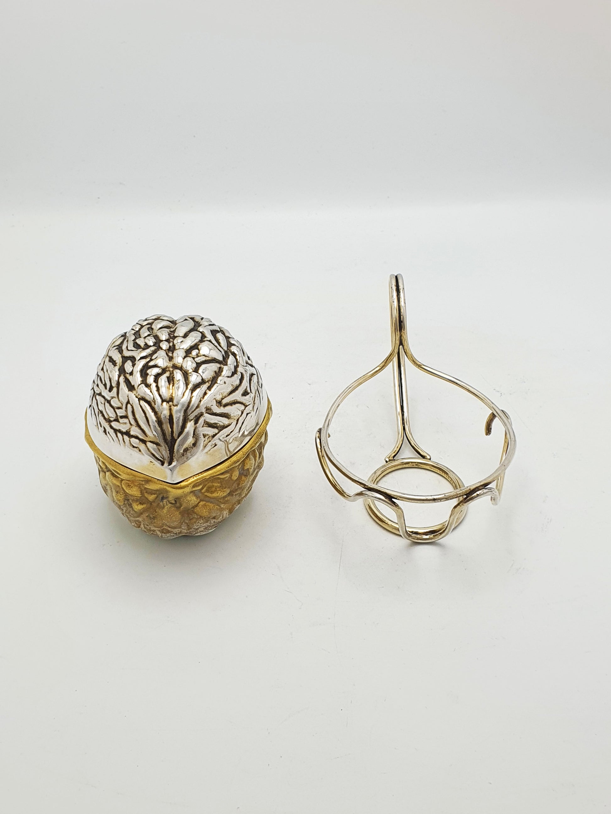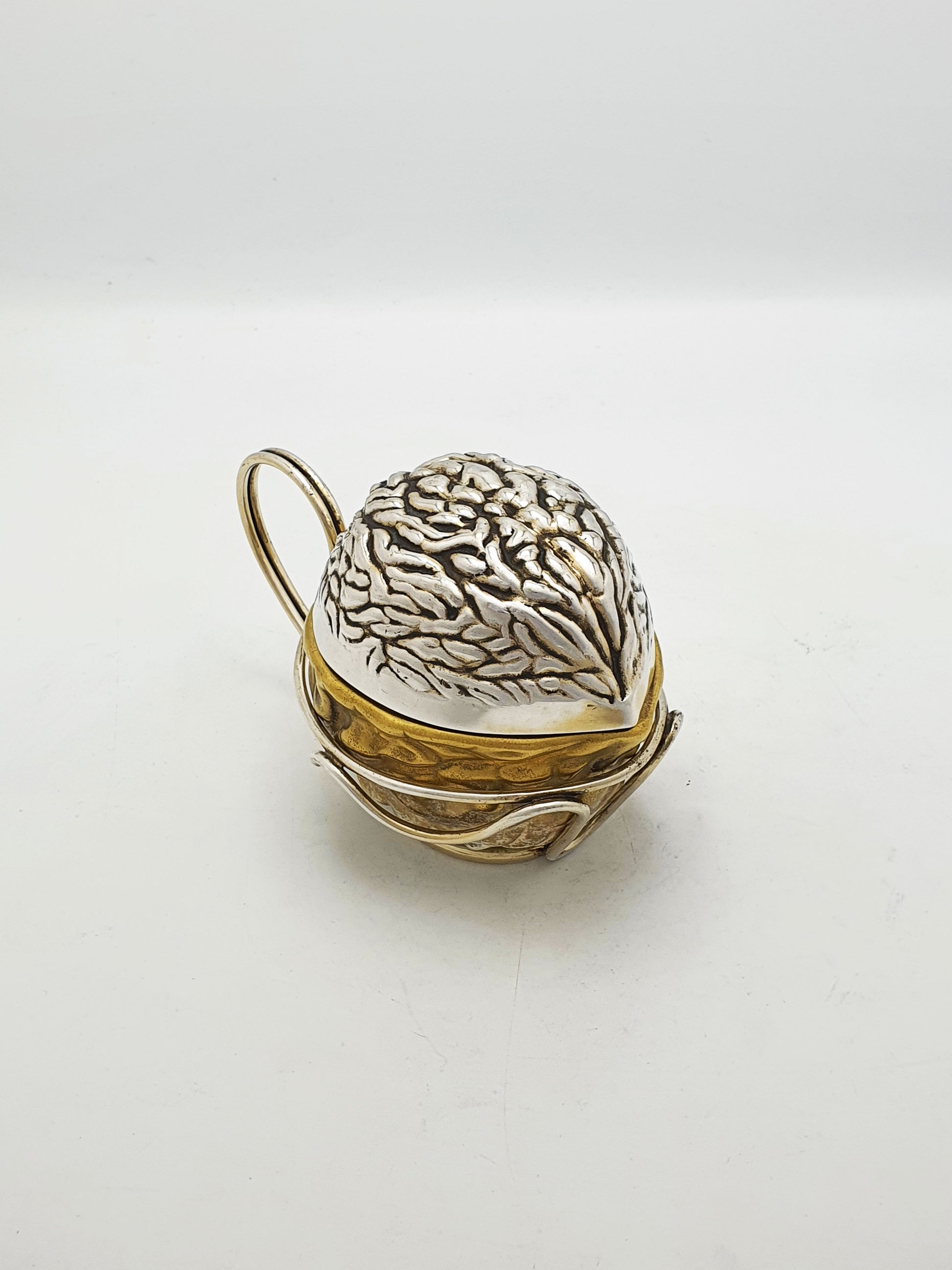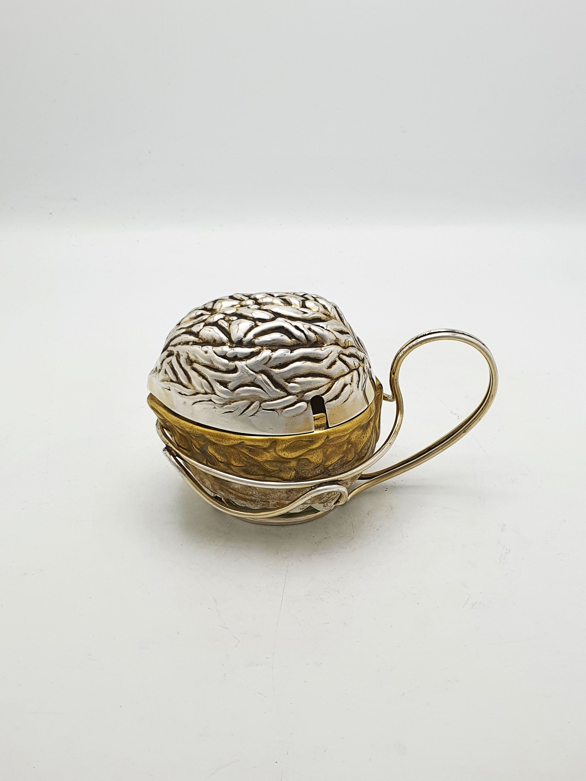 An exceptionally whimsical and rare Victorian condiment holder by Coalport, modelled as a naturalistic walnut and fitted with a richly decorative silver plated lid, gilt interior, and its original silver plated wirework stand. This imaginative table piece combines fine English porcelain with metalwork in a delightfully organic form, embodying both the aesthetic sensibilities and table customs of the late 19th century.