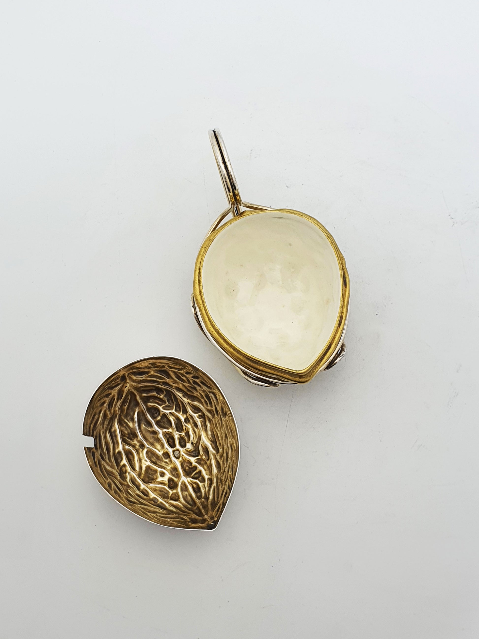 In good condition – In very good antique condition. The porcelain walnut base is intact with no chips or cracks, showing gentle age-related wear. The silver plated lid retains its detail with light surface wear and a warm patina. No structural issues. This is a highly displayable and usable piece.
