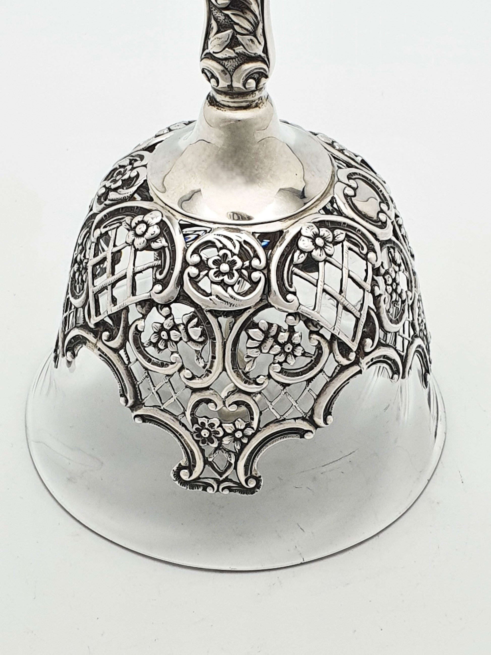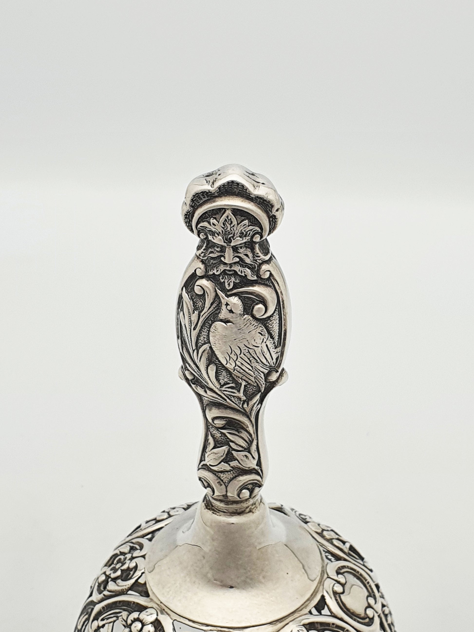 A Gorgeous Rare Sterling Silver and Glass Table Bell featuring an elaborate openwork design and a figural handle. The handle is topped with a bearded figure in a cap, possibly representing a classical or mythological character, adding personality and historic flair. Below the face, a beautifully detailed bird is nestled among flowing leaves and scrollwork, making the handle as decorative as it is functional. The bell’s skirt features ornate latticework interwoven with flowers and foliage, creating a light, airy appearance. Hallmarked for London, 1896.