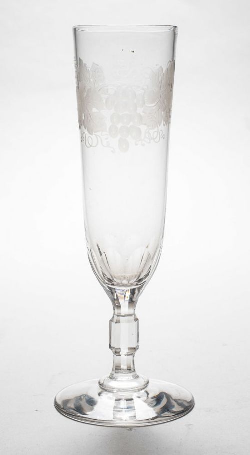A beautiful Set of 4 Edwardian Champagne Flutes with etched grape & vine decoration - circa 1905 FREE UK & Worldwide Delivery Measurements Height 7 ( approx. 18cm ) Diameter across top 2 (Approx. 5 cm) Diameter of base 3 ( approx. 7.5 cm ) Total weight 310g In good condition - no cracks or chips to the glass