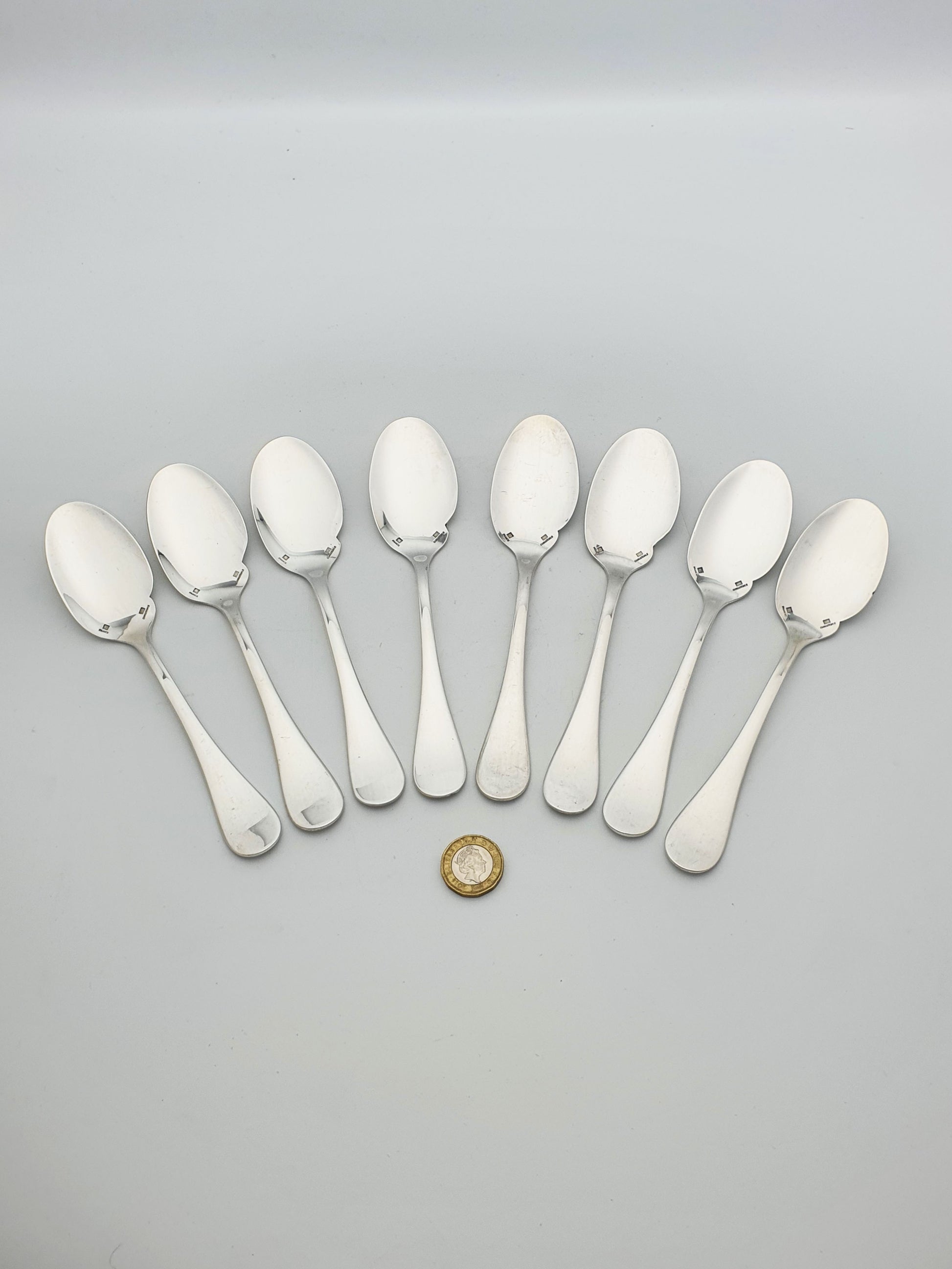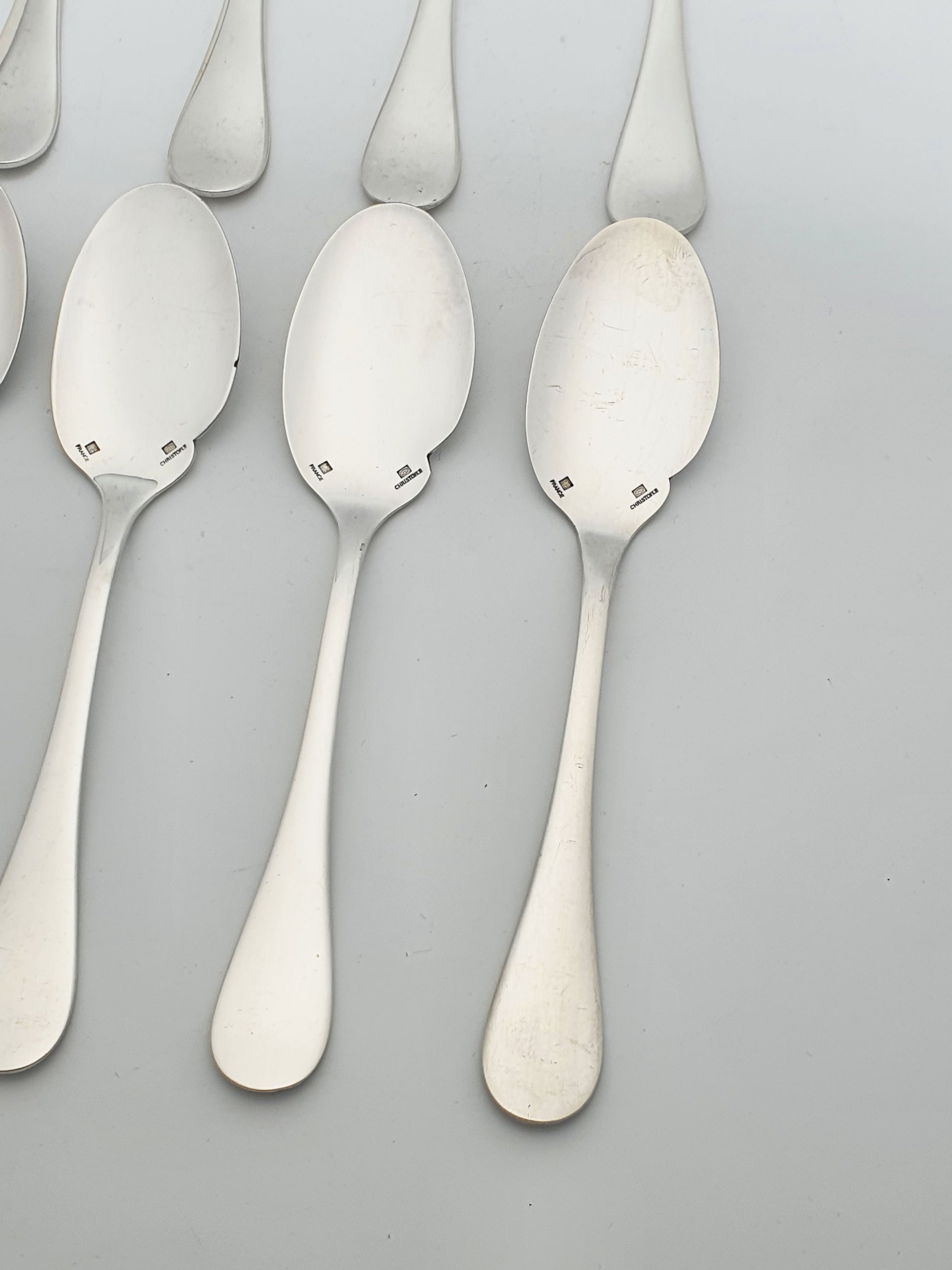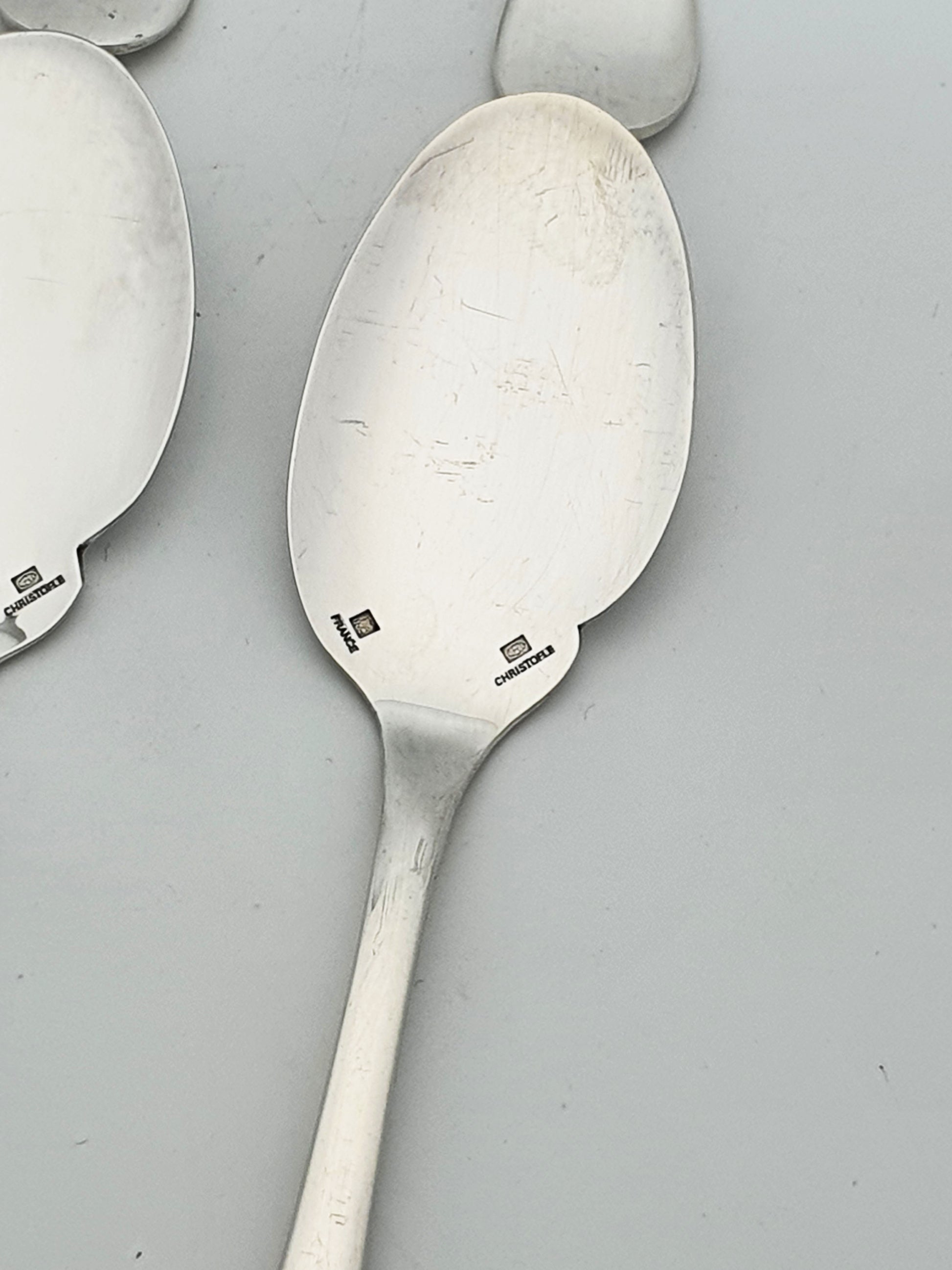 Set of 8 French Silver-Plated Dessert Spoons by Christofle. Hallmarked with the Christofle name and signature square cartouche – circa 1960.