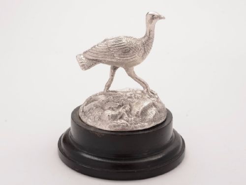 A nice silver plated emu trophy nicely modelled which sits on black wooden base with un-engraved plaque. Circa 1910 FREE worldwide delivery. Measurements: Height: 3 3/4 Diameter across base: 3 1/2 Weight: 241g In good condition - any dark areas are shadows from the photography there is no damage to the silver plate.