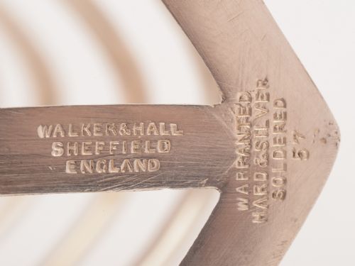 A nice English silver plated toast rack/letter rack of unusual design with loop handle and sits on 4 scroll feet. Made by the renowned maker Walker & Hall circa 1900. FREE worldwide delivery. Measurements: Height: 8 (approx 20cm) Length: 6 1/4 (approx 15.5cm) Width: 4 (approx 10cm) Weight: 315g In good condition - any dark areas are shadows from the photography there is no damage to the silver plate.