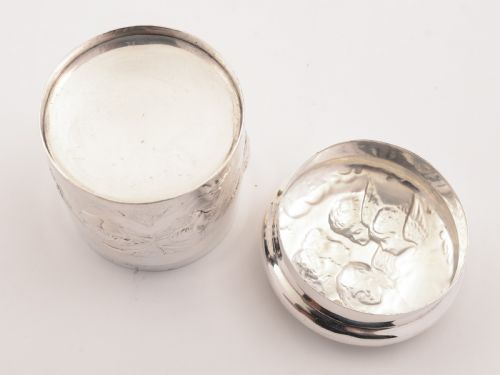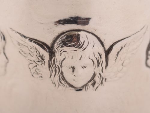 A sweet English silver table jar with embossed angel faces to main body pull-off lid and is hallmarked London 1900. FREE worldwide delivery. Measurements: Height: 3 (approx 7.5cm) Diameter across top: 2 3/4 (approx 6.75cm) Weight: 110g (approx 3.5 troy ounces) FREE worldwide delivery. Any dark areas are shadows from the photography.