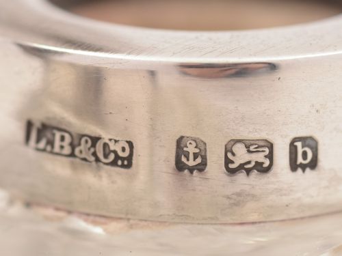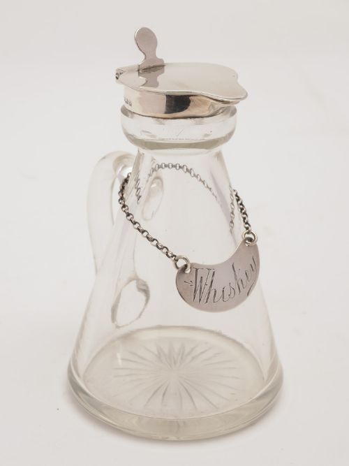 A nice English silver topped whiskey tot with silver whiskey decanter label flip-up lid strap glass handle and star cut base. The silver lid is hallmarked Birmingham 1910 and the decanter label is hallmarked London 1910 both are marked H&H for the renowned maker Hukin & Heath. Worldwide first class tracked and signed for delivery is included in the price. Measurements: Height: 4 (approx 10cm) Width (with handle): 3 3/4 (approx 9.5cm) Diameter of base: 2 1/4 (approx 7cm) Total weight: 175g Make your bottle of whiskey last that little bit longer with this fabulous tot! In good condition - no chips or cracks to glass