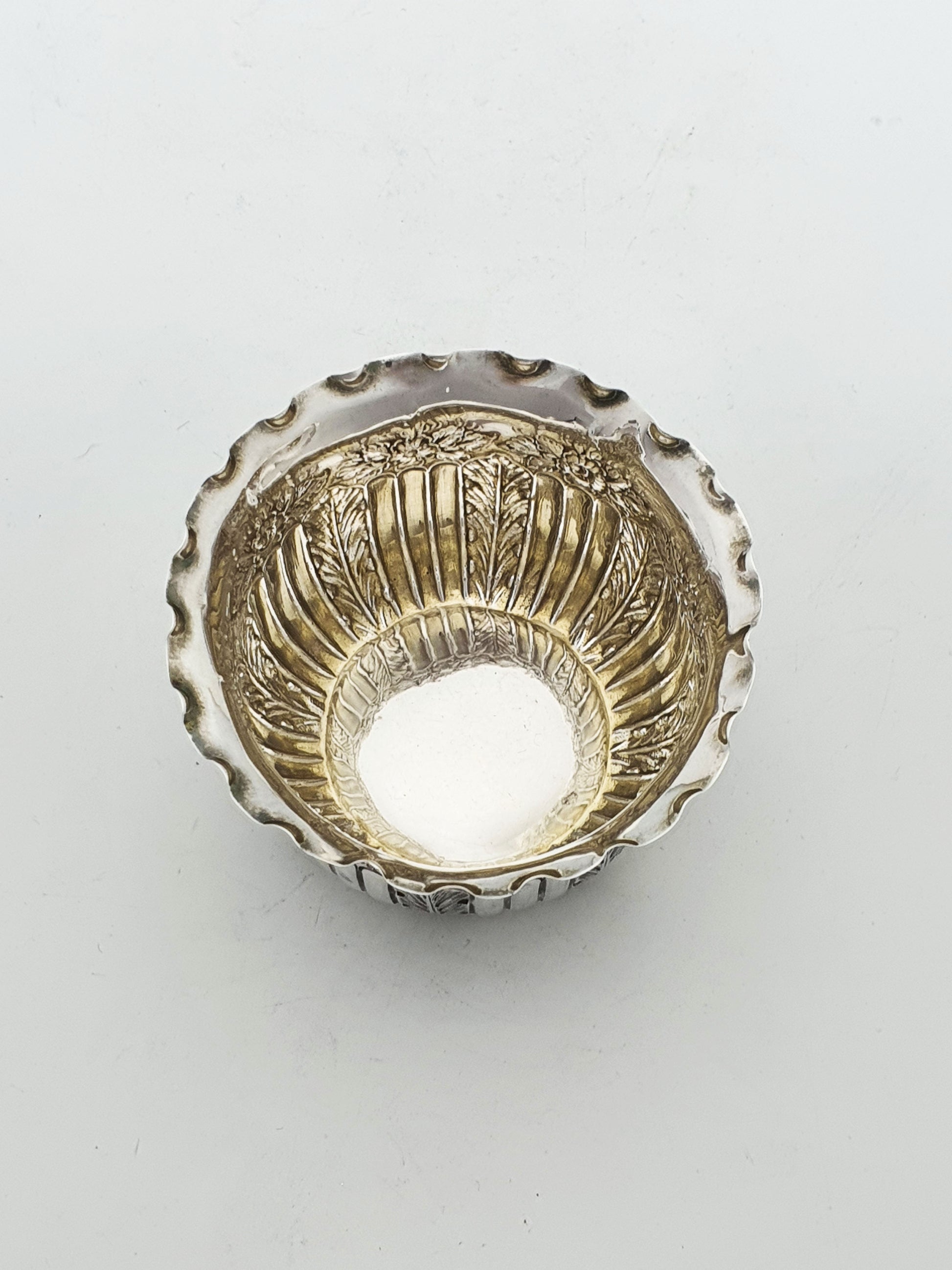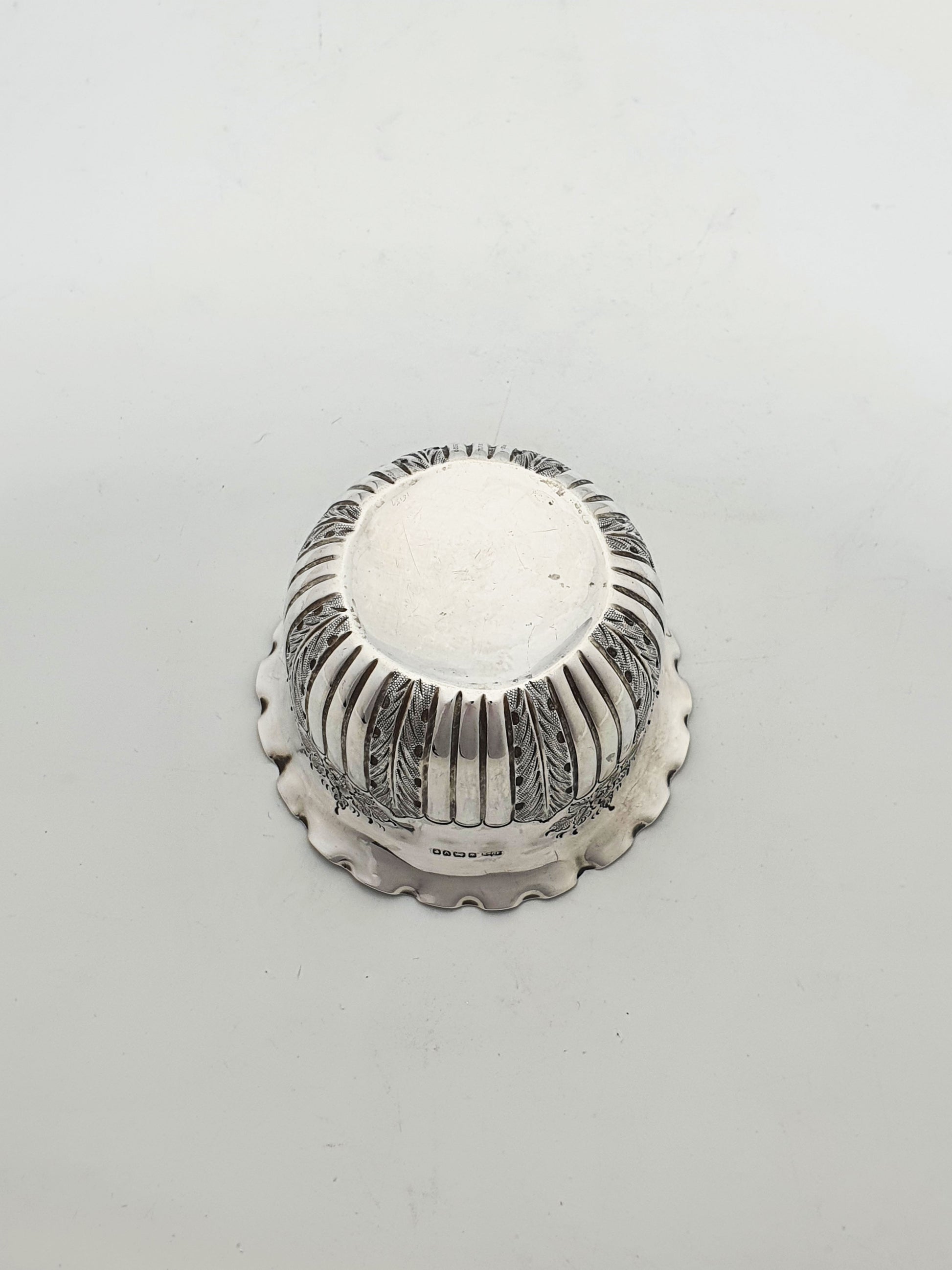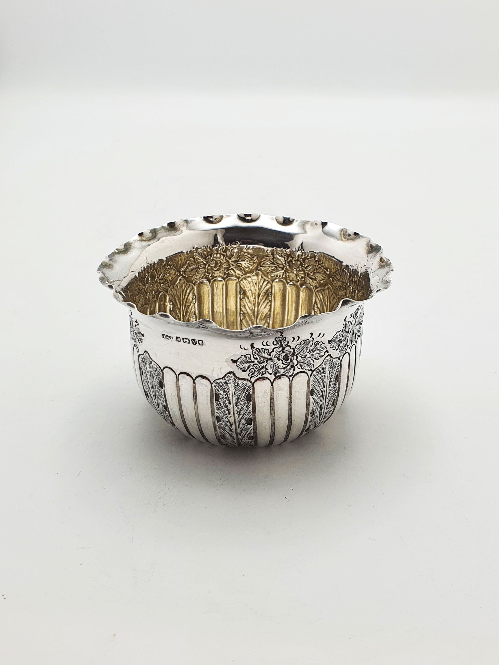 A Nice Small Antique Victorian Sterling Silver Bowl featuring bold vertical fluting interspersed with finely chased foliate and floral panels, creating a rich texture around the body. A gently scalloped rim adds an extra note of elegance, making it a decorative yet functional piece suitable for any fine collection or table setting. Hallmarked for Sheffield, 1888.