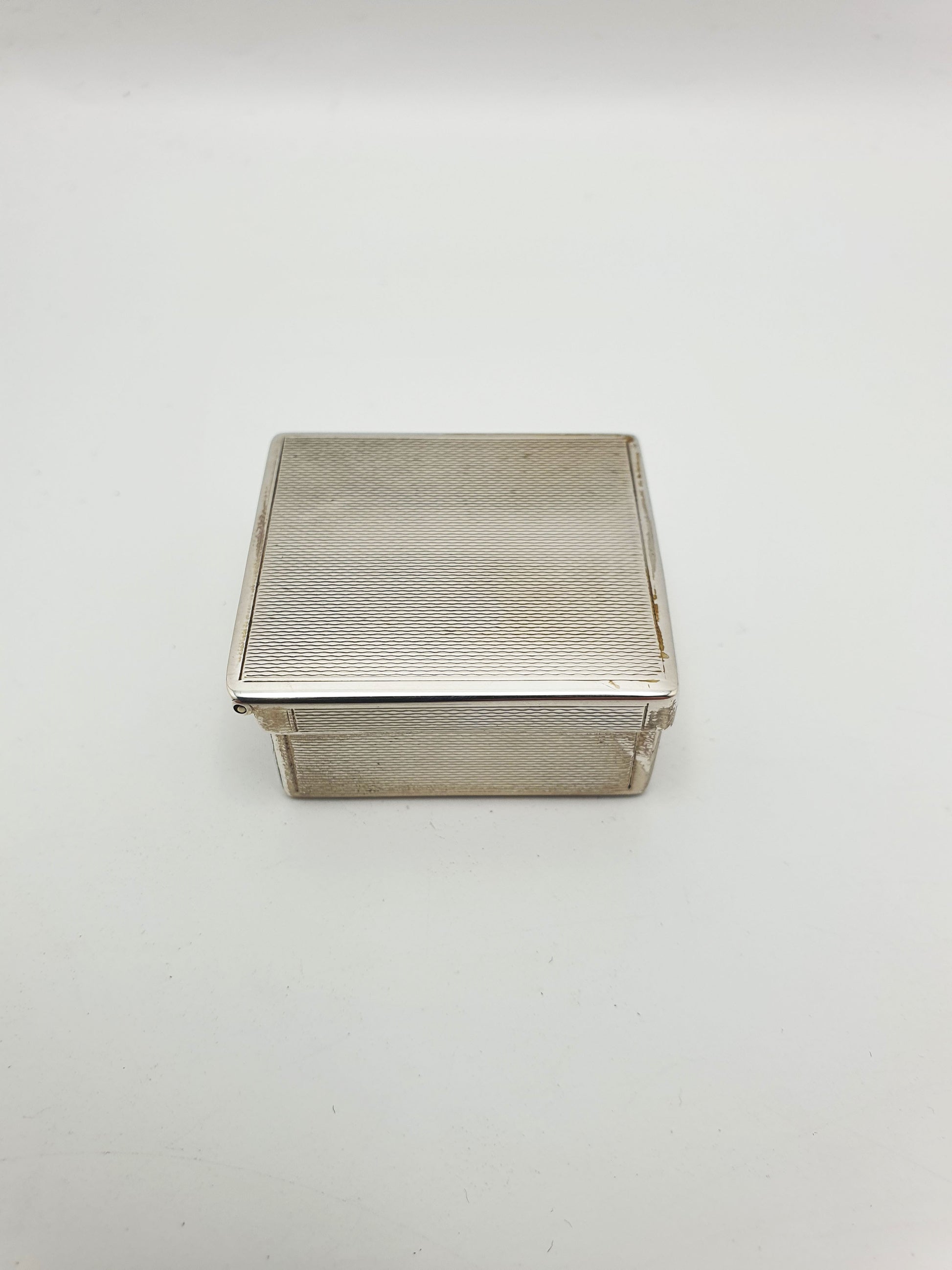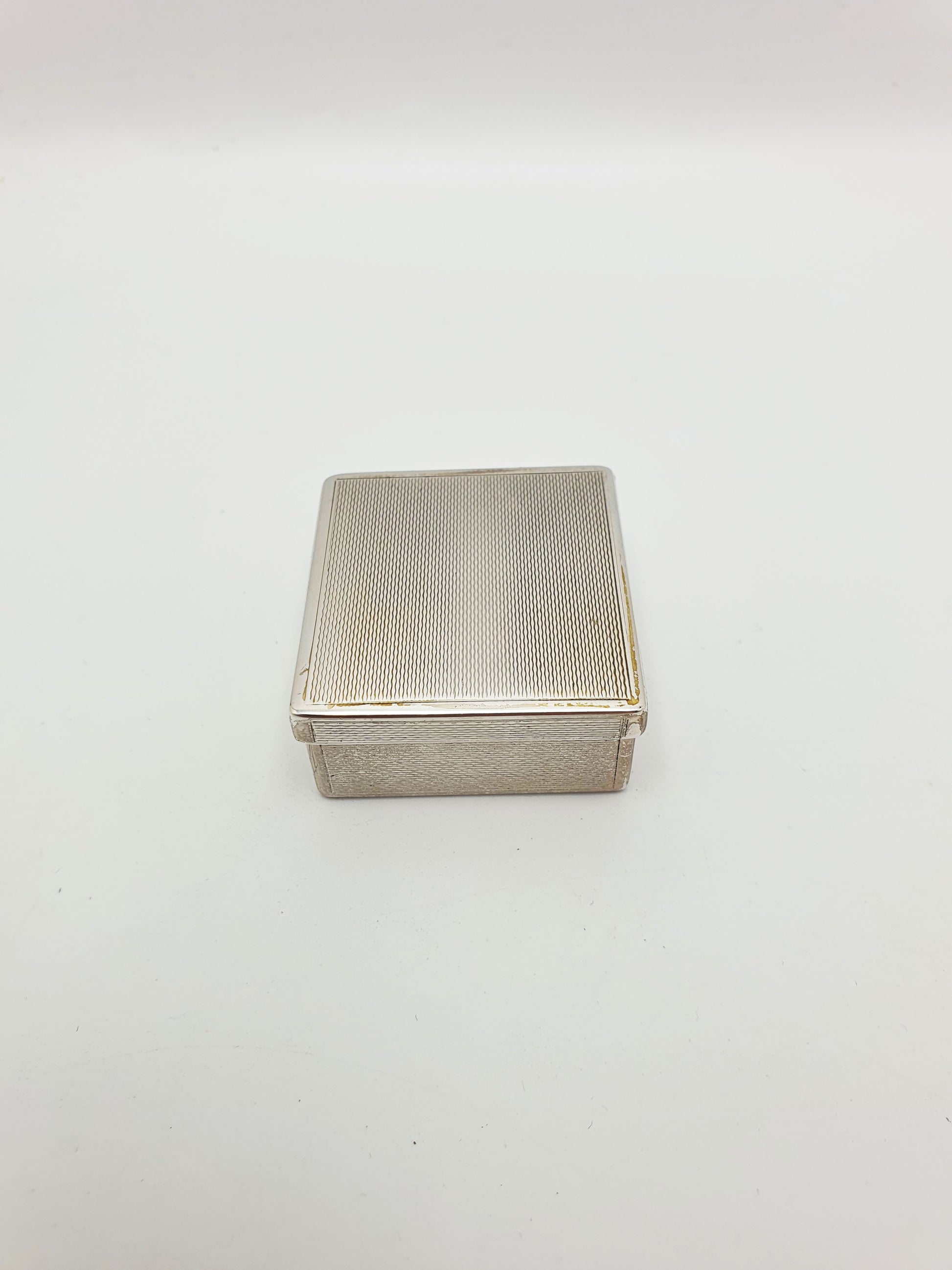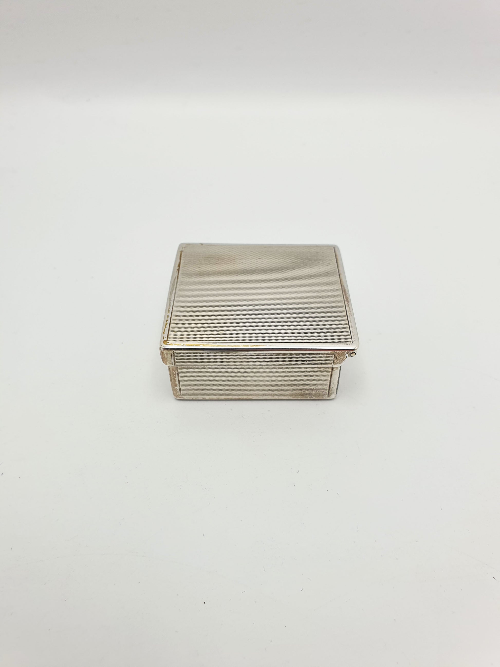 The box has a hinged lid and is compact yet weighty, ideal for use as a snuff box, pill case, or keepsake container, and would suit both traditional and modern interiors with its clean-lined, engine-turned surface.