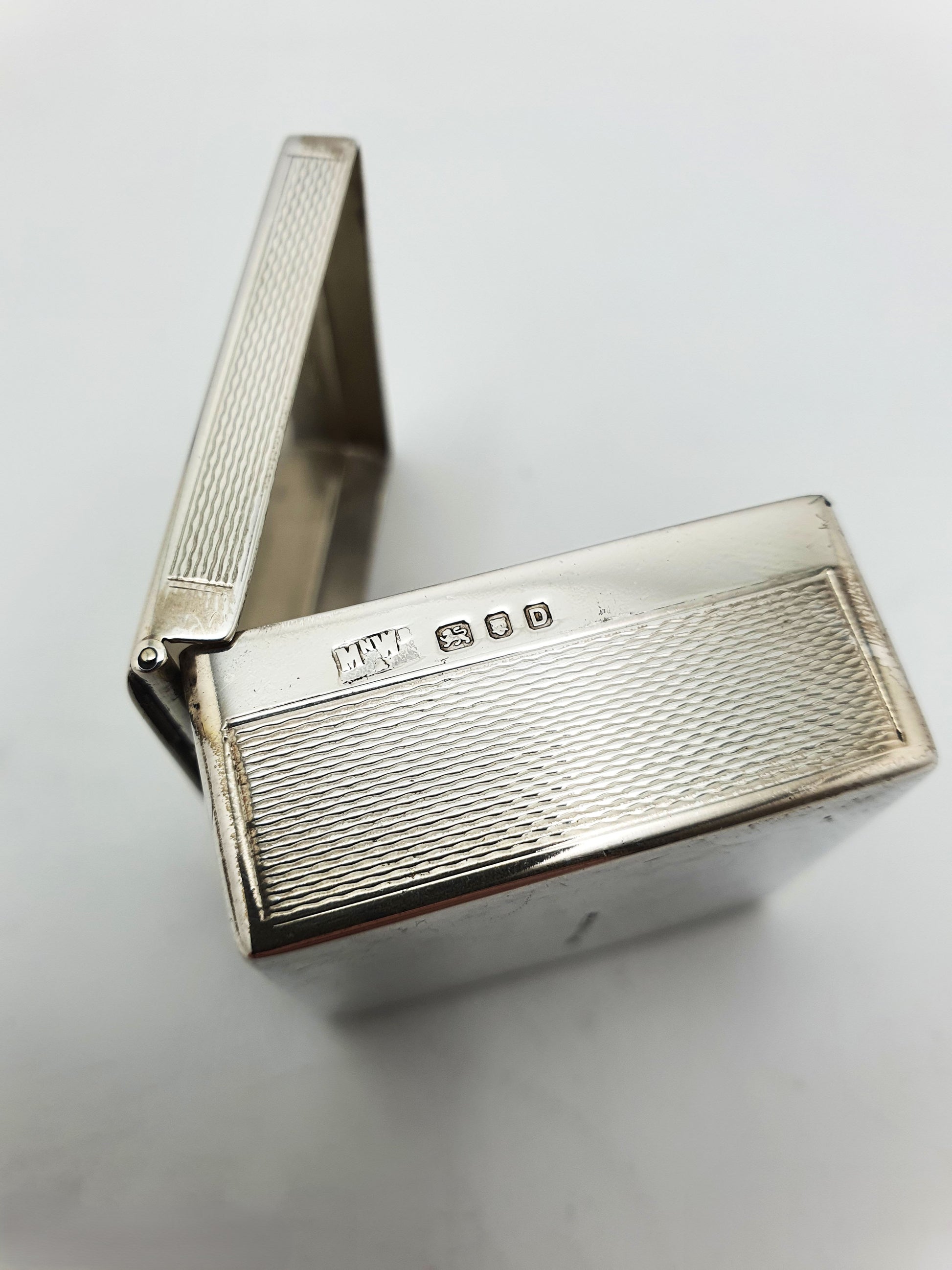 In good condition – Light surface marks consistent with age and use; engine-turned pattern remains sharp. Lid opens and closes smoothly with secure snap shut.