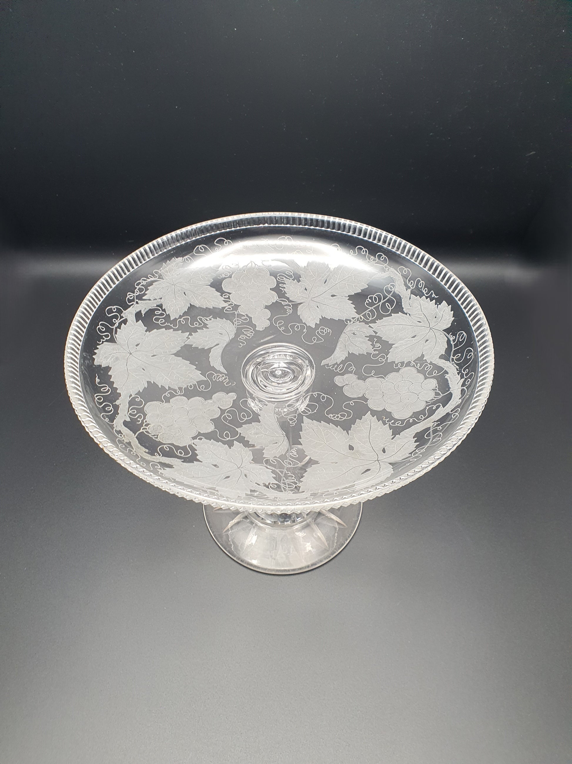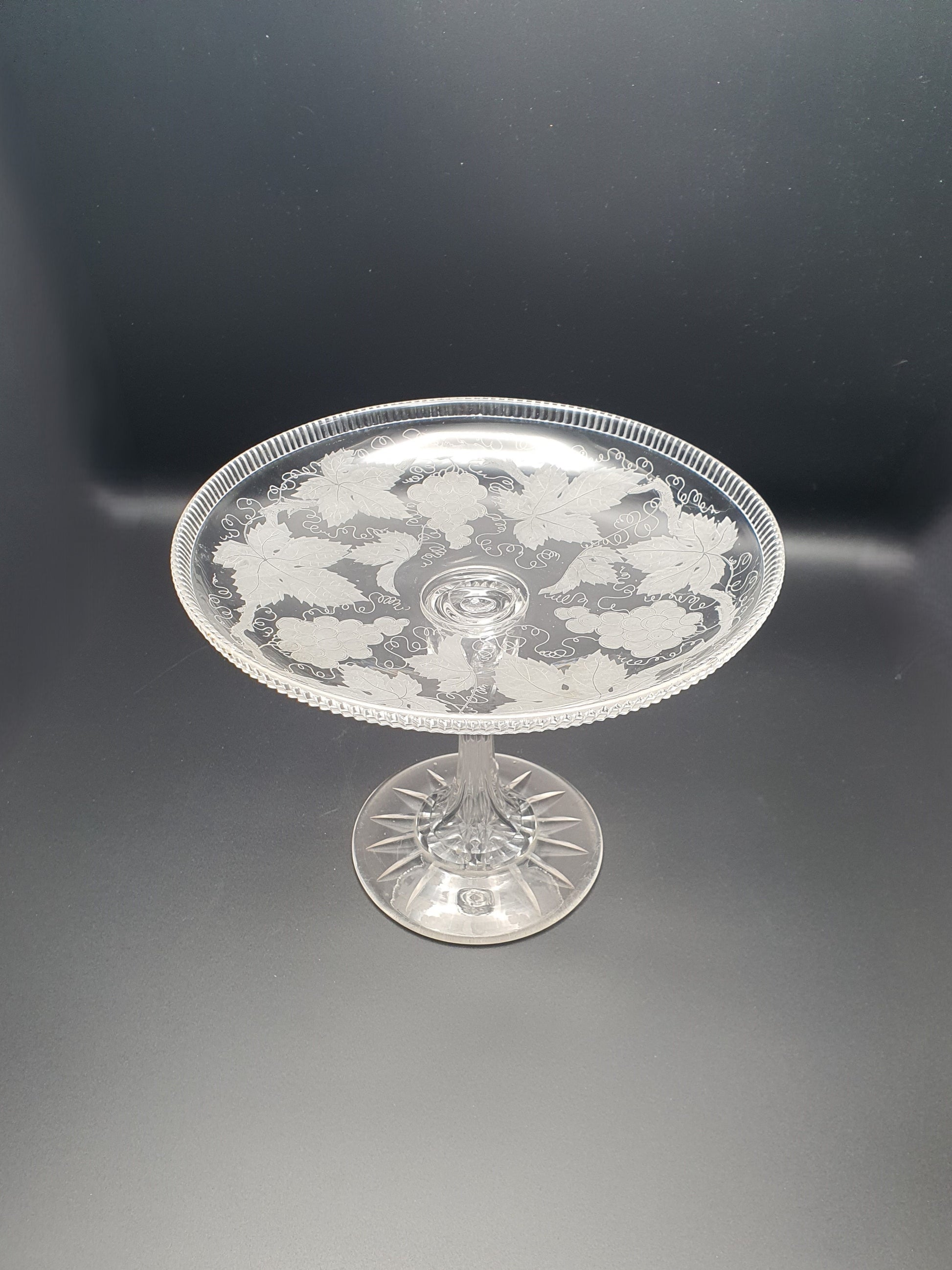 A Splendid Antique Victorian Etched Glass Comport / Tazza. The surface is richly decorated with finely etched grape clusters, curling vines, and wide vine leaves, rendered with delicate detail that reflects the high standards of Victorian glassmaking. The rim features a notched or sawtooth-style finish, which adds subtle sparkle and texture, catching the light beautifully. The slender stem gently flares into a wide, stable foot, making the piece well-balanced while maintaining its delicate profile. The underside of the foot is finished with a striking 16-point starburst cut, typical of finer Victorian glassware and a mark of quality.