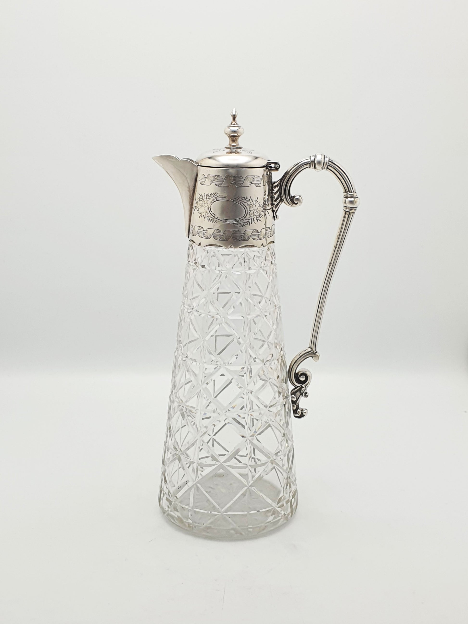 A Splendid Antique Victorian Claret Jug featuring a tapering conical body with a deep shaped diamond pattern, the jug is crowned with a hinged silver plated lid, ornate finial, and a beautifully cast handle - all hallmarks of classic late 19th-century craftsmanship. The silver plate mount is finely engraved with floral and foliate scrollwork and a central cartouche – circa 1880.