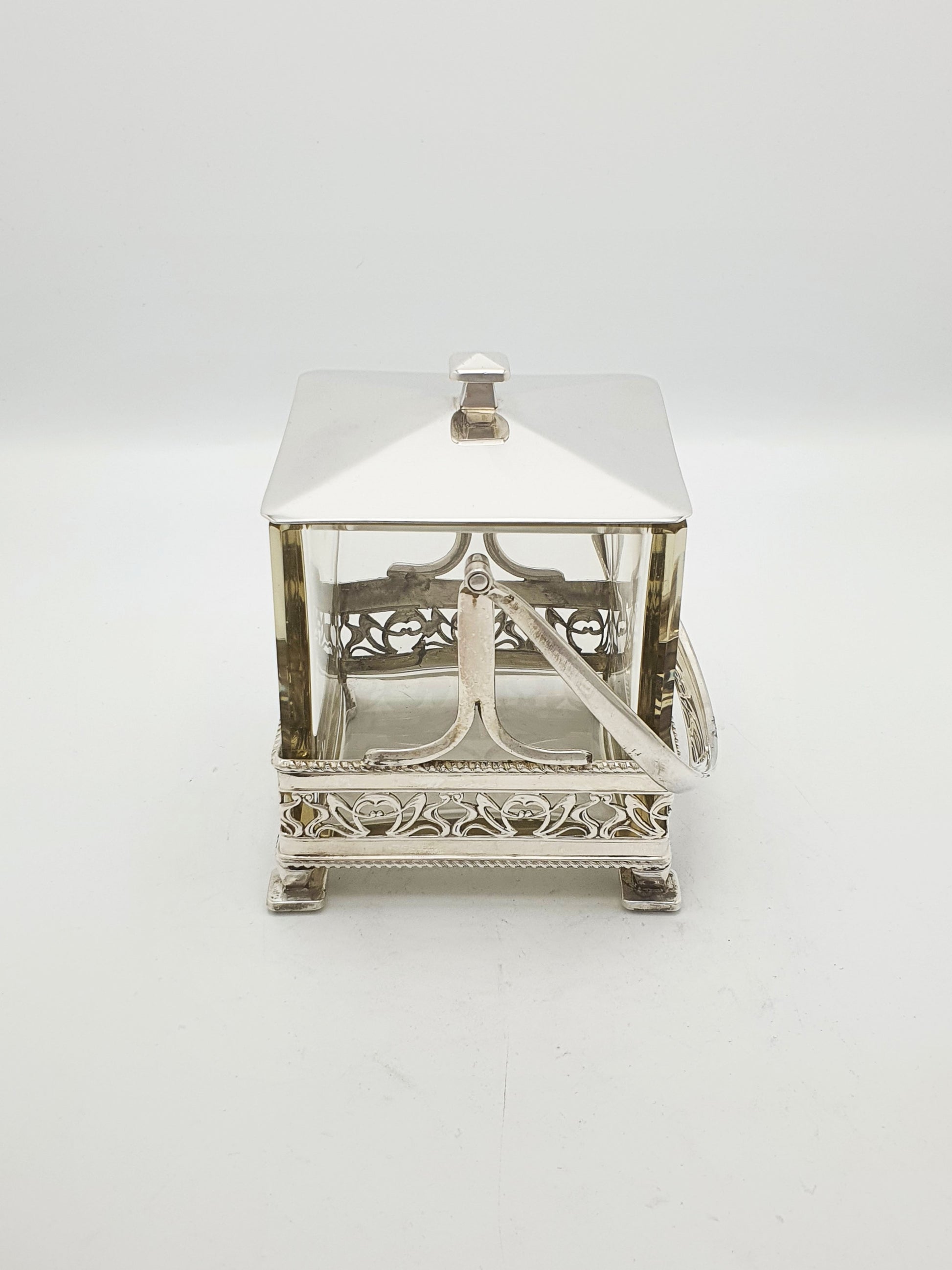 A Splendid Art Deco Silver Plate & Glass Biscuit Box featuring a finely crafted pierced silver-plated frame with floral detailing, square-footed supports, and a gracefully arched handle. It houses a thick, clear glass liner and a removable domed lid with a faceted finial – circa 1925.