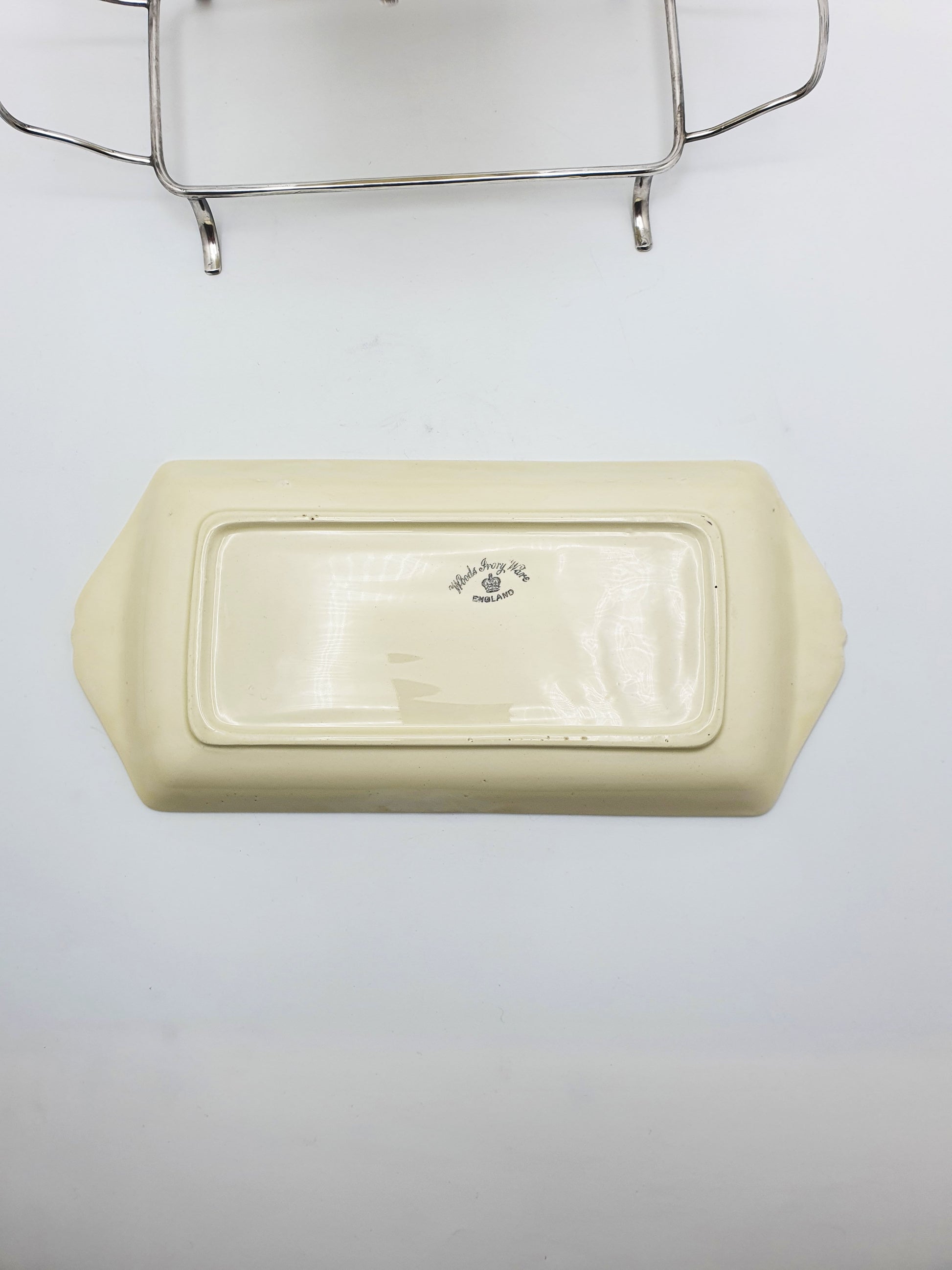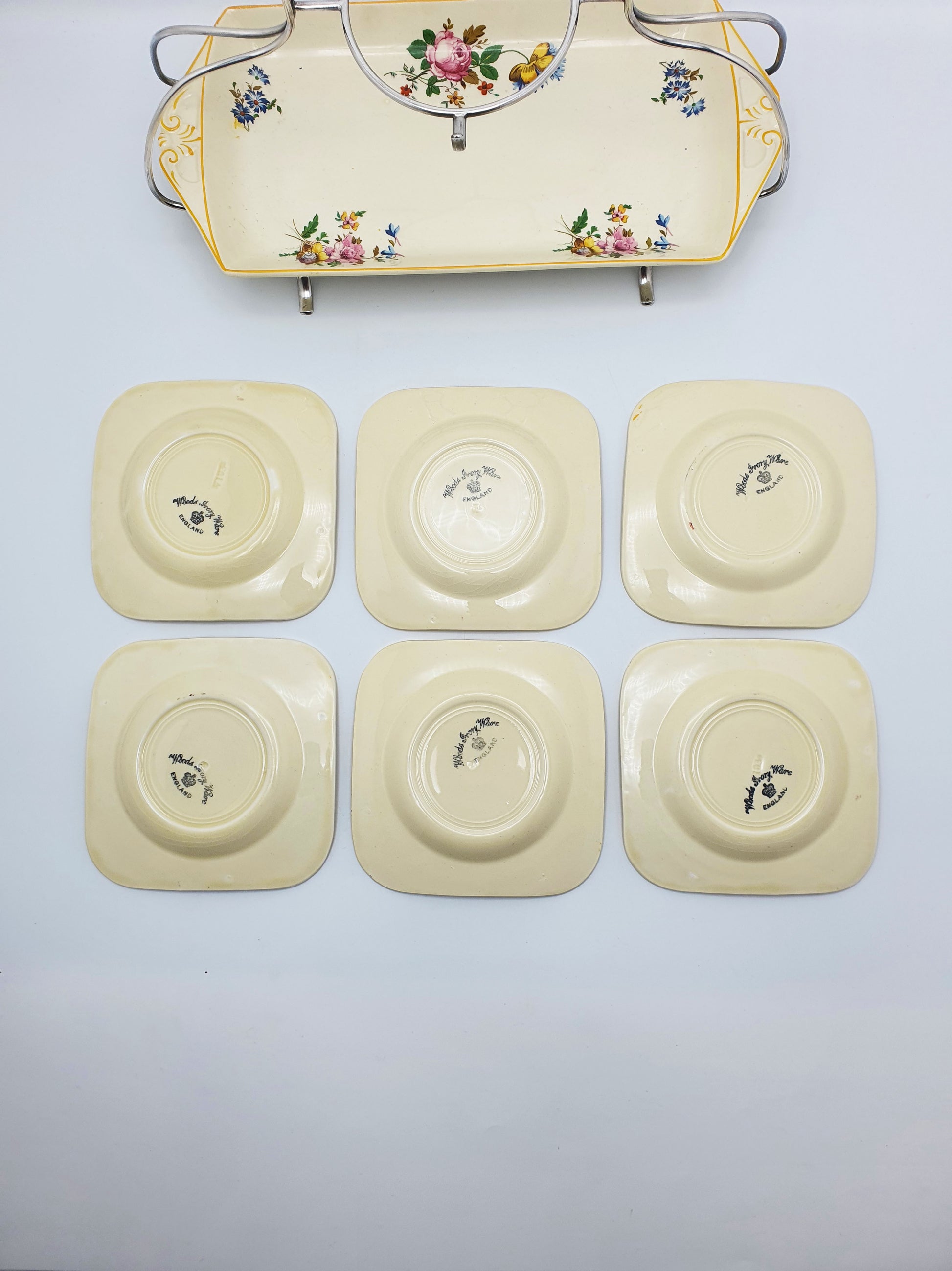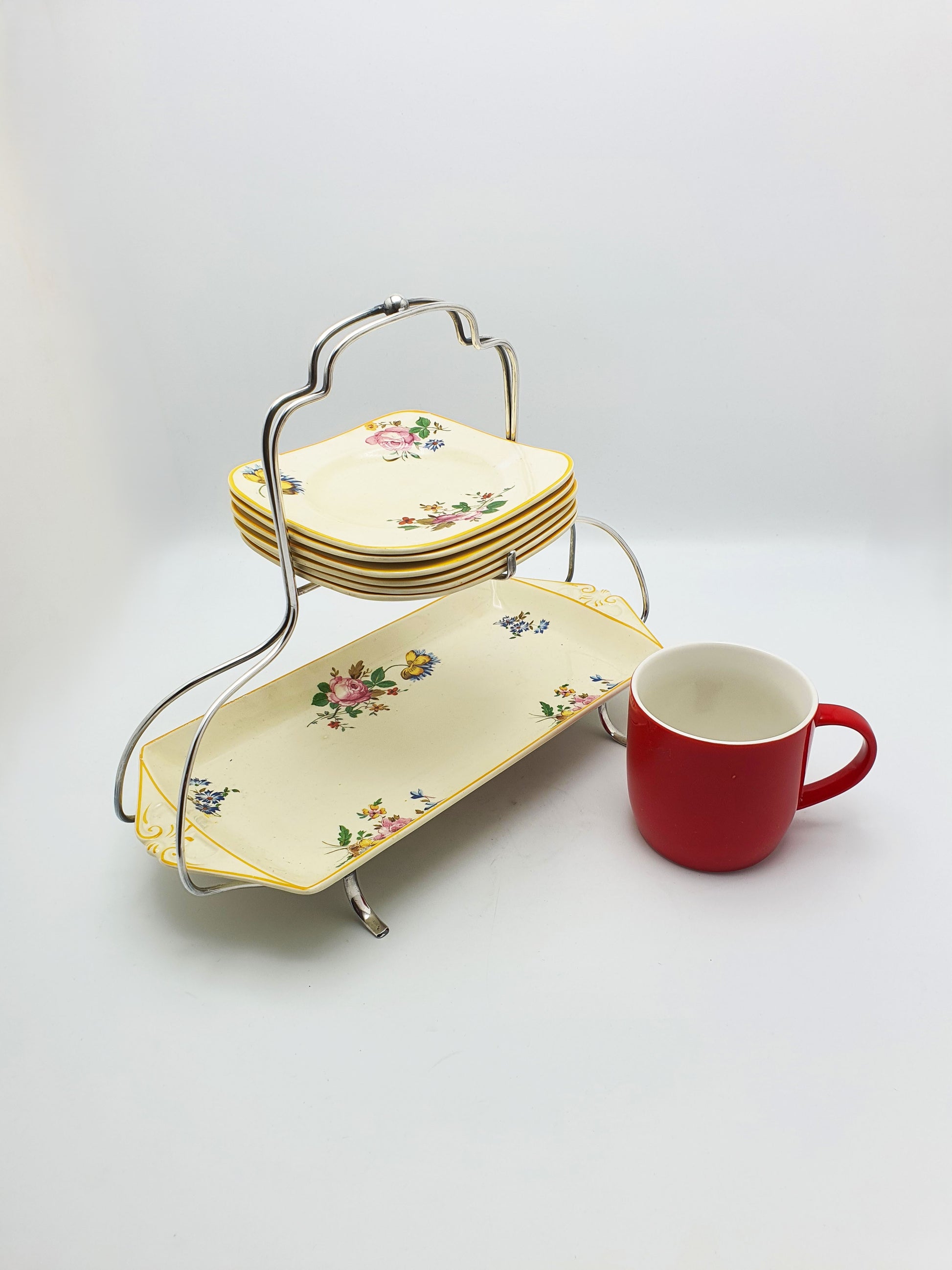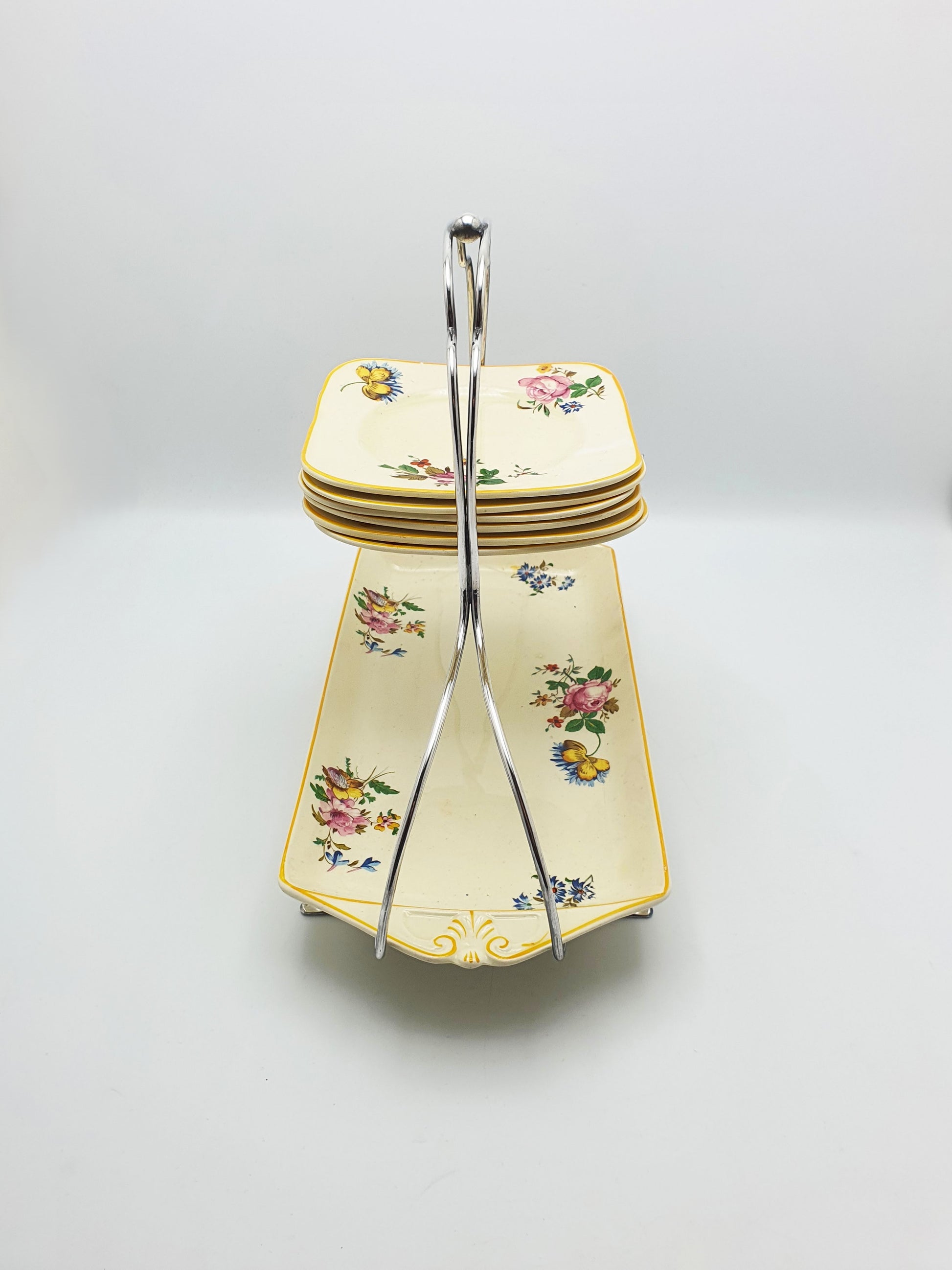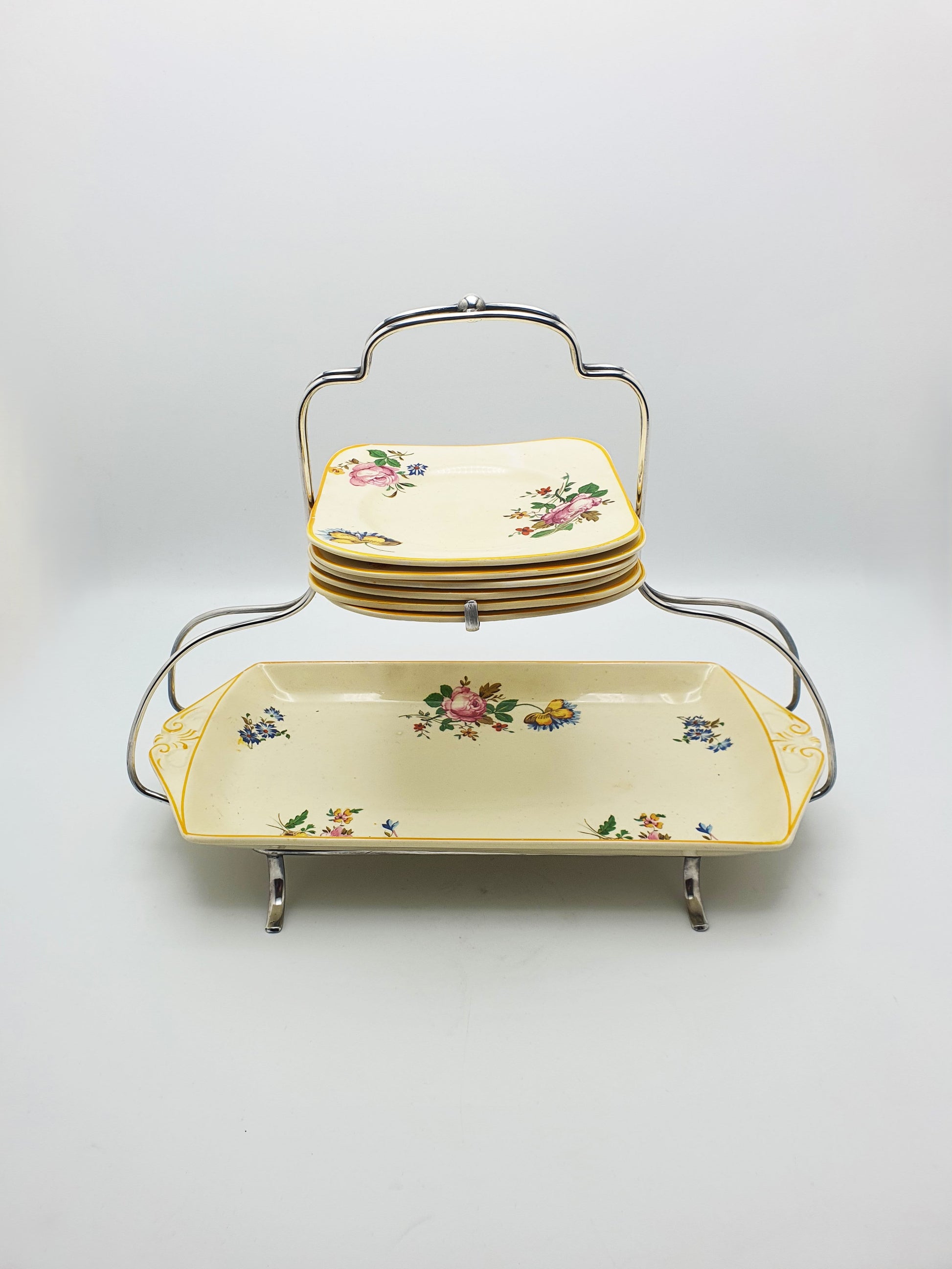 A Splendid Woods Ivory Ware Floral Sandwich Set featuring a large rectangular sandwich tray and six matching side plates, this set is beautifully presented on a silver-plated two-tier stand. Each ceramic piece is adorned with vibrant floral sprays, bordered with cheerful yellow rims - a classic expression of English pottery design – circa 1930.