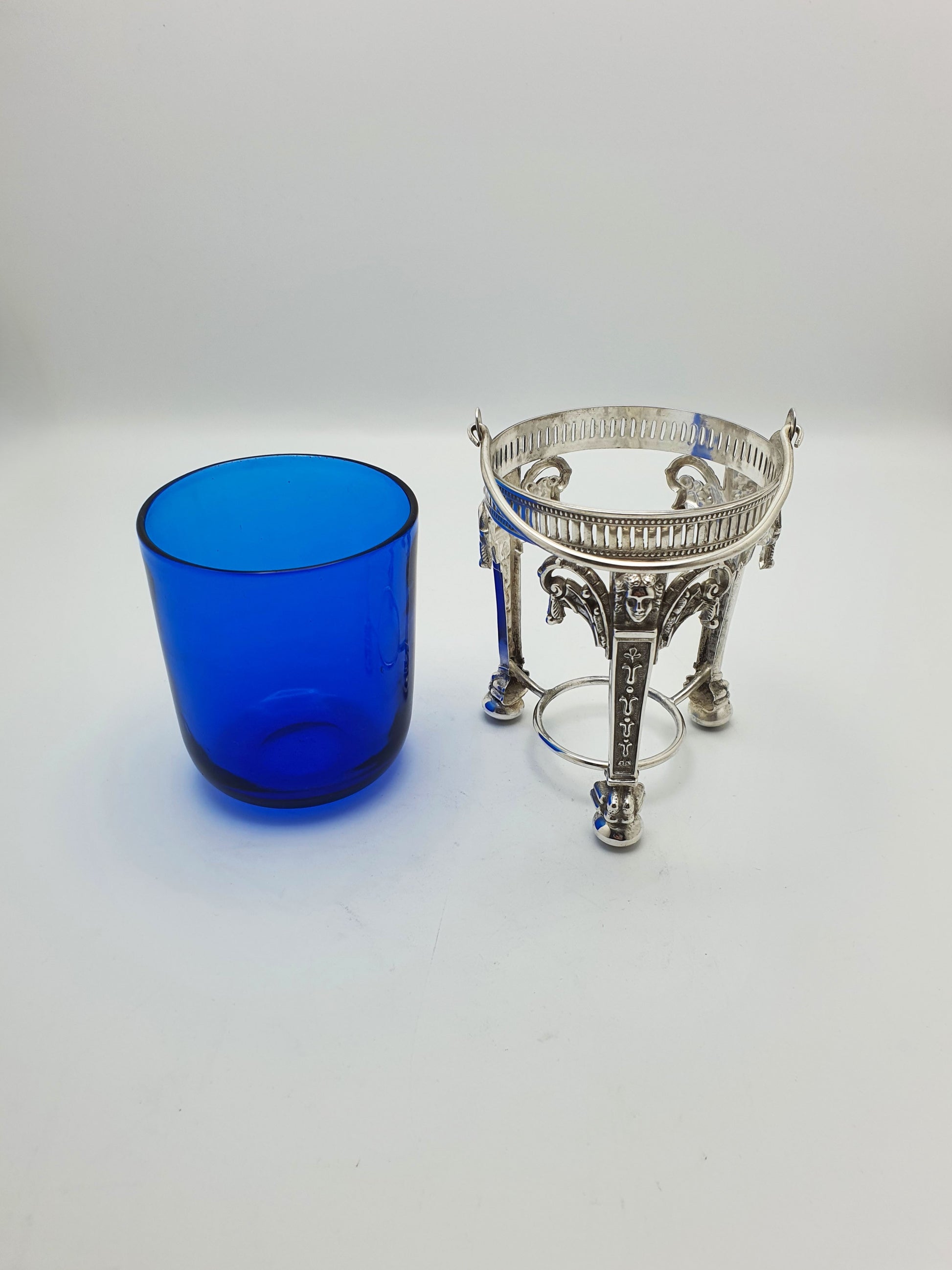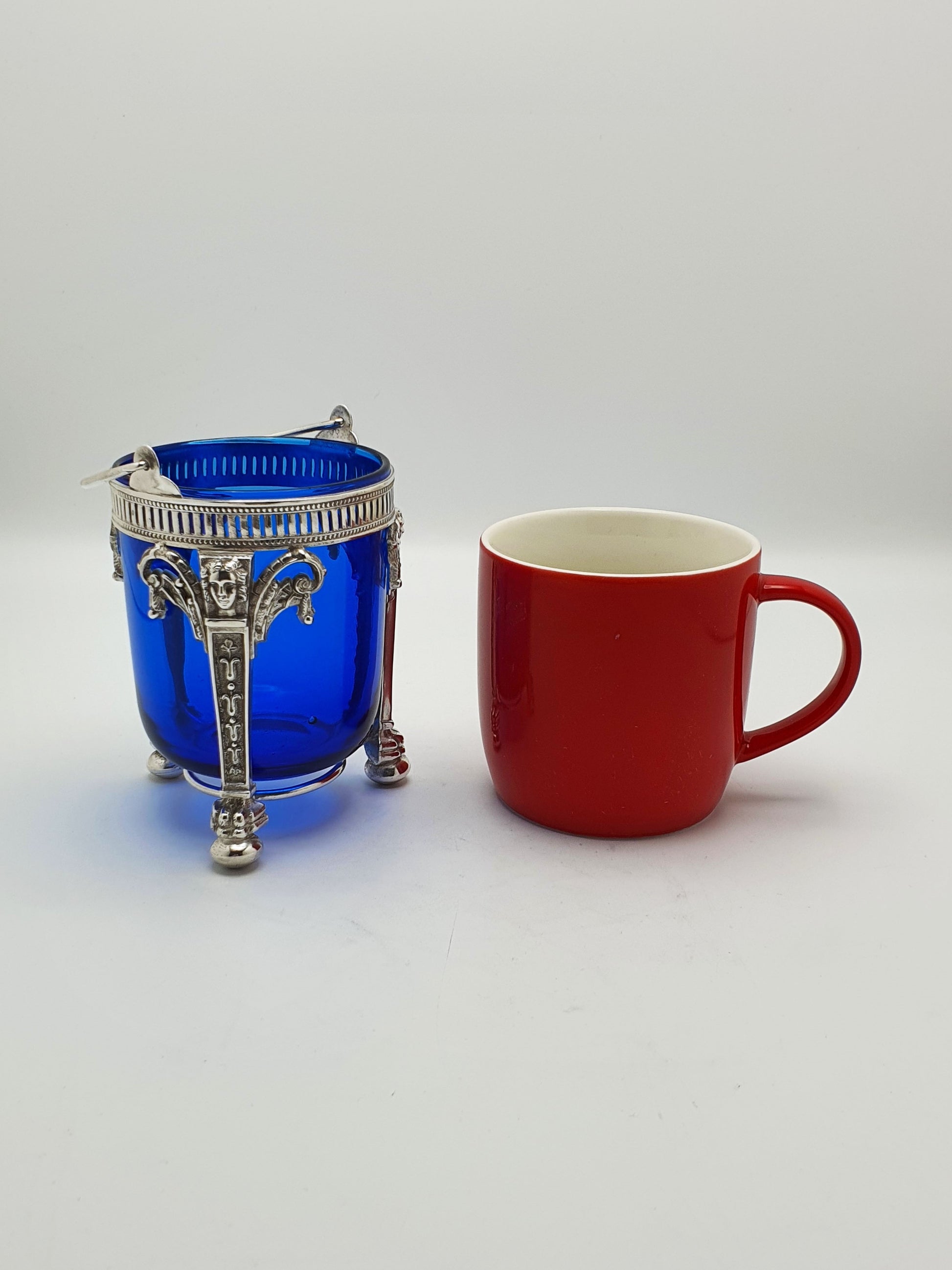 A Striking Antique Victorian Silver-Plated Sugar Bowl combining neoclassical grandeur with the rich colour of cobalt glass. The ornate frame features classical masks, scrolls, and beaded detail, supported by paw-and-ball style feet. The removable cobalt blue glass liner adds a jewel-like depth while also protecting the silver plate – circa 1890.
