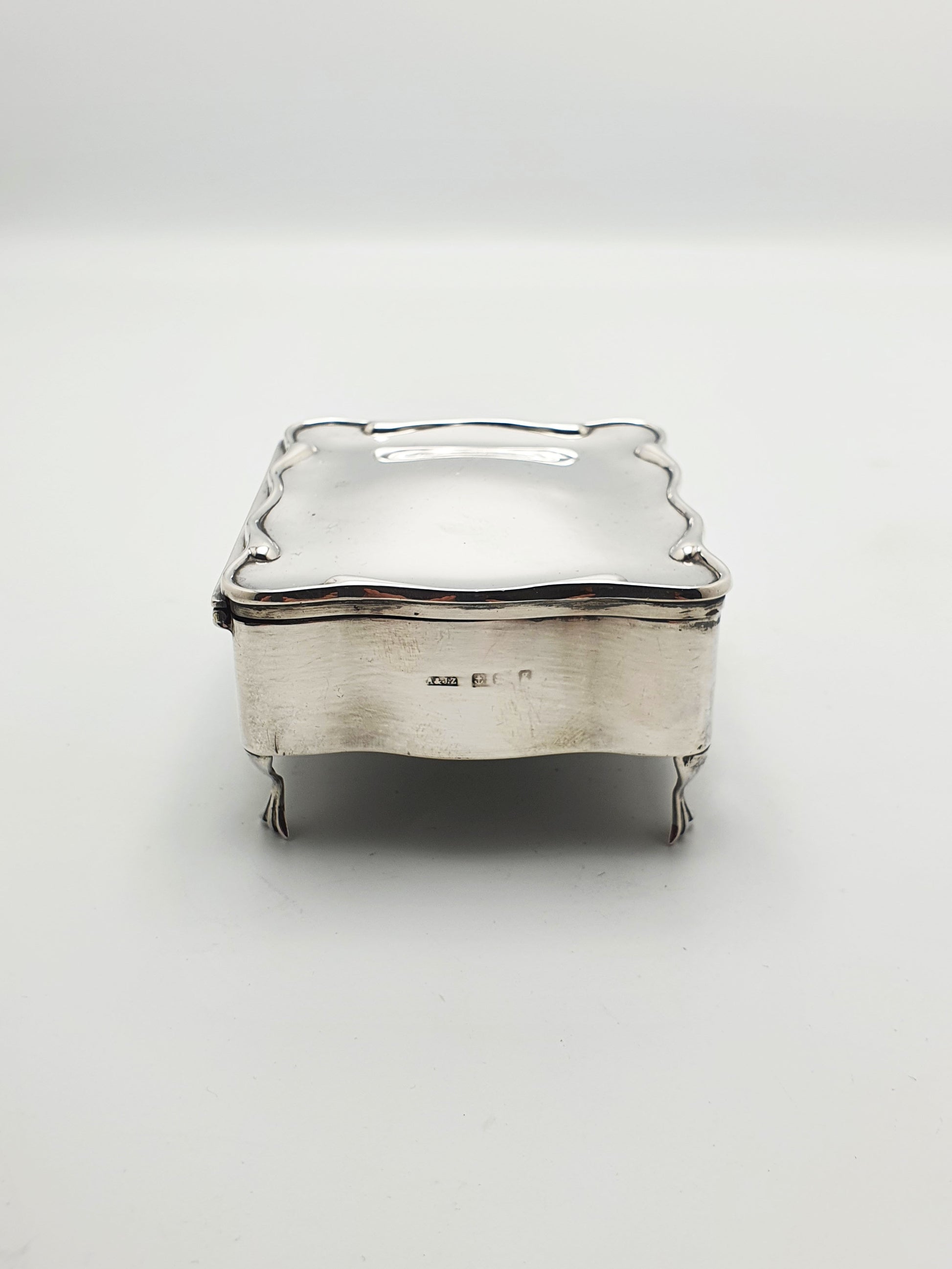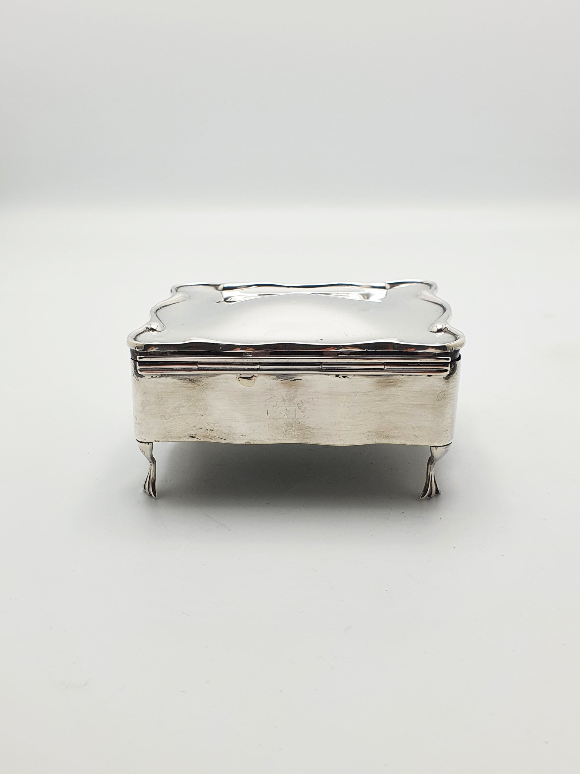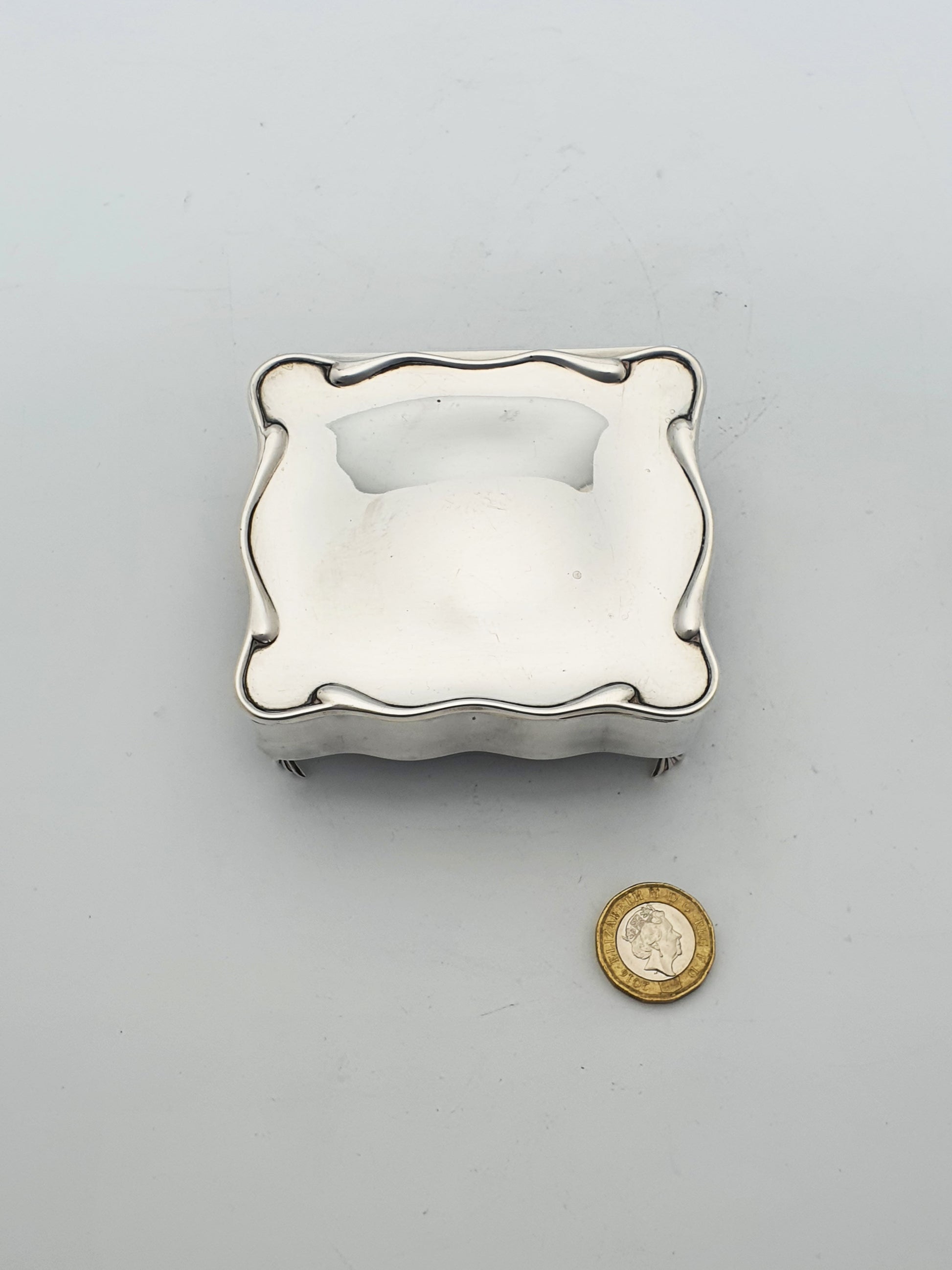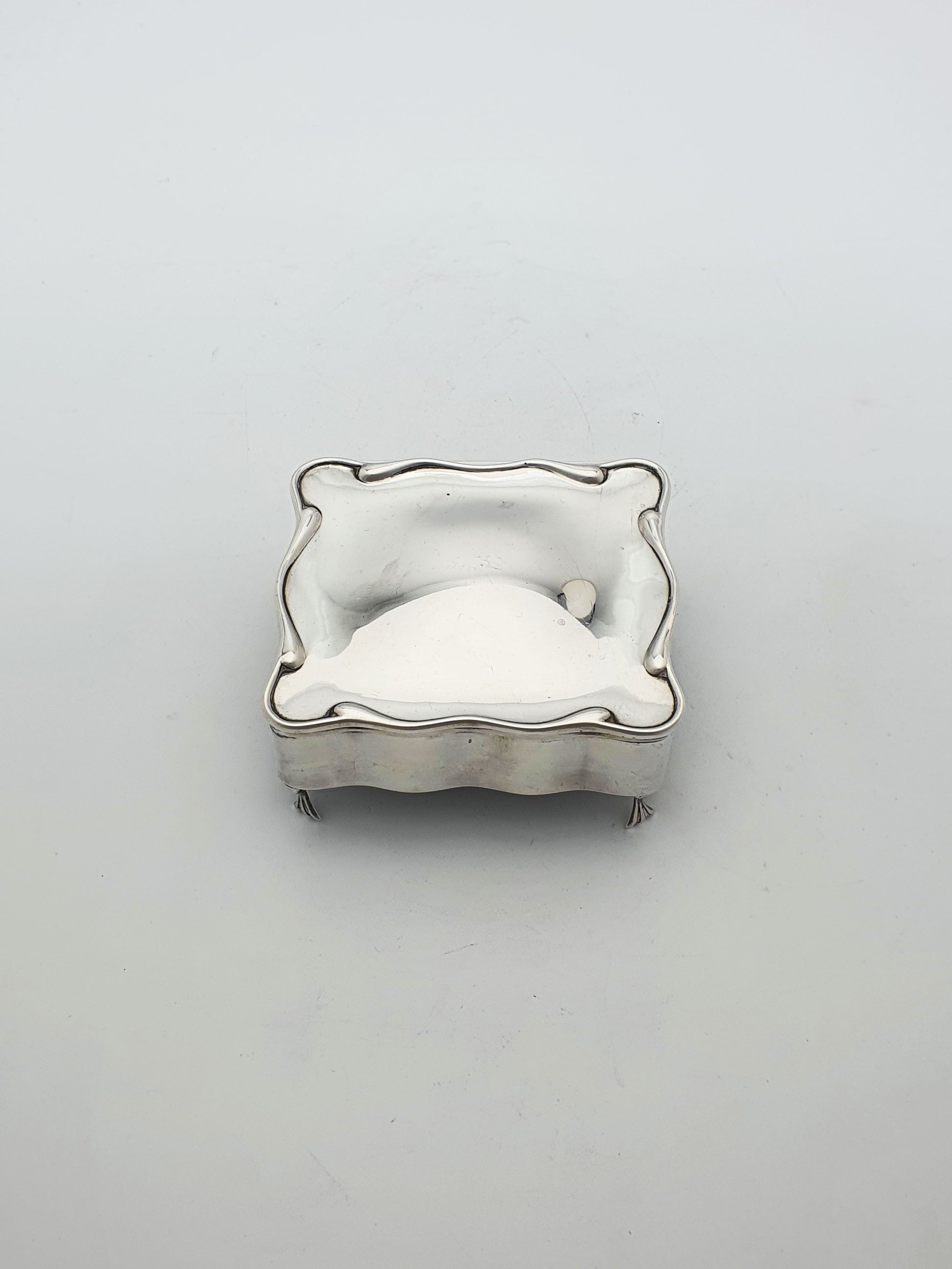A Stunning Antique Edwardian Sterling Silver Jewellery Box featuring a wavy, serpentine form with scalloped edges and standing on four fluted feet, it opens to reveal a plush red velvet-lined interior - perfect for storing rings, brooches, or other small treasures. Hallmarked for Birmingham, 1906.