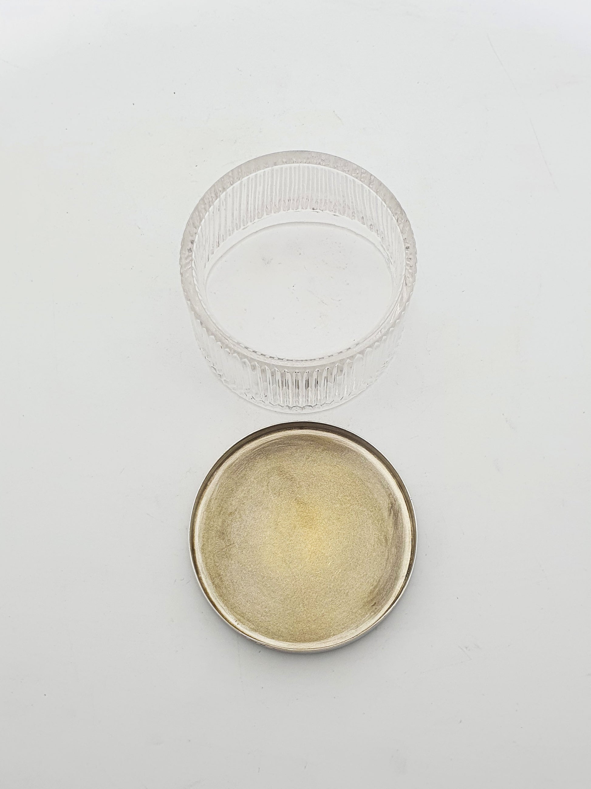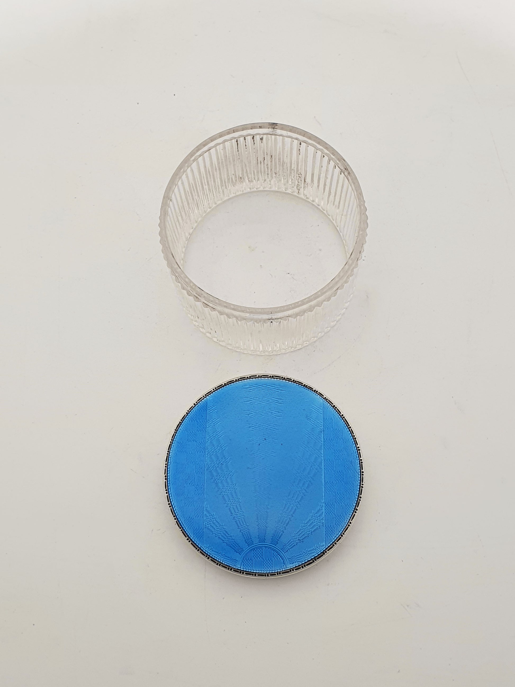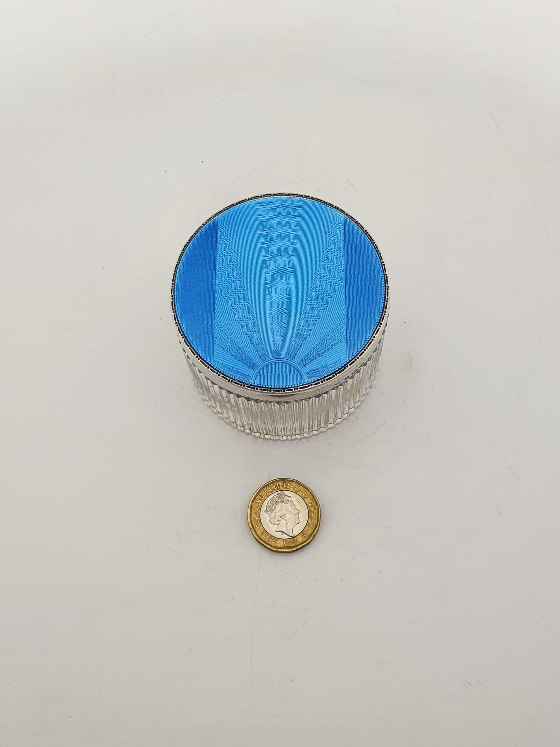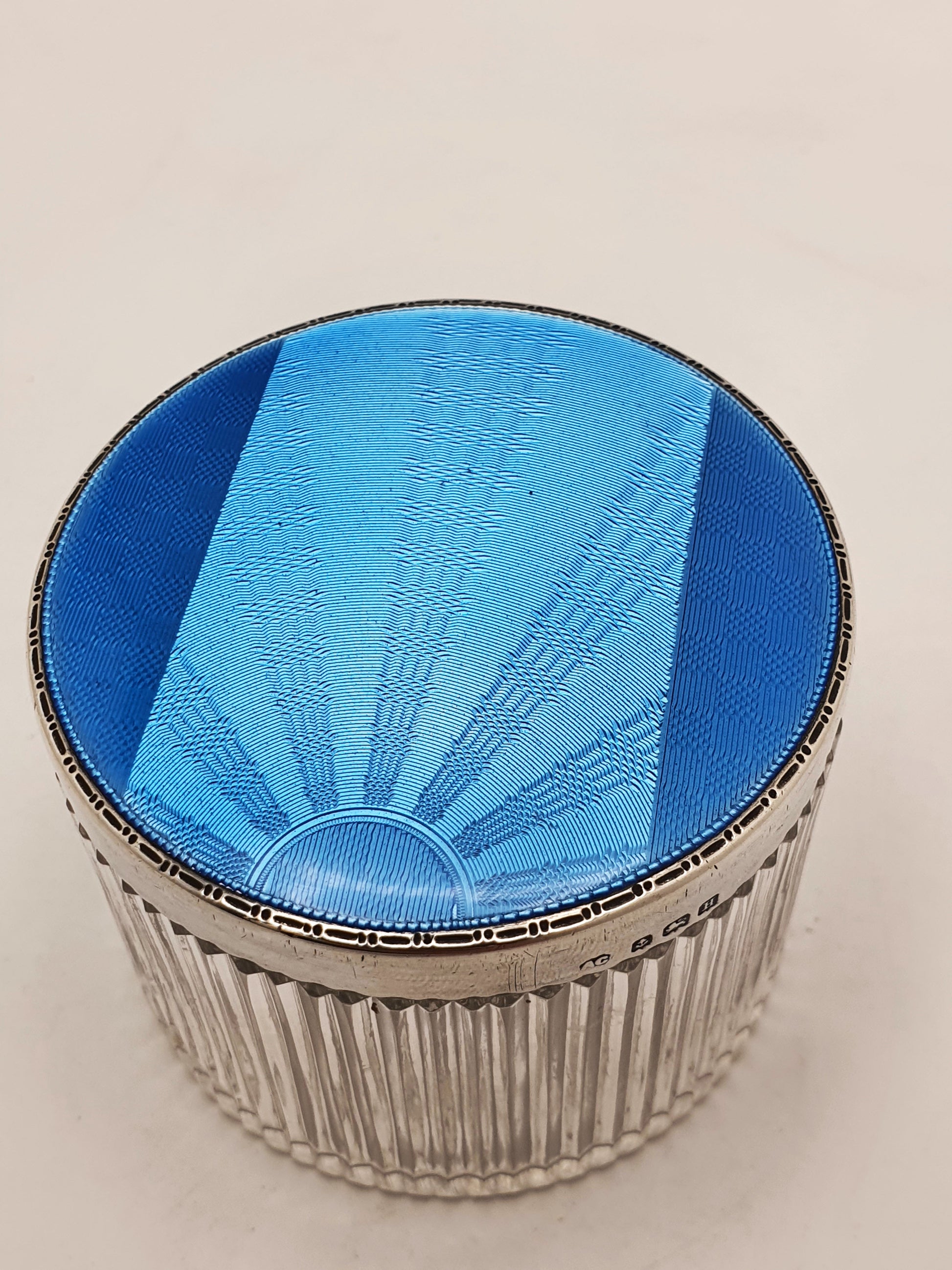 A Stunning Art Deco Vanity Jar combining crisp cut glass with a vibrant blue guilloché enamel silver lid. The starburst guilloché pattern radiates from a central semicircle, giving the enamel top a hypnotic, almost optical effect when turned in the light. The vivid cerulean blue enamel is both striking and sophisticated, offering a pop of colour with true vintage glamour. The cut glass base features a vertical ribbed design, adding texture and light refraction that complements the precision of the enamel work above. Hallmarked for Birmingham, 1932.