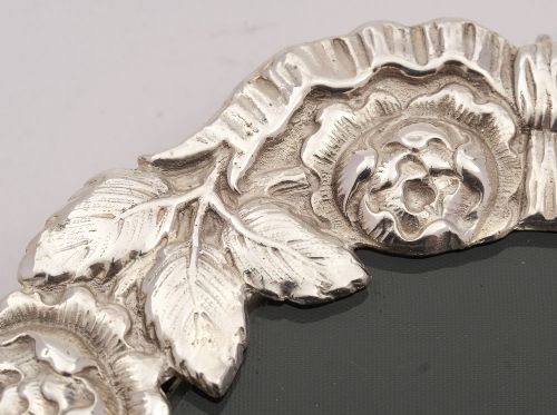 A stunning English Edwardian silver plated easel backed photo frame with embossed rose decoration. Circa 1905. FREE worldwide shipping. Measurements: Height: 7 1/2 (approx 19cm) Width: 5 3/4 (approx 14.5cm) Photo size: Height: 5 1/2 (approx 14cm) Length: 3 1/2 (approx 9cm) Weight: 320g In good condition - any dark areas are shadows from the photography there is no damage to the silver plate.