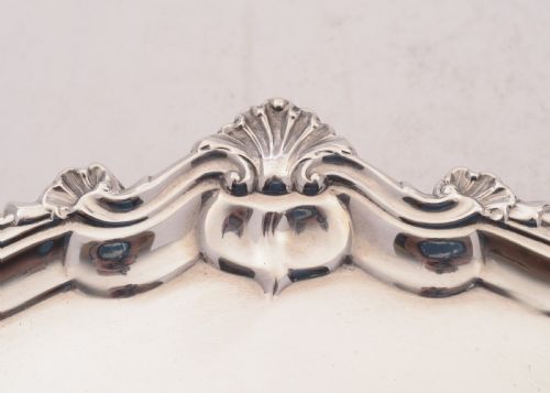 A stunning Edwardian solid silver salver/tray. Has lovely pie crust edge with shell motif and stands on three scroll feet. Made by the renowned maker William Hutton & Sons and hallmarked London 1905. FREE Worldwide delivery Measurements; Height 1 1/4 ( approx 3.13 cm ) Diameter 10 1/2 ( approx 26.25 cm ) Weight 612 g - approx 19.7 troy ozs In good condition- any dark areas are from the photography - there is no damage to the silver