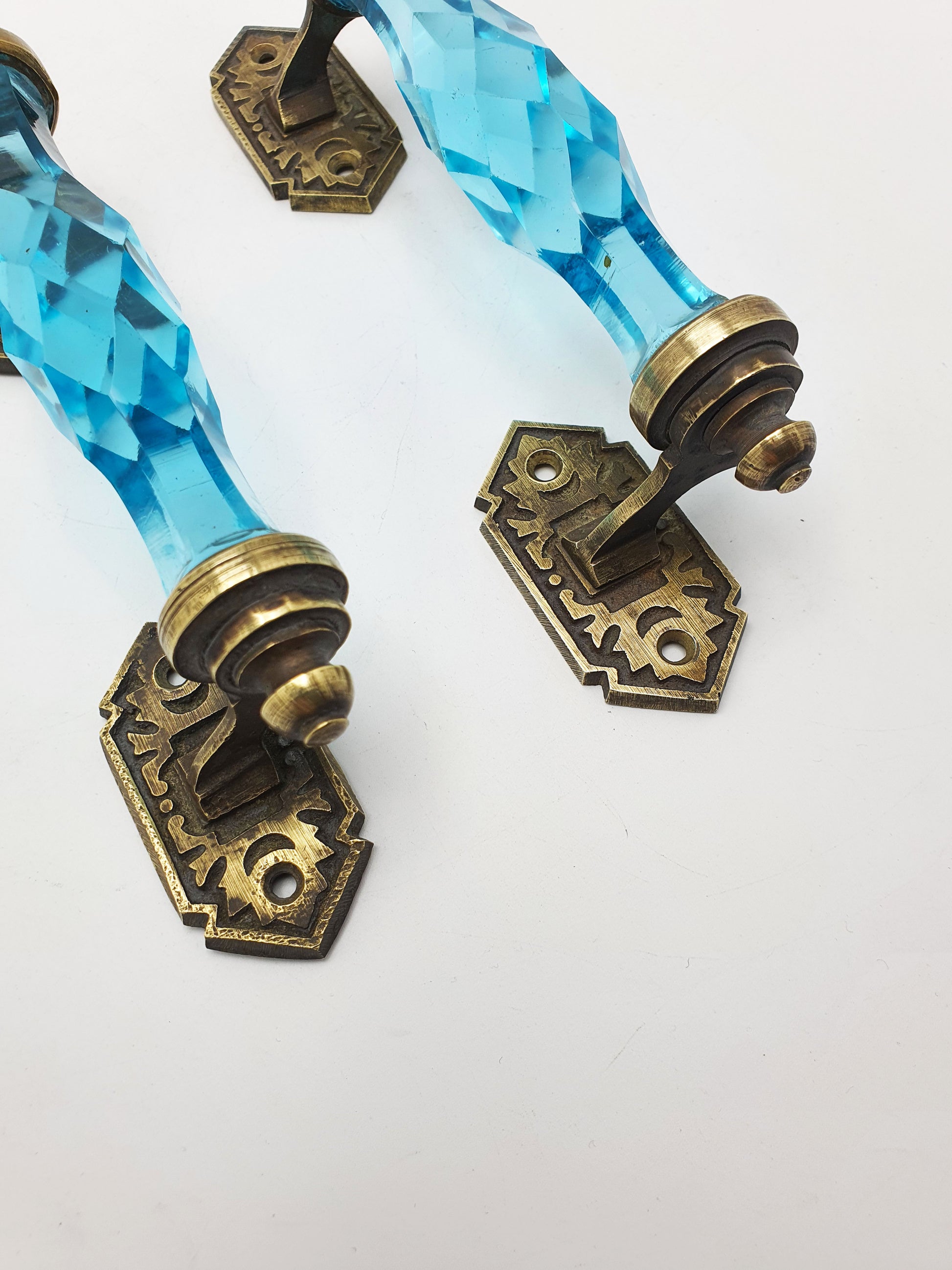 A Really Stunning Pair of Antique Door Handles featuring brilliantly faceted blue cut glass handles and intricately detailed brass mounts, these pieces beautifully combine function with decorative elegance.