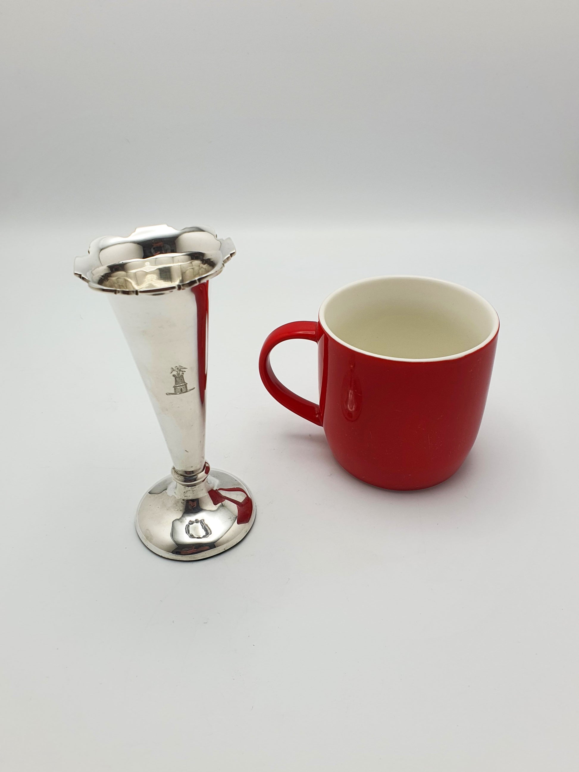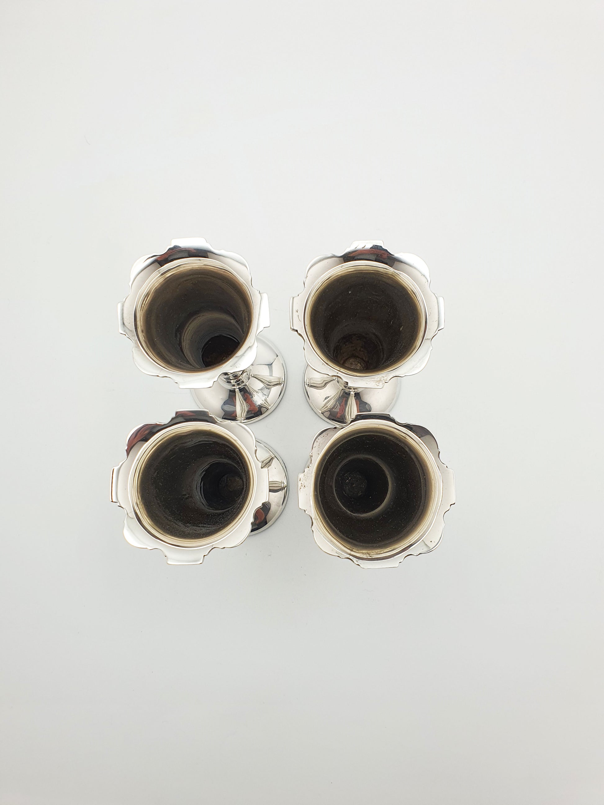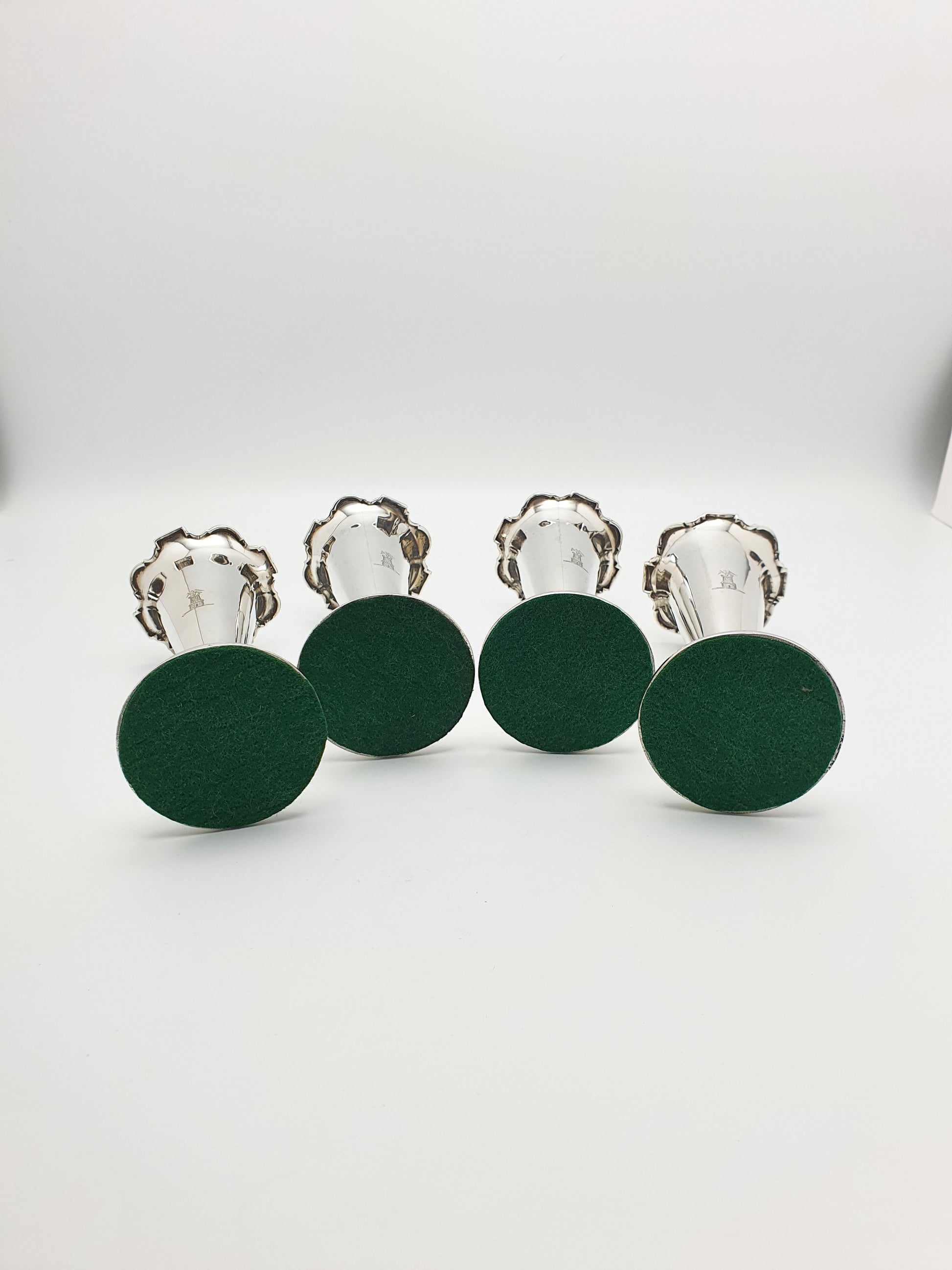 A Stunning Set of Four Antique Edwardian Silver Bud Vases featuring a gently flared trumpet form, scalloped rim, and weighted circular pedestal bases - making them ideal for displaying single blooms or petite floral arrangements. This set of four is decorated with a family crest of a castle folly with a bird standing atop the ramparts. Hallmarked for Birmingham, 1908.